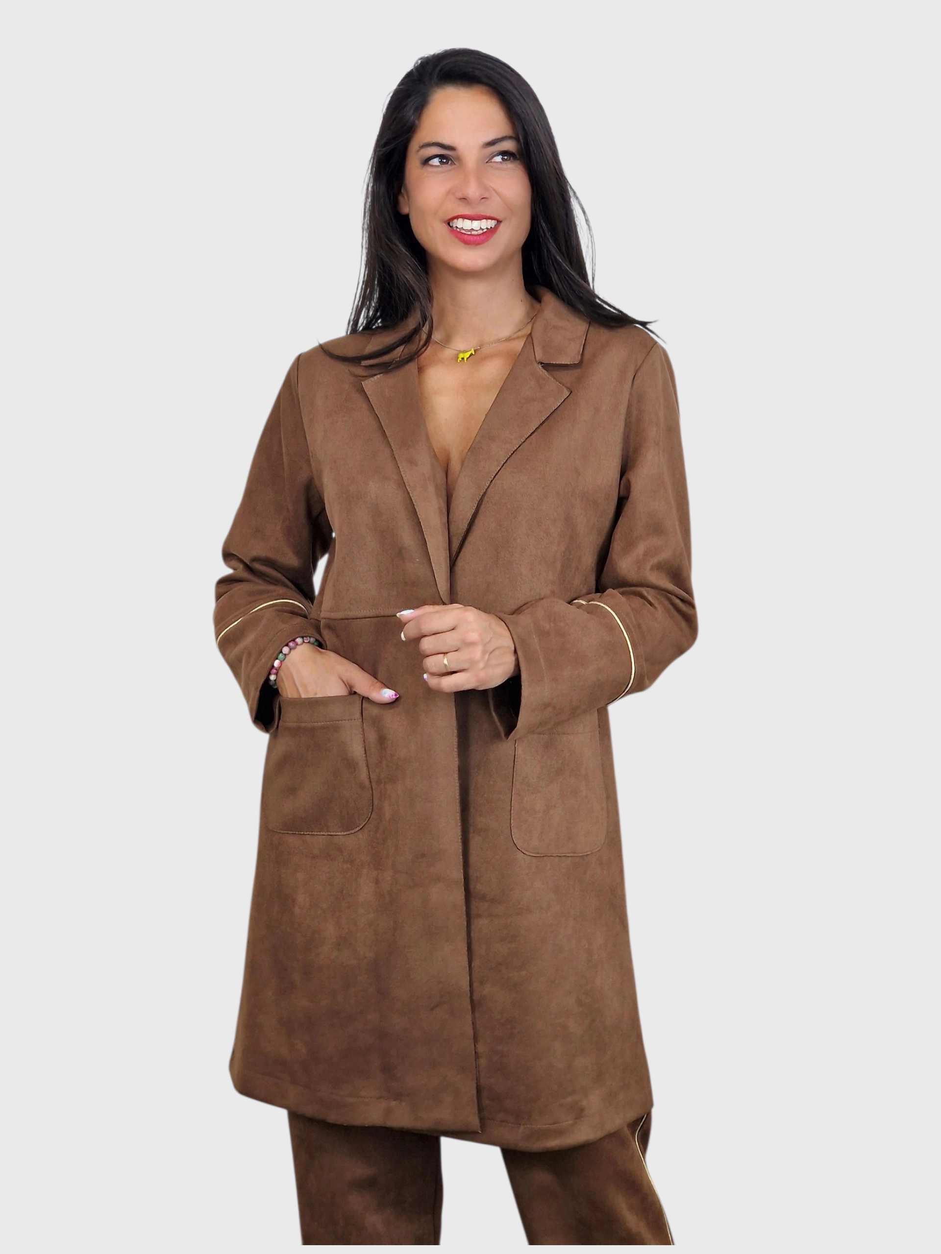 Abrigo de antelina midi, con cordón dorado en las mangas y bolsillos. A juego con sudadera, chaqueta y pantalón. Disponible en marrón y color hielo.