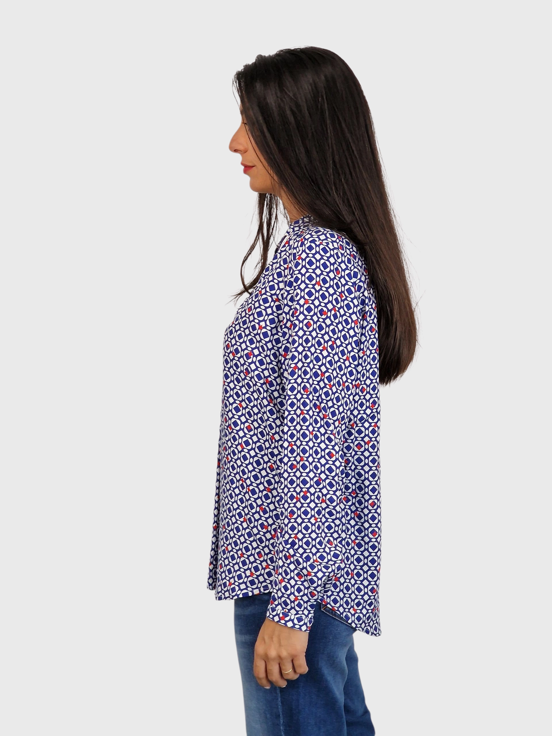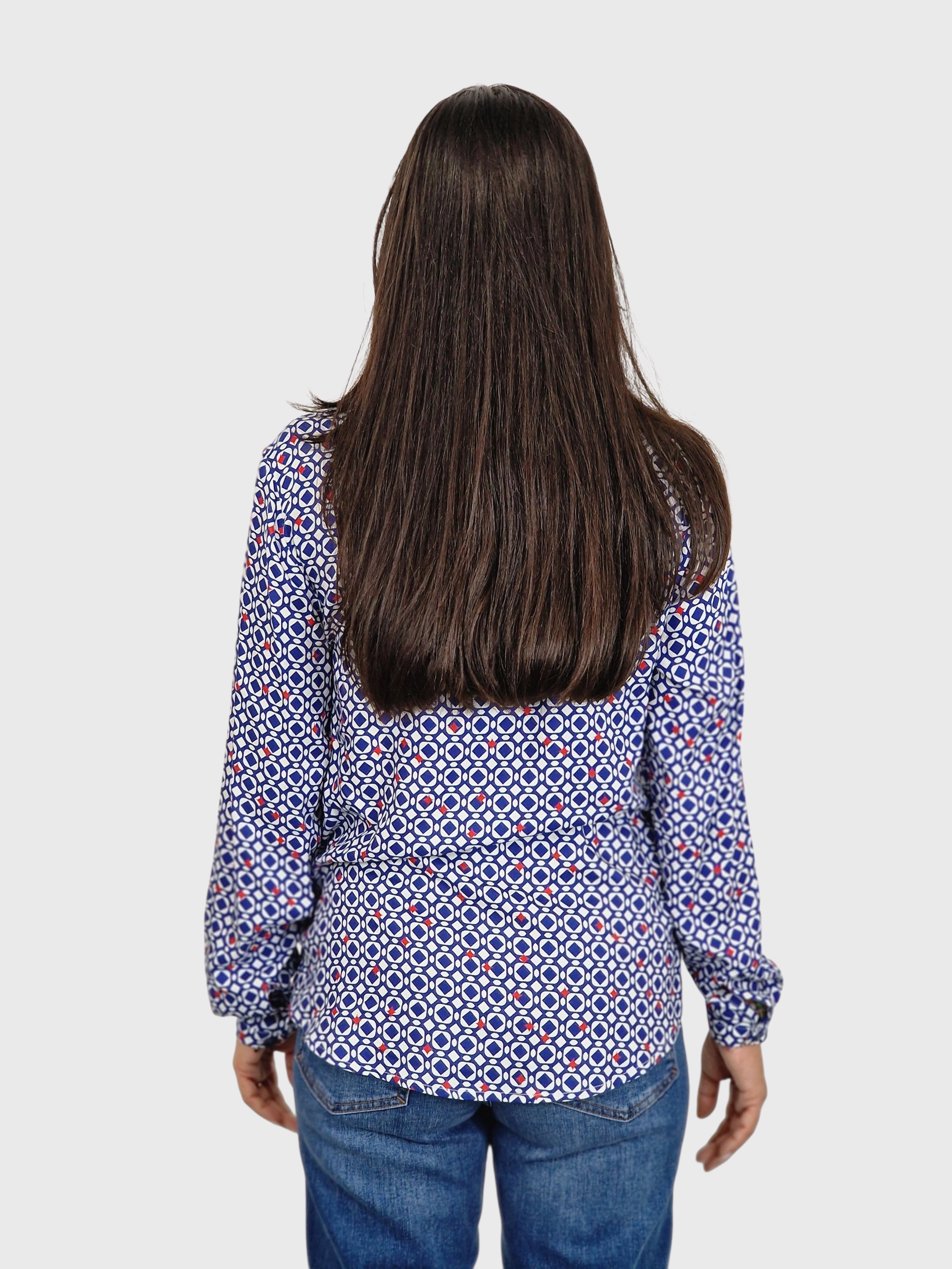Blusa abotonaada con cuello camisero estampada en tonos azules.