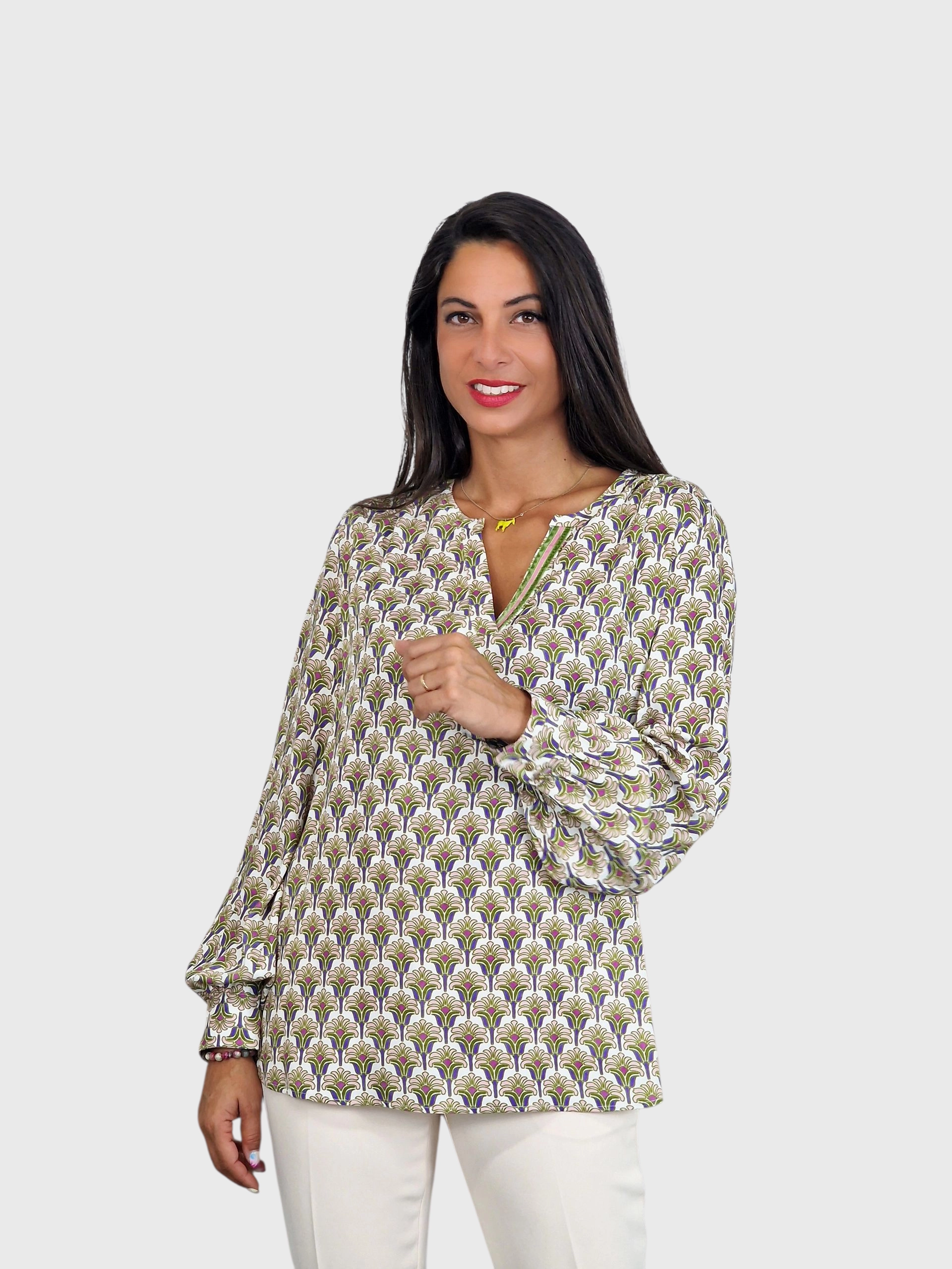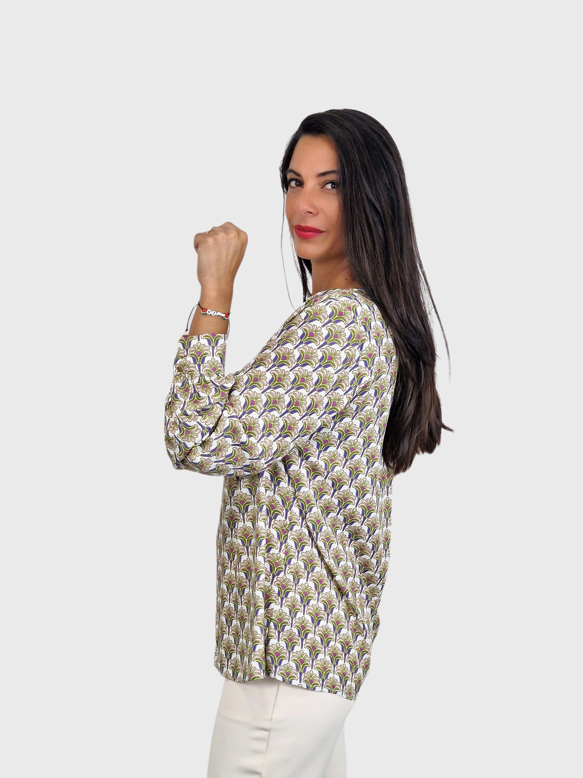 Blusa de manga de larga con opción de ponerla de manga orta. Cuello pico, abotonada y con estampado en verdes.