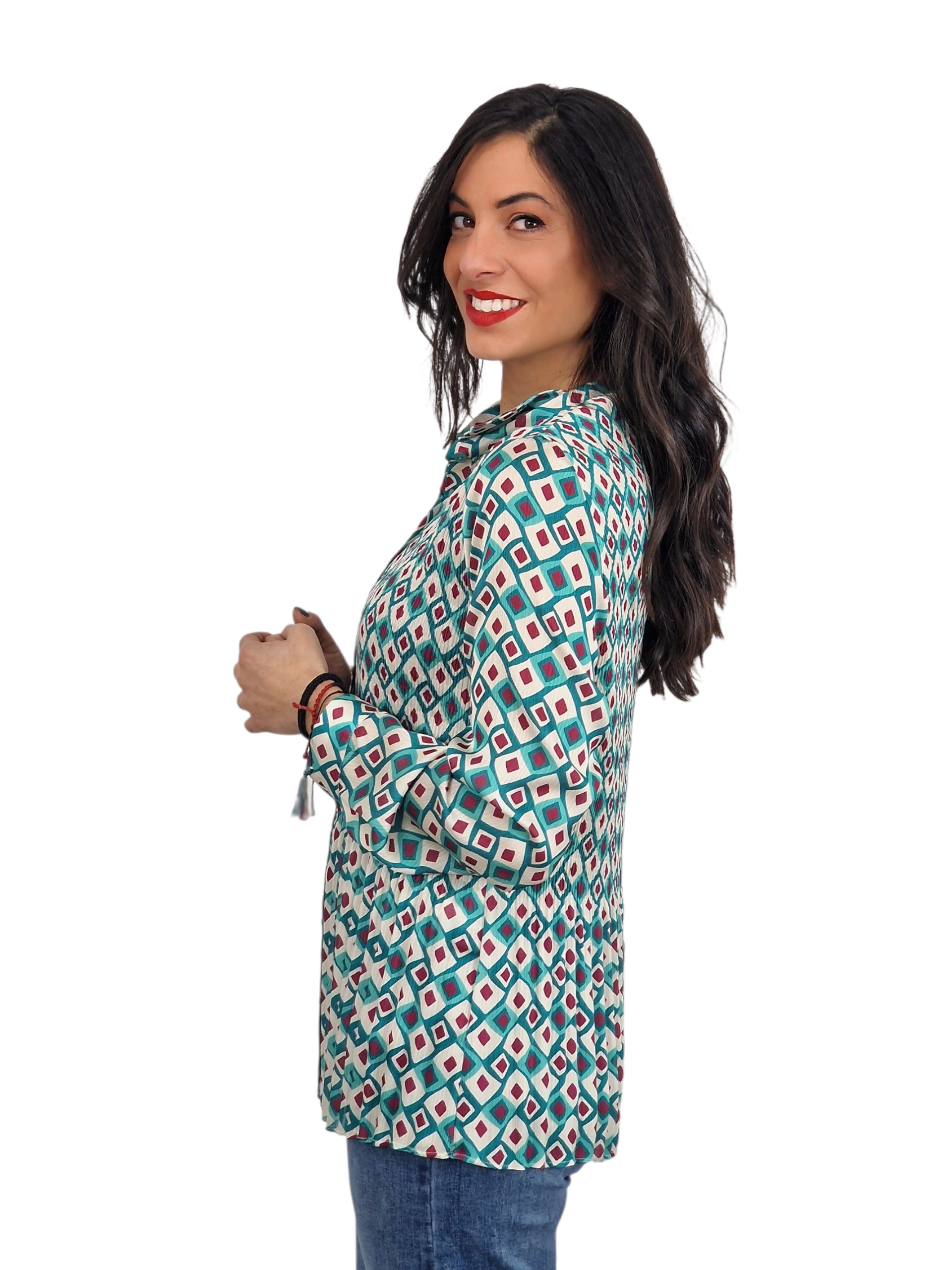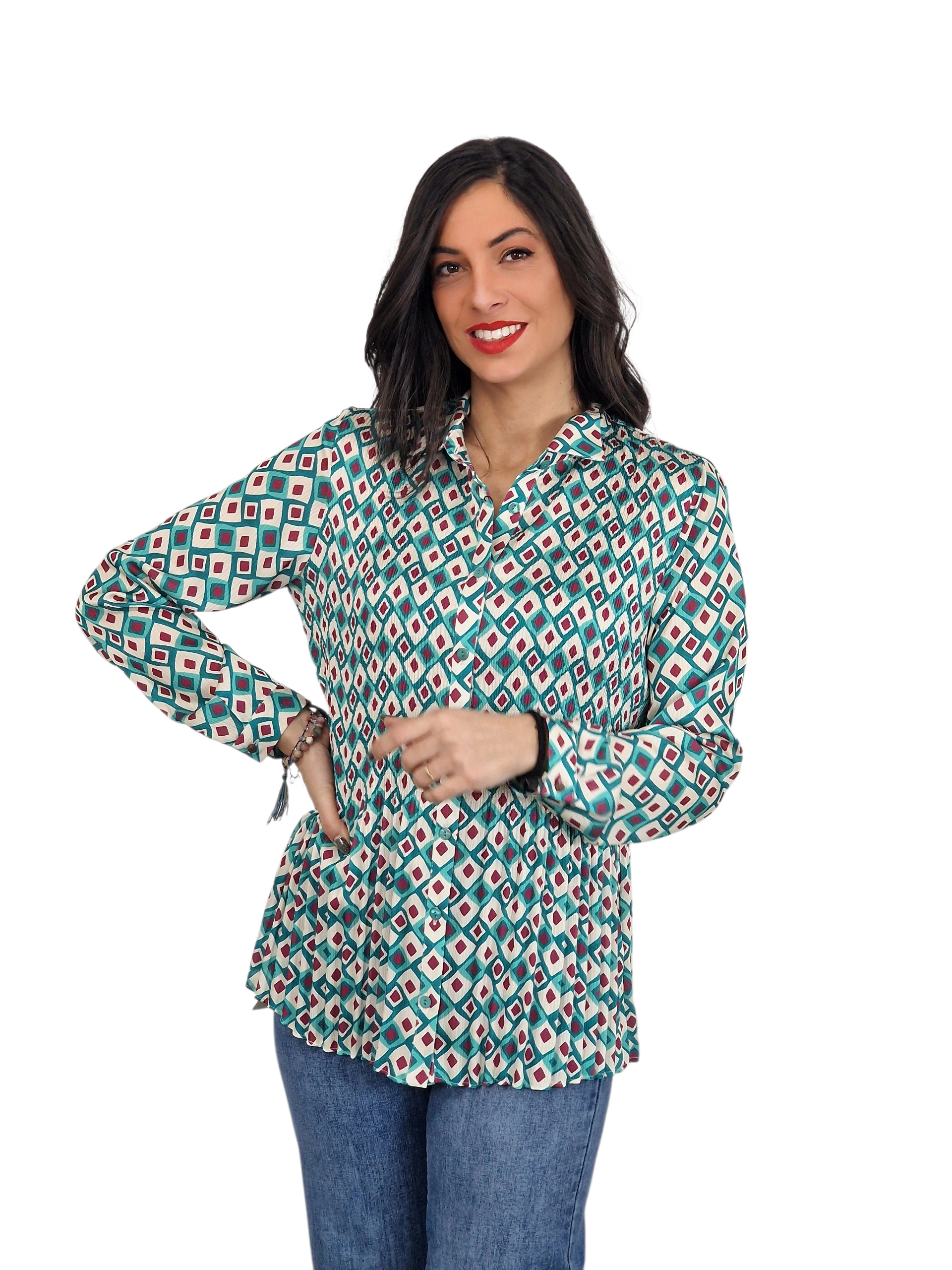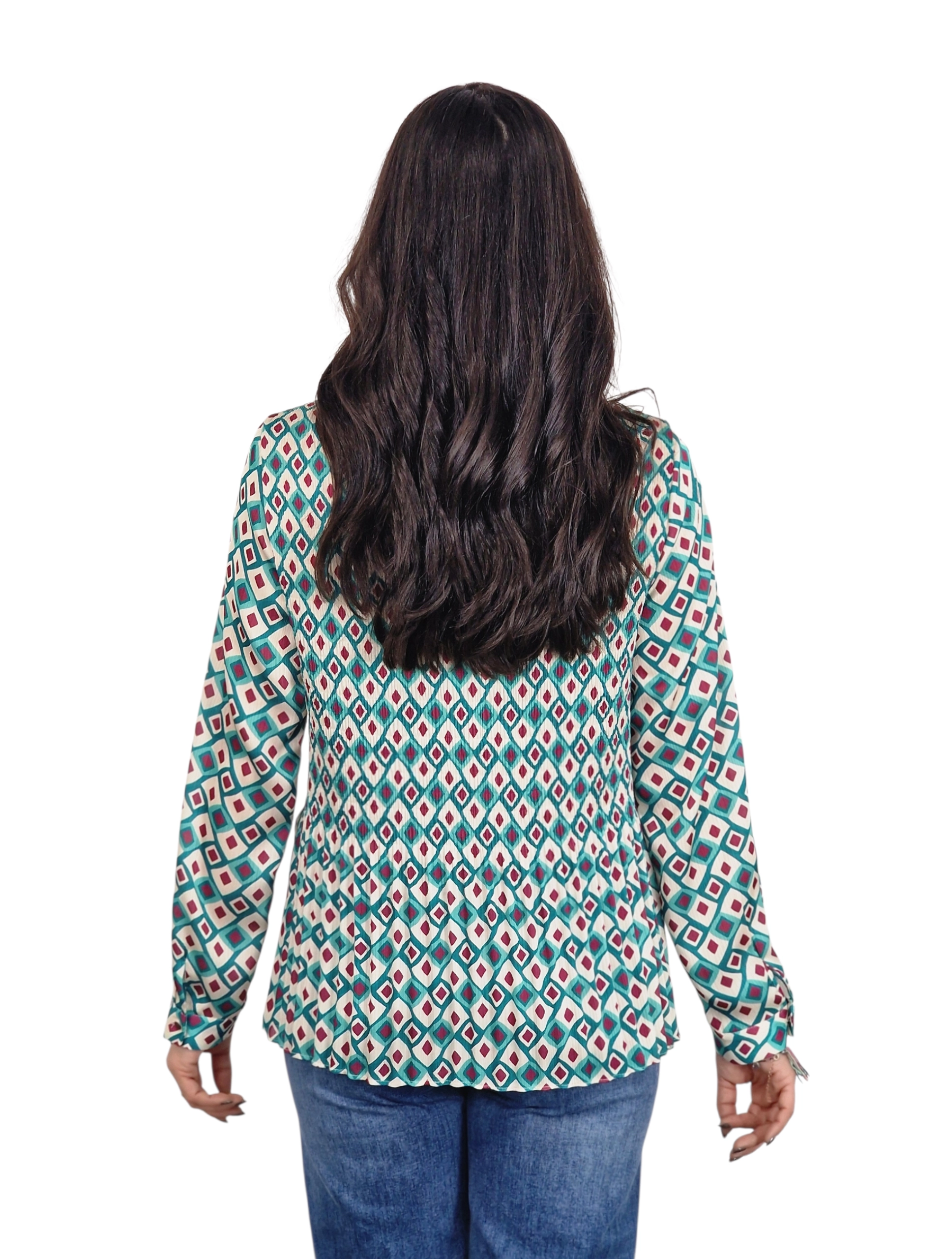 Blusa con tejido plisado, de manga larga y estampado geométrico. Disponible en coral y verde.