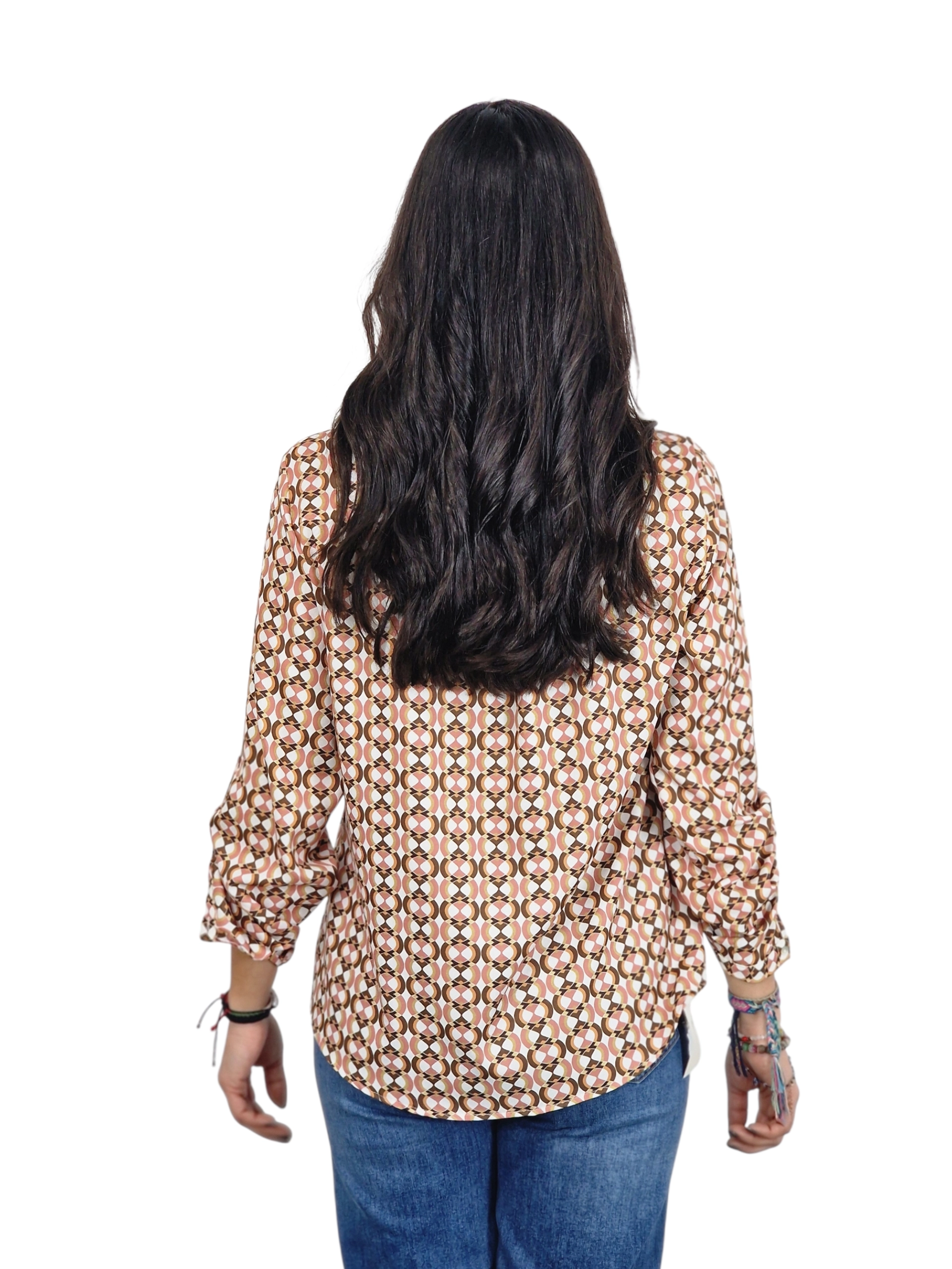 Blusa abotonada con cuellos camiseros.Fodo marroŽn claro con estampados circulares rosados.