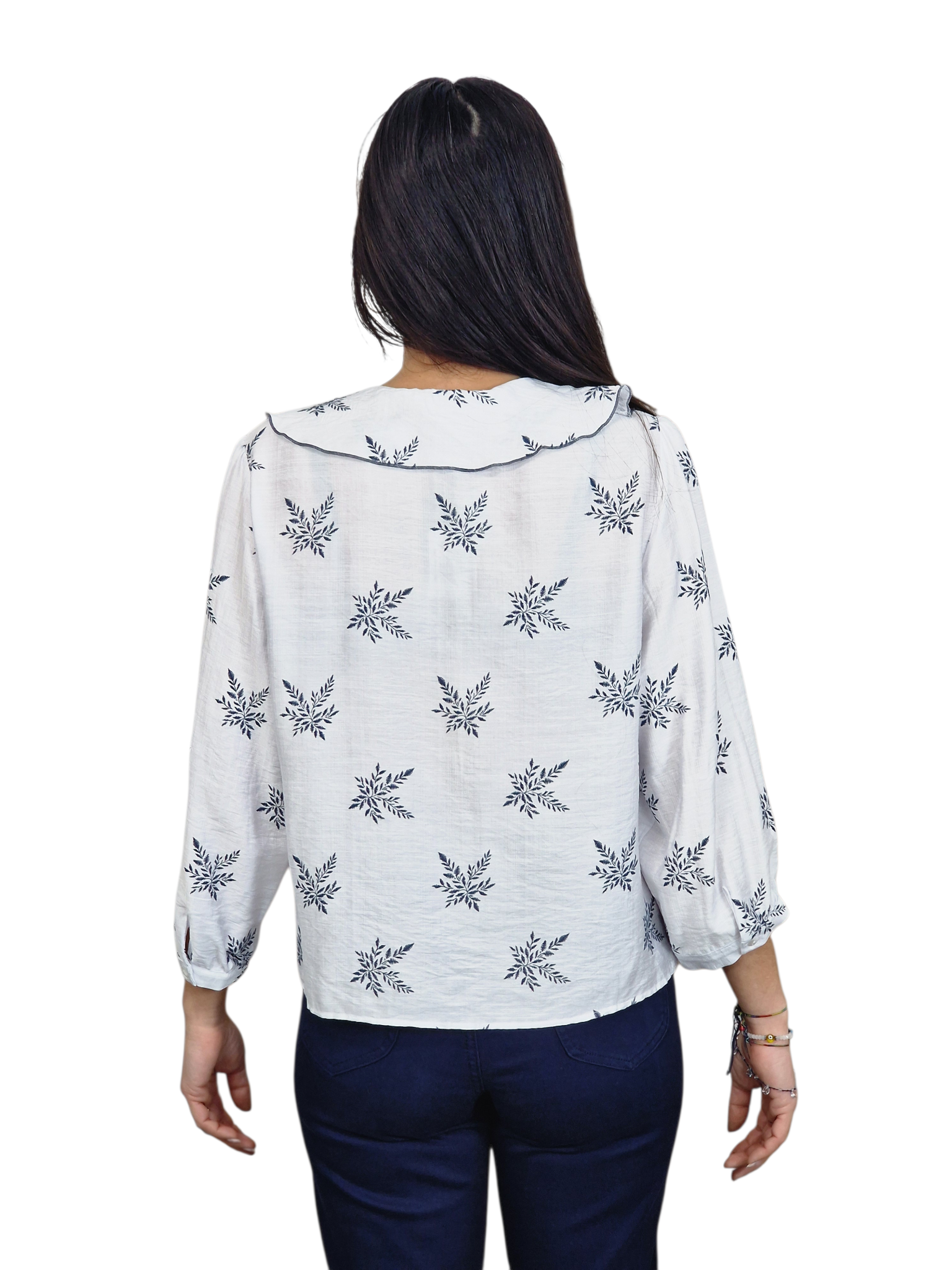 Blusa con volante en el cuello, estampada con bordados y manga francesa.