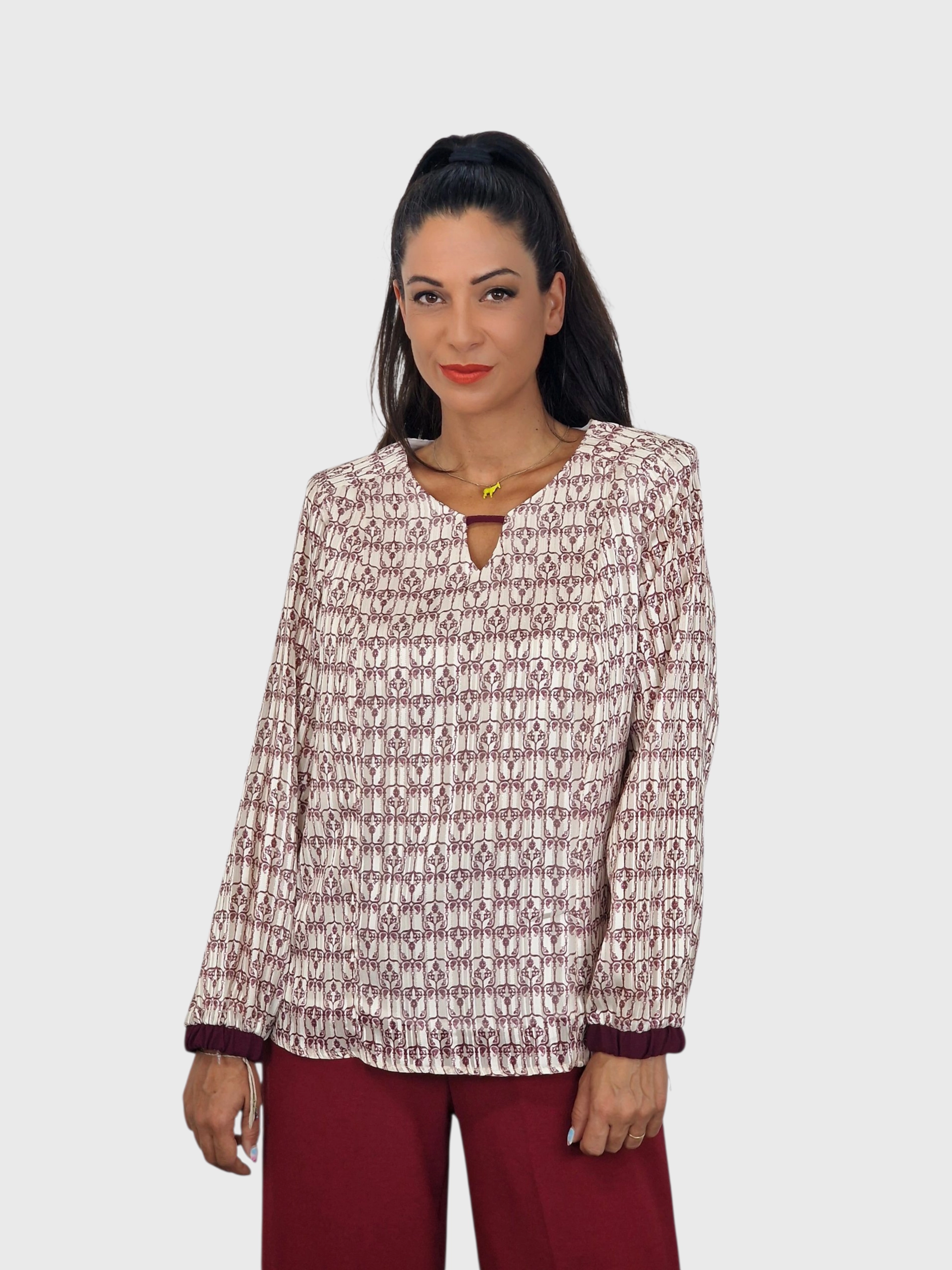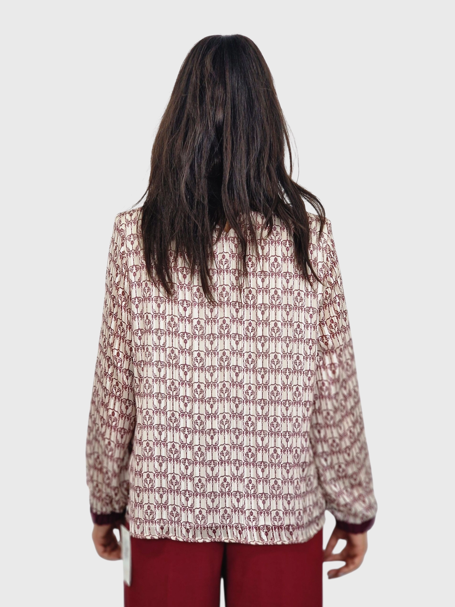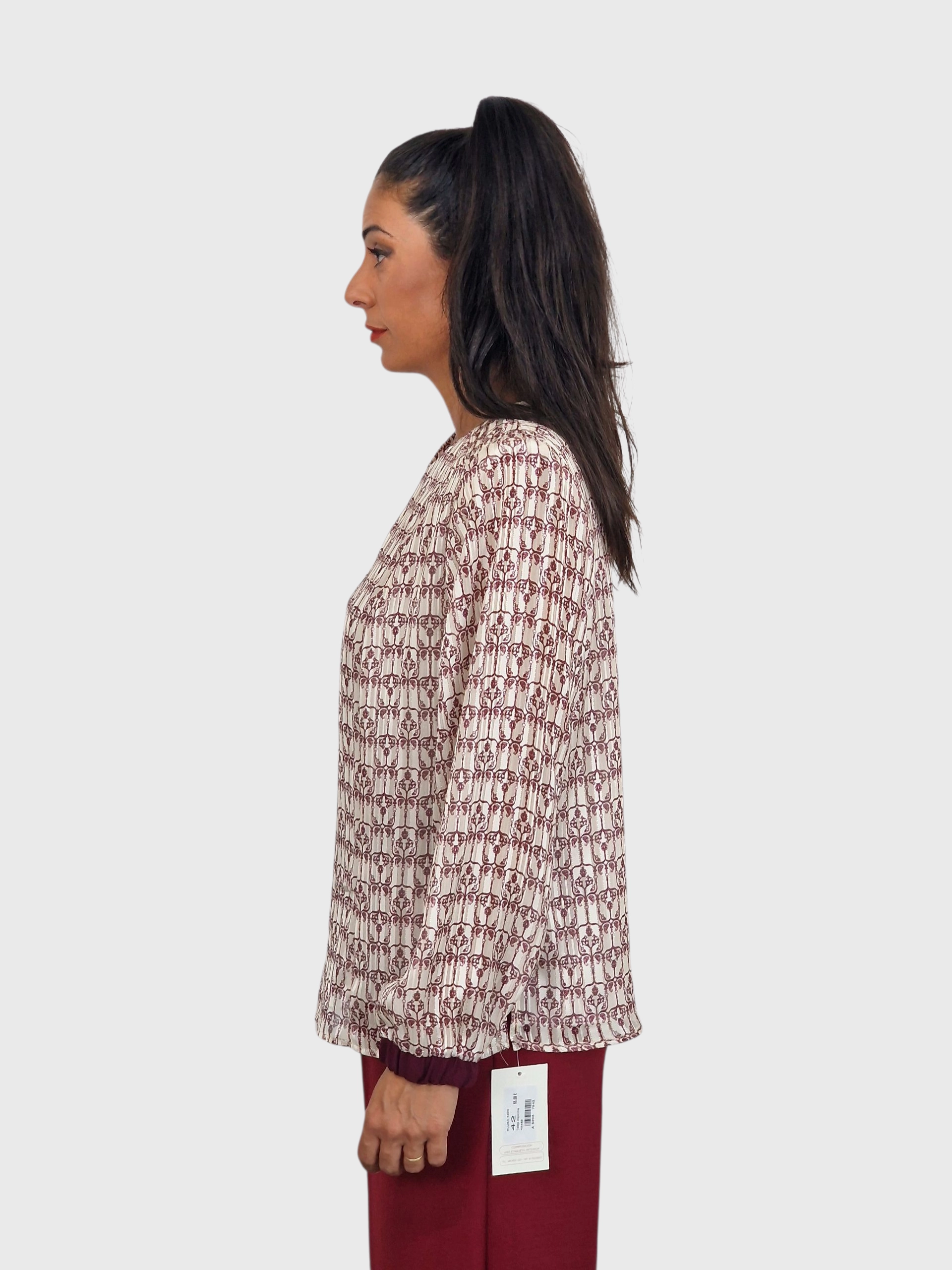 Blusa de manga larga con fondo color crema y estampado en color pruma, granate.