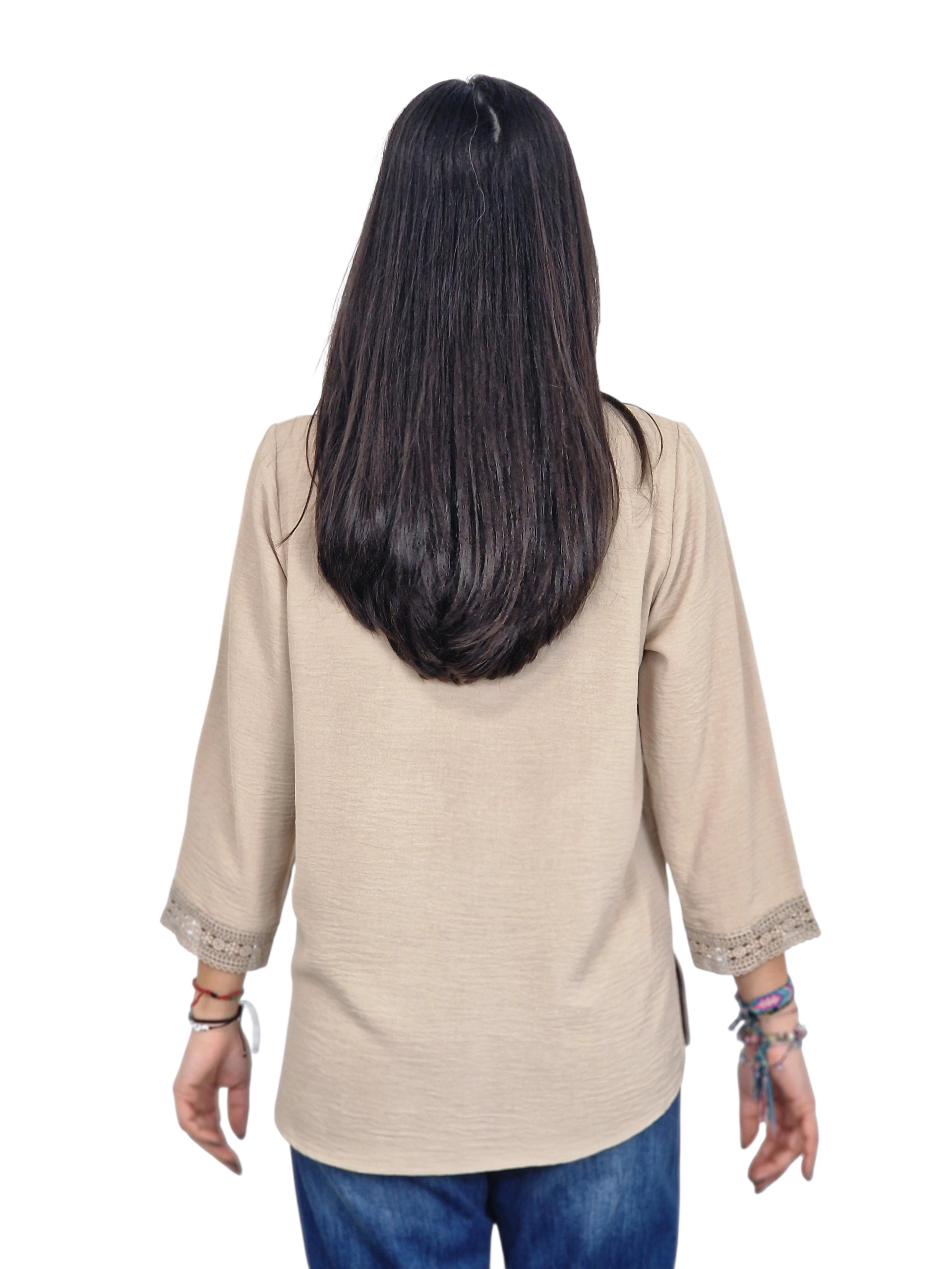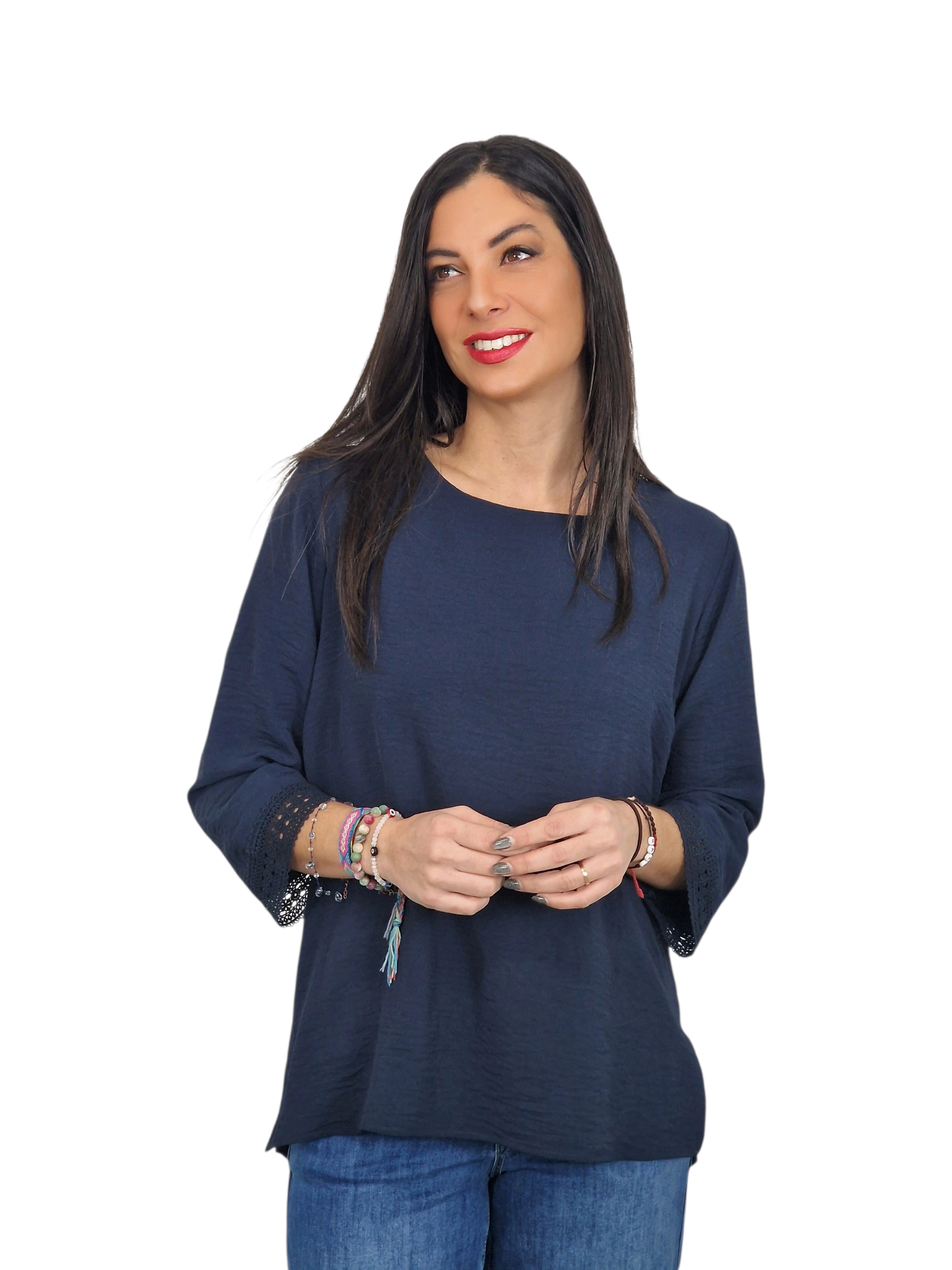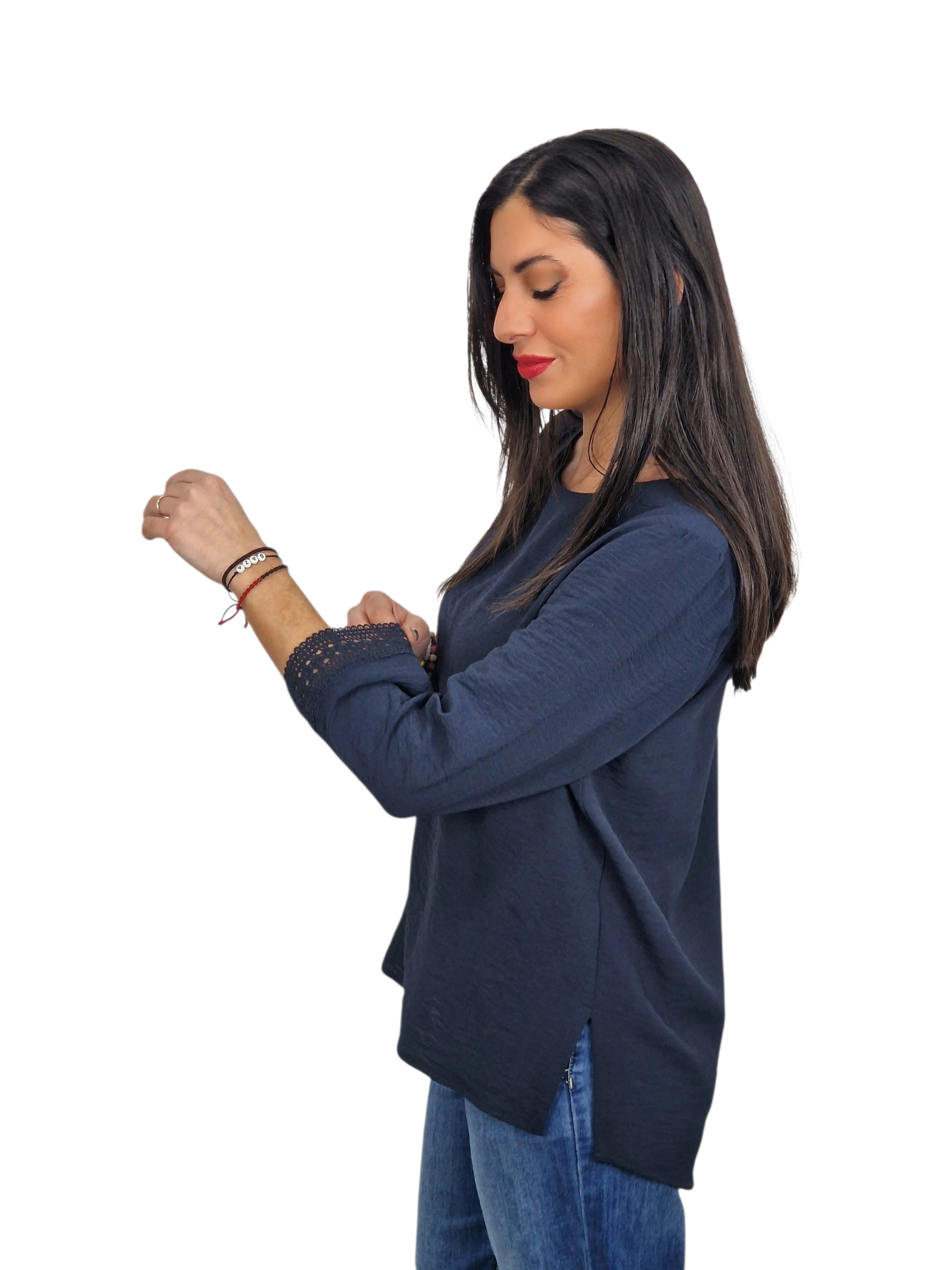 Blusa con cuello redondo y manga francesa adornada con puntilla. Disponible en marino, verde kaki, crudo, arena, tabaco y negro.