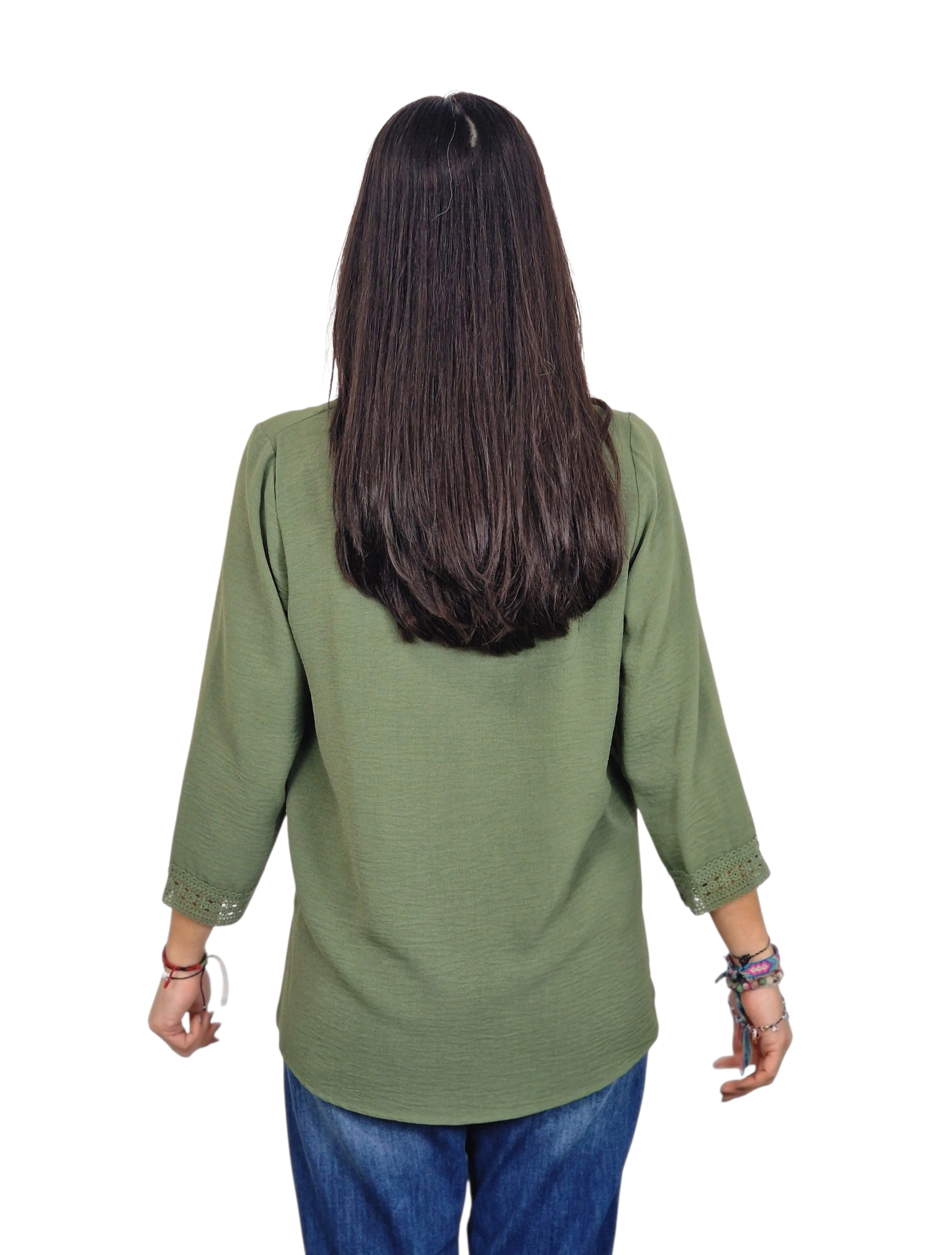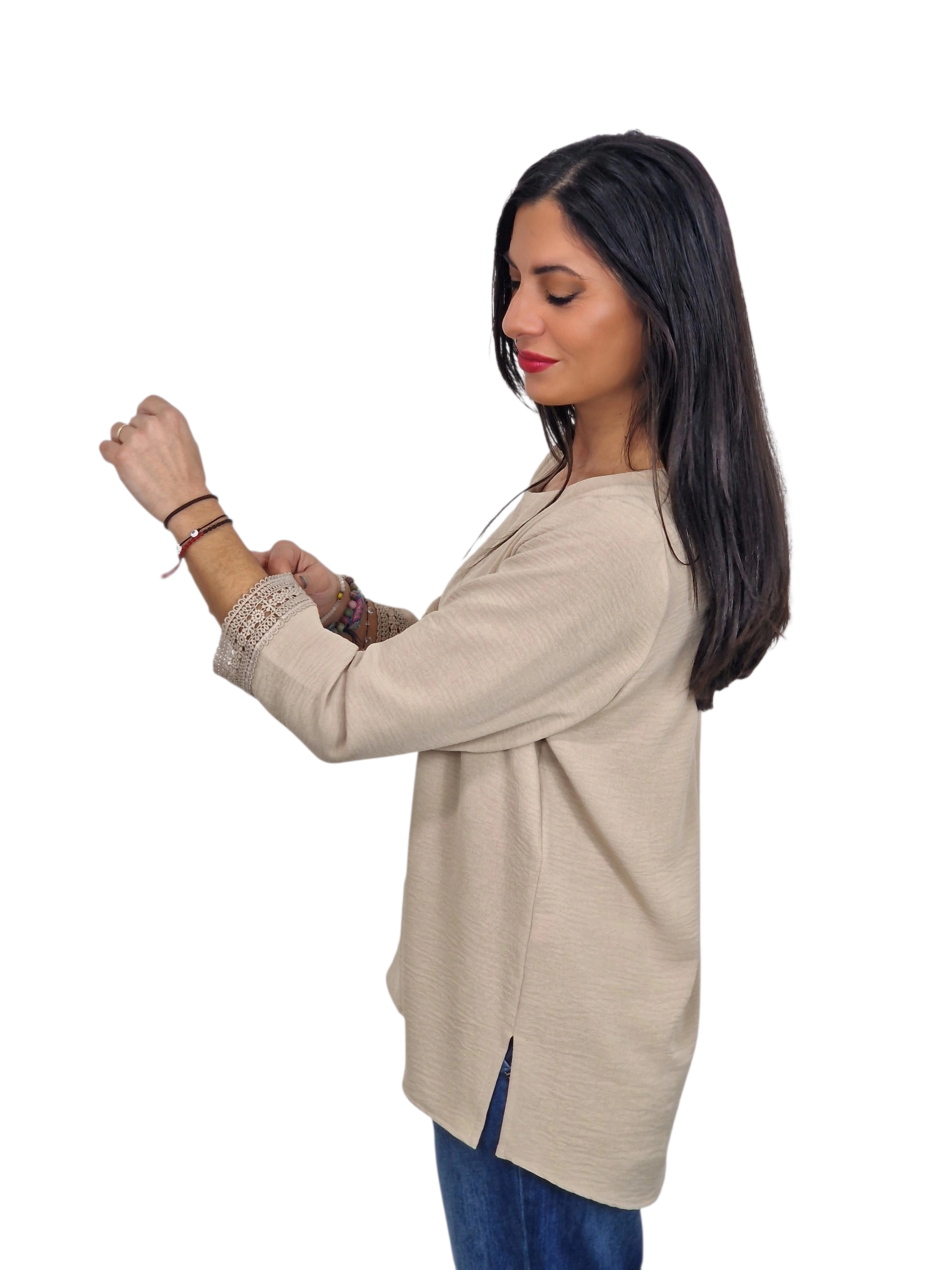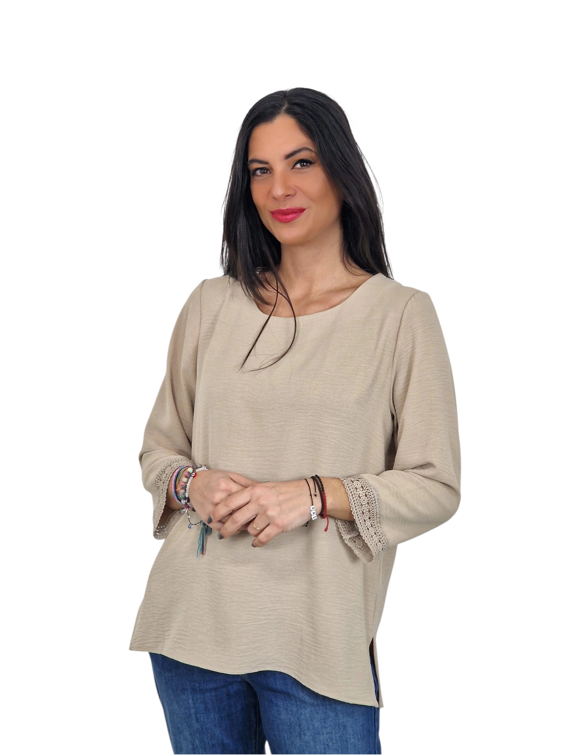 Blusa con cuello redondo y manga francesa adornada con puntilla. Disponible en marino, verde kaki, crudo, arena, tabaco y negro.