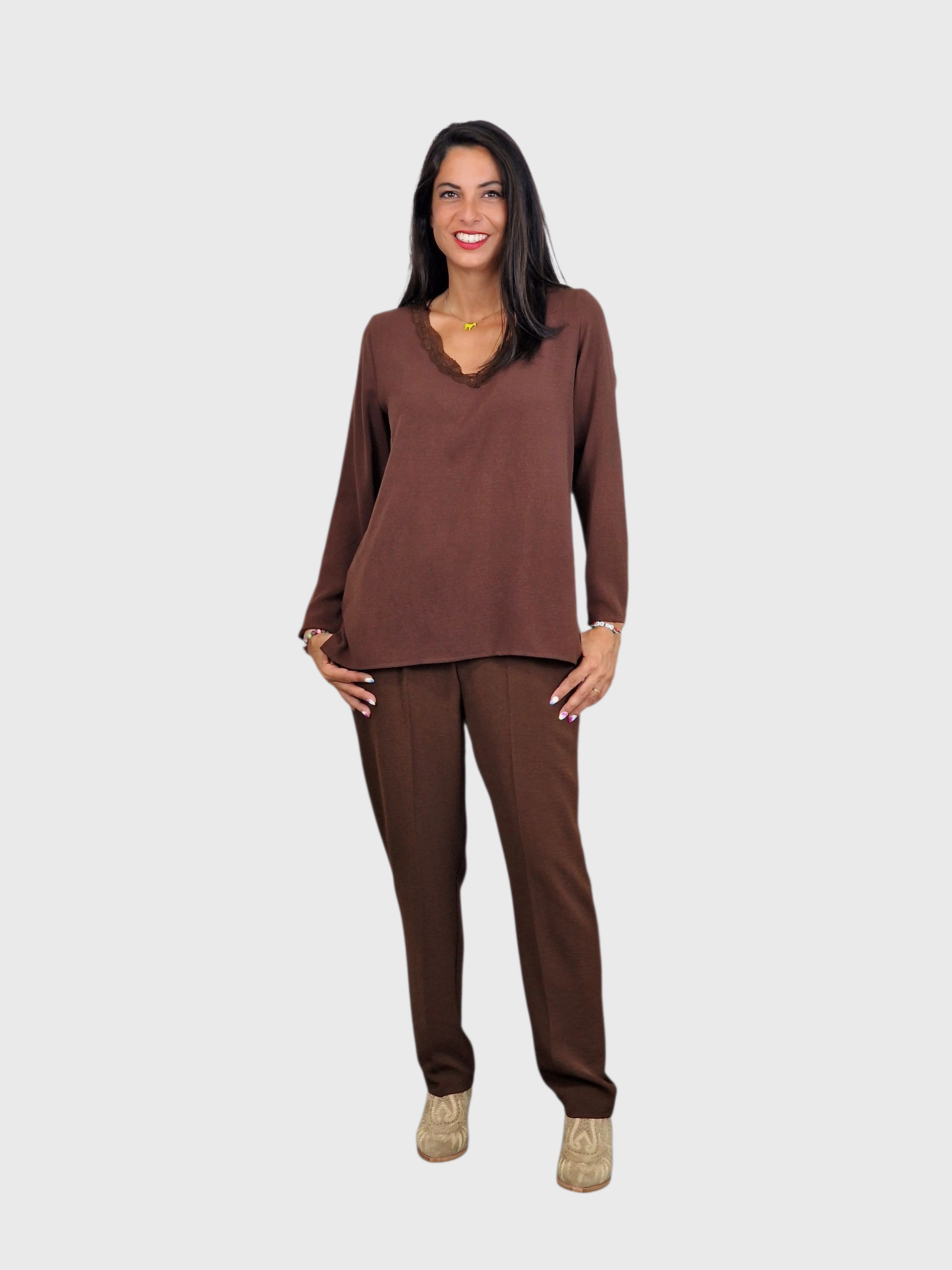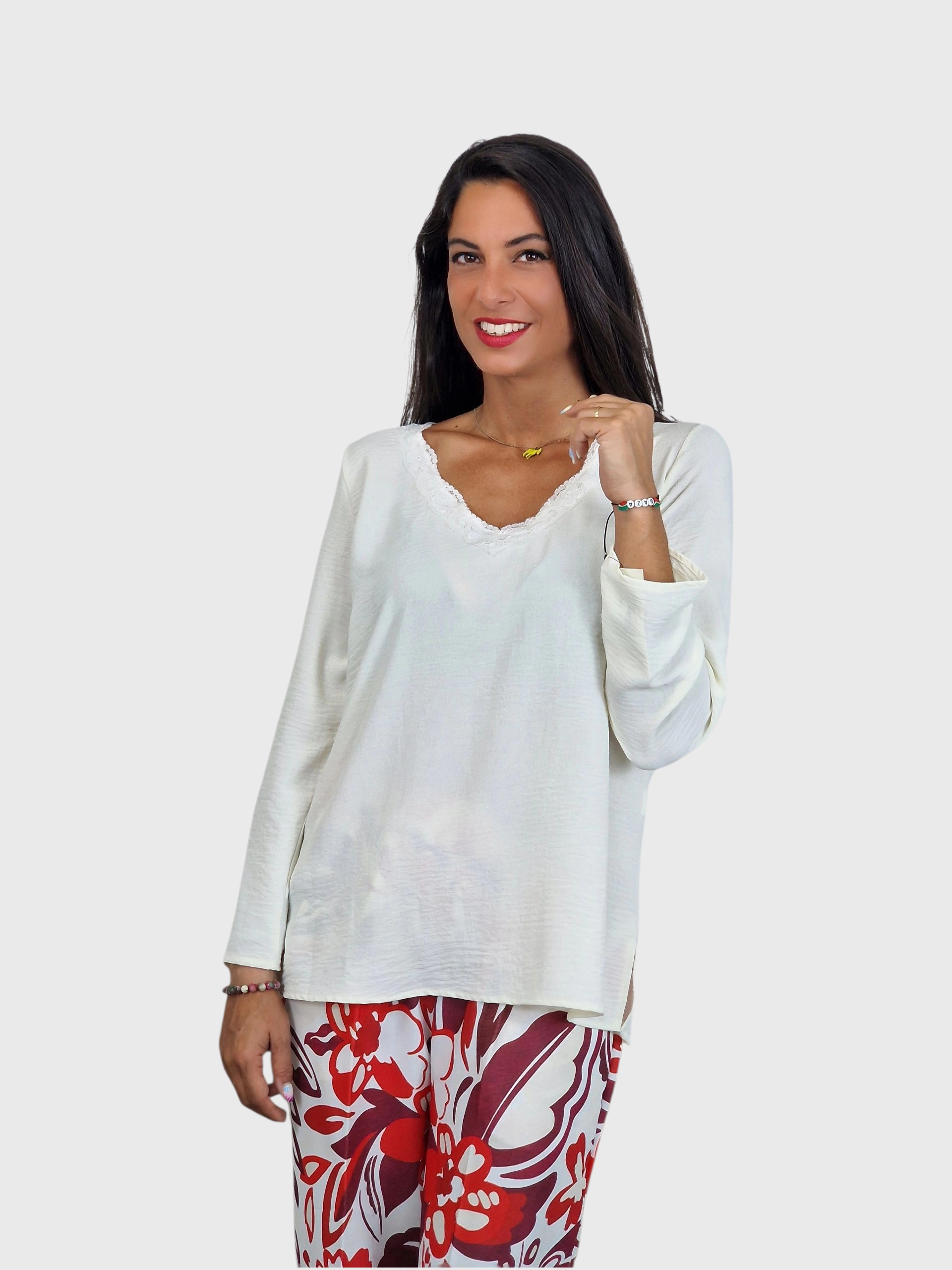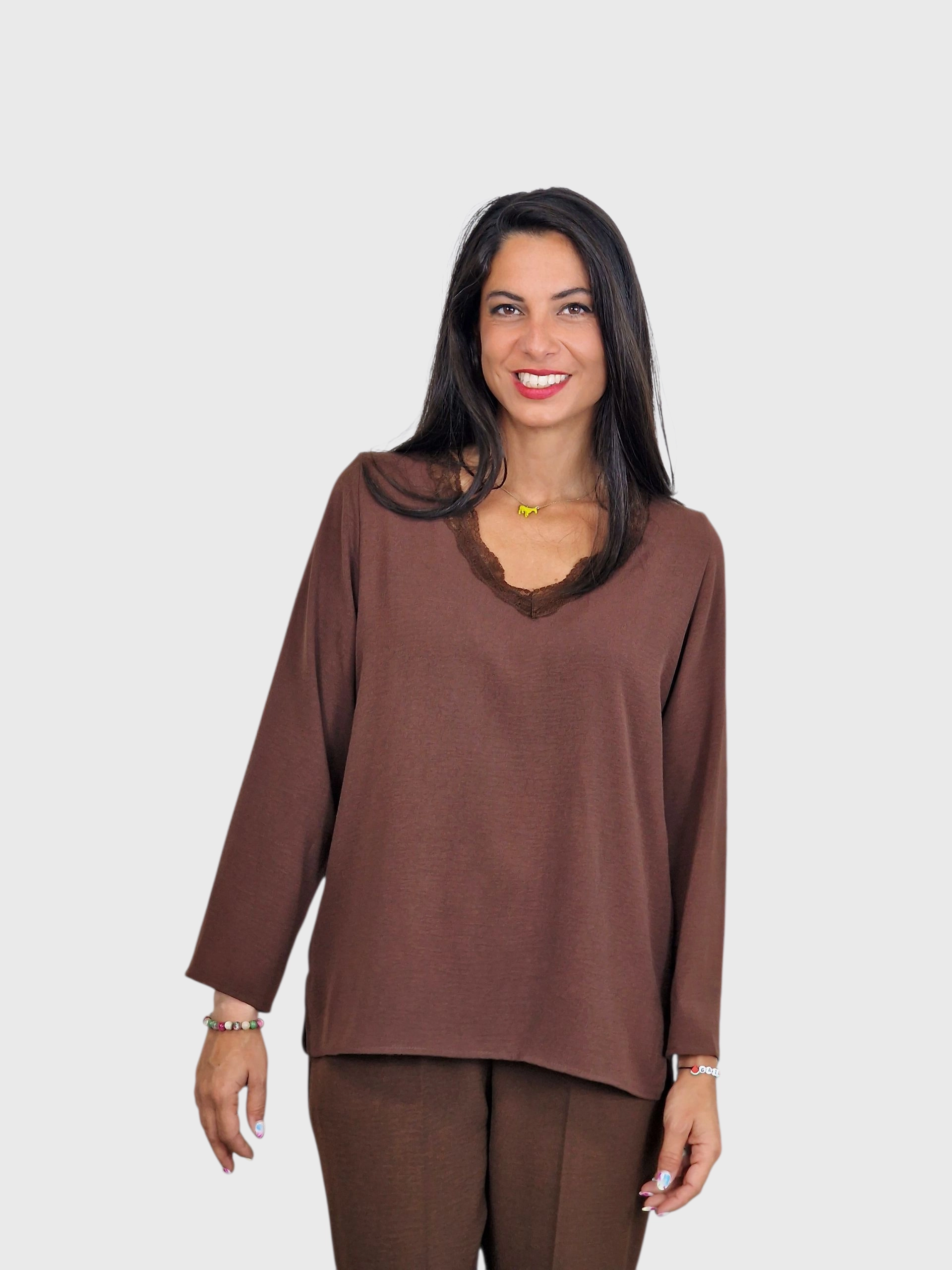 Blusa de gasa en manga larga.Escote pico adornado con puntilla. Disponible en negro, marrón, crudo y pruma.