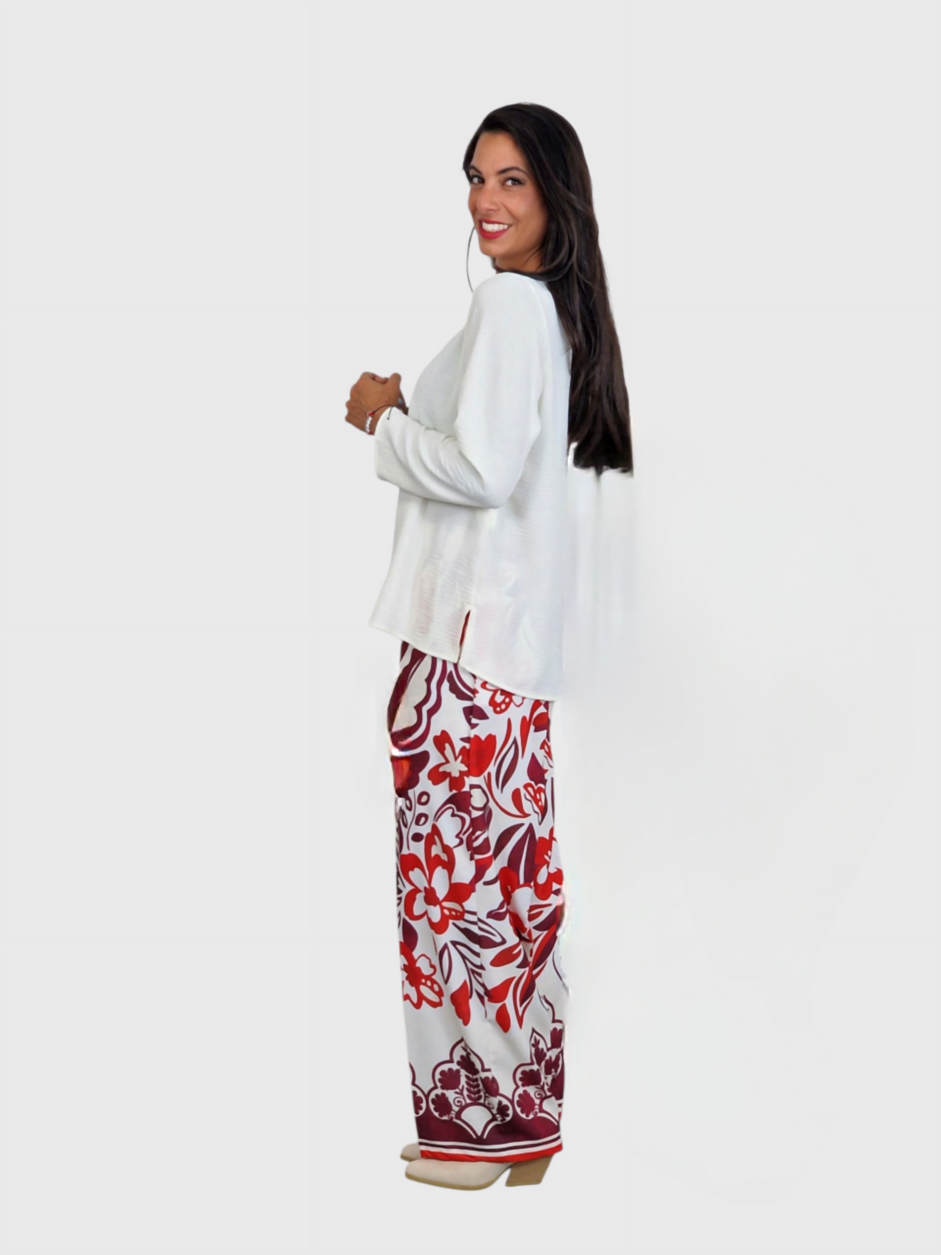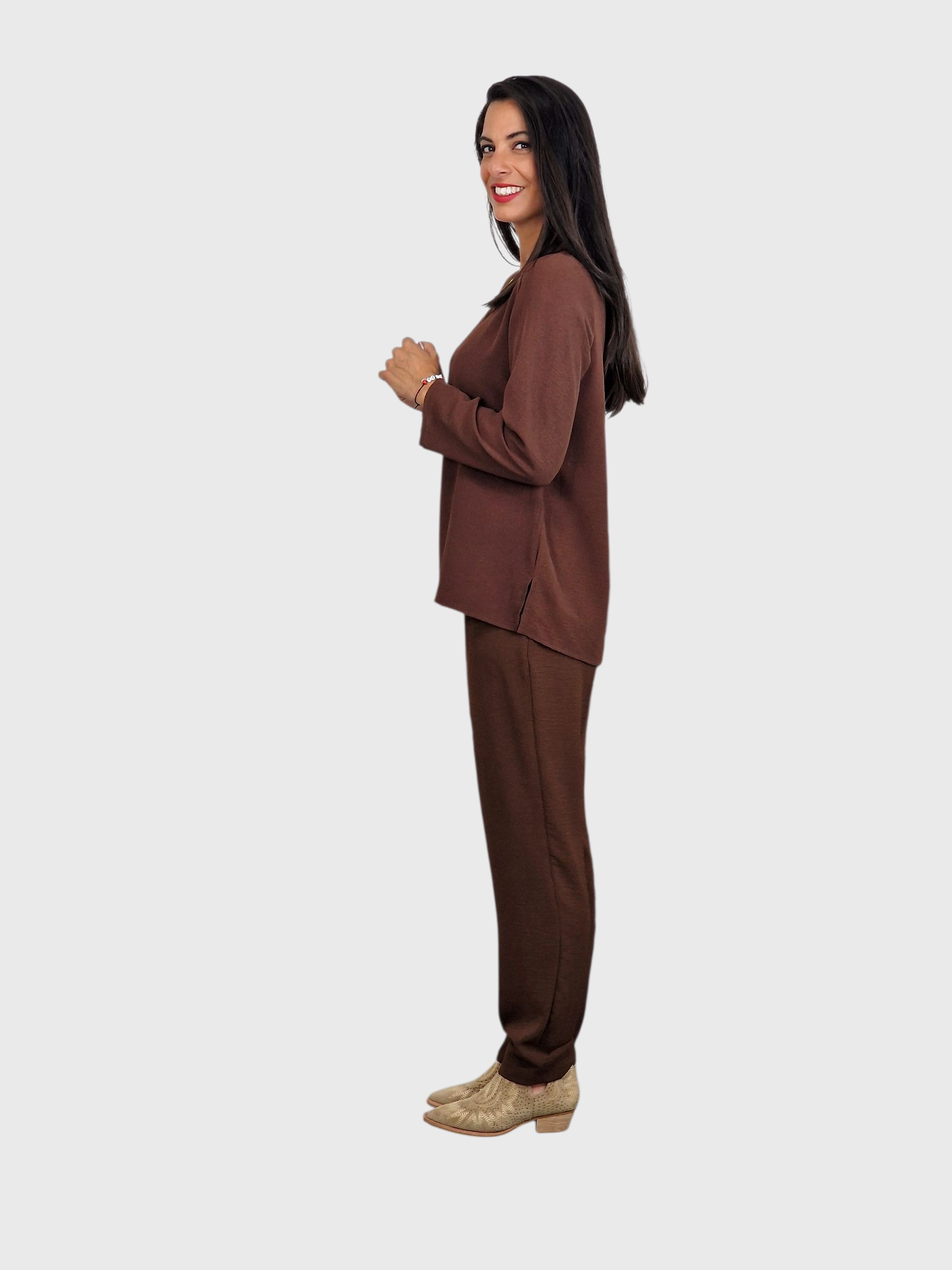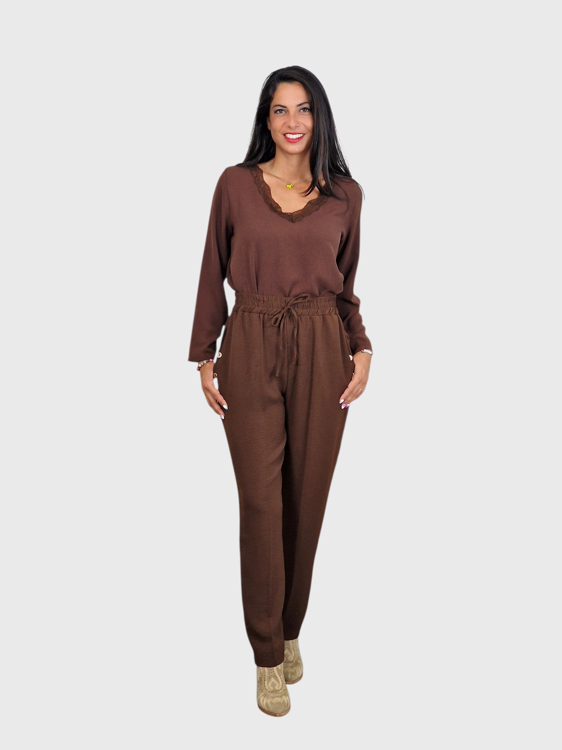 Blusa de gasa en manga larga.Escote pico adornado con puntilla. Disponible en negro, marrón, crudo y pruma.
