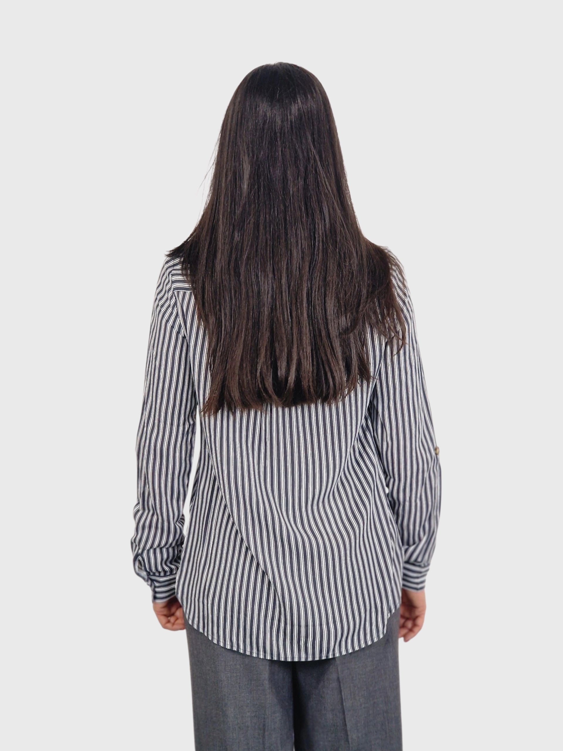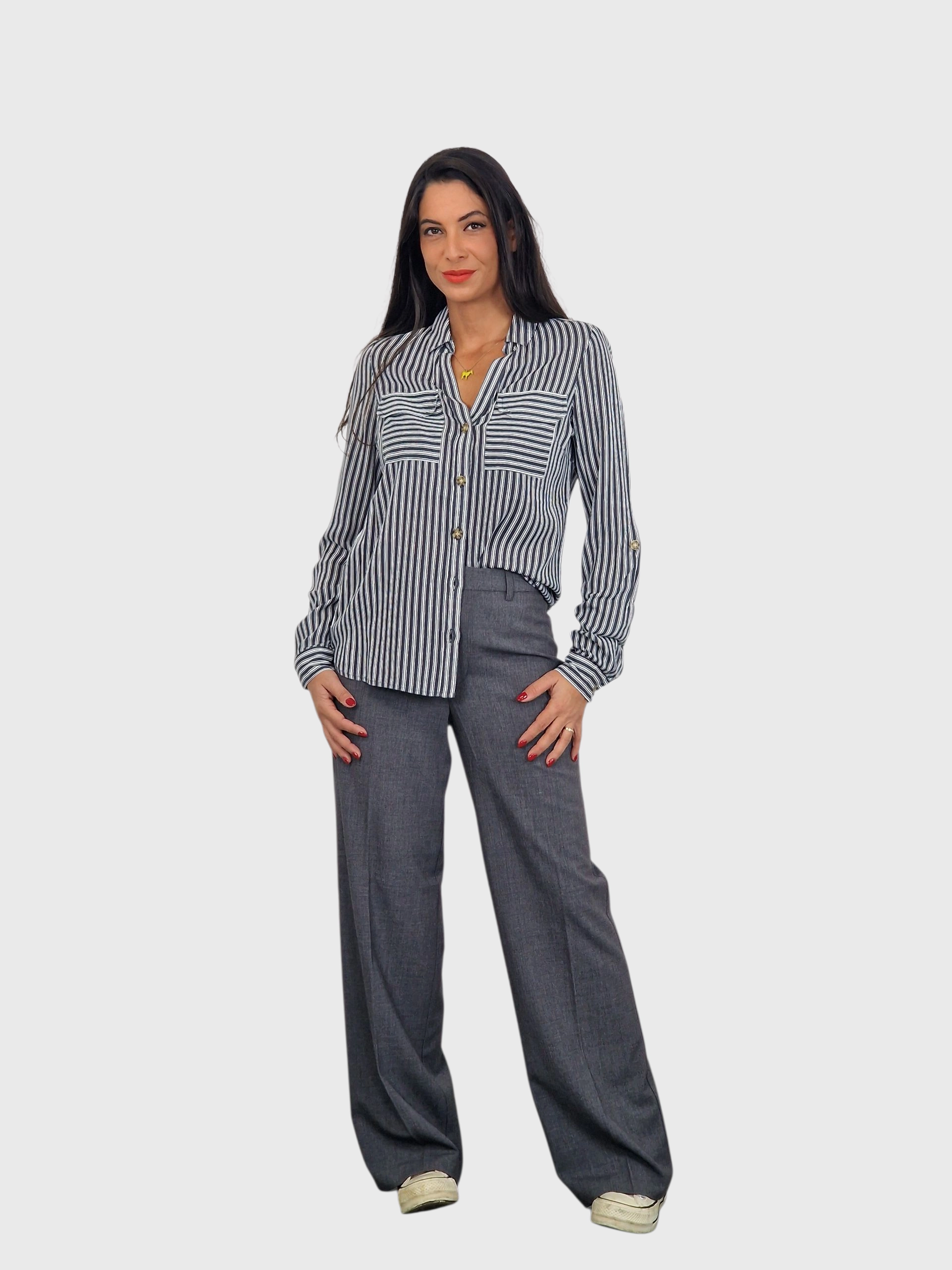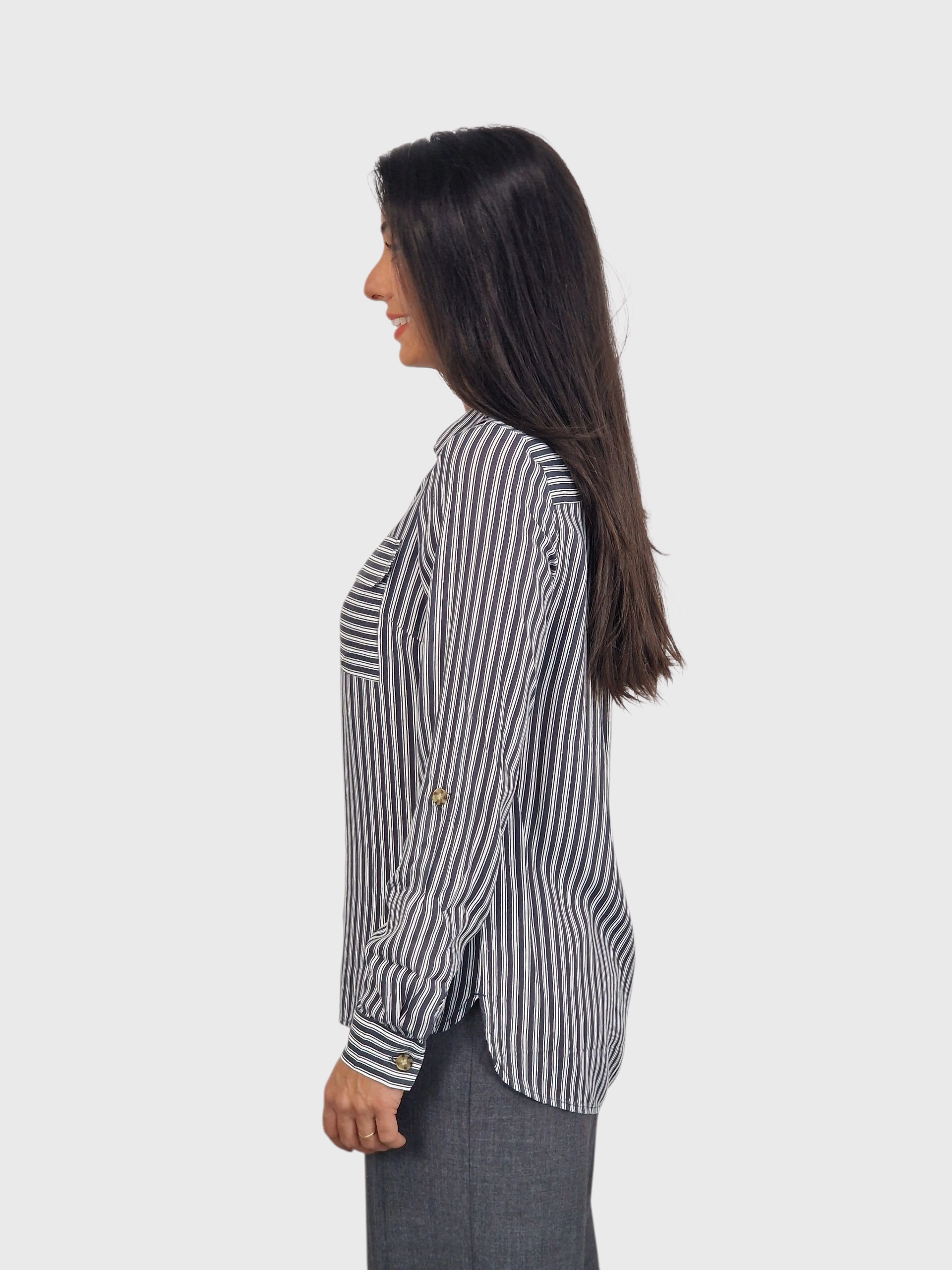 Blusa de manga larga abotonada con cuello camisero. Estampada en rayas grises con bolsillo tipo taflón a la altura del peccho.Disponible también en negro, marino, verde kaki y verde.