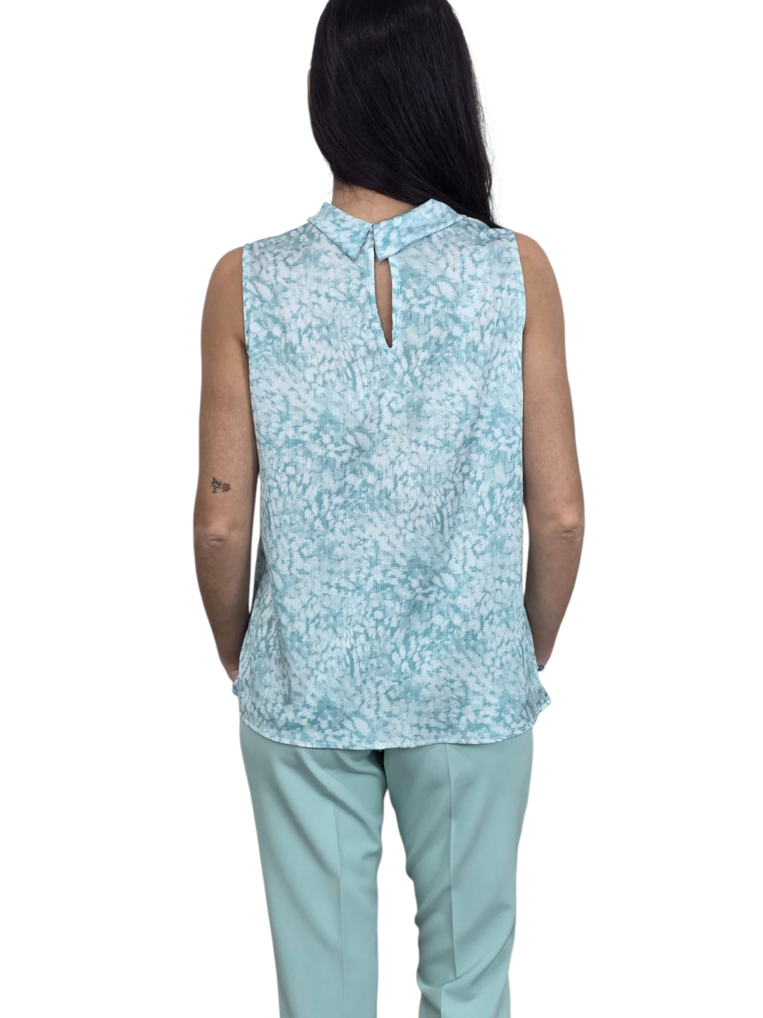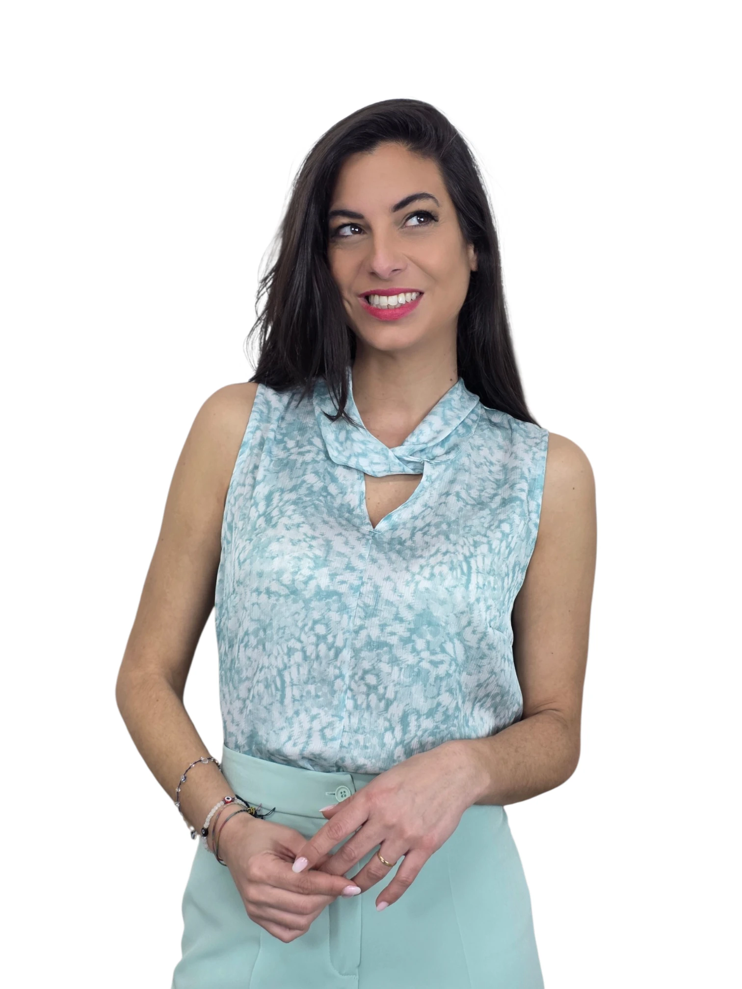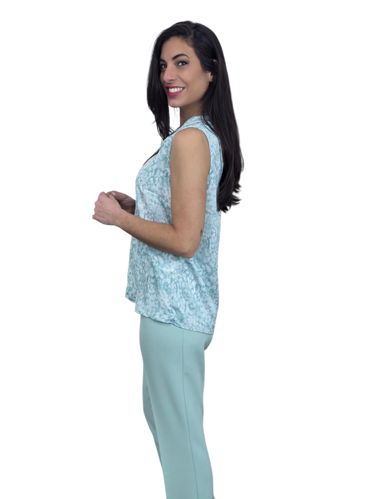 Blusa sin mangas con escote retrcido tipo haltr en tejido satinado. Disponible en verde agua y en rosa palo.