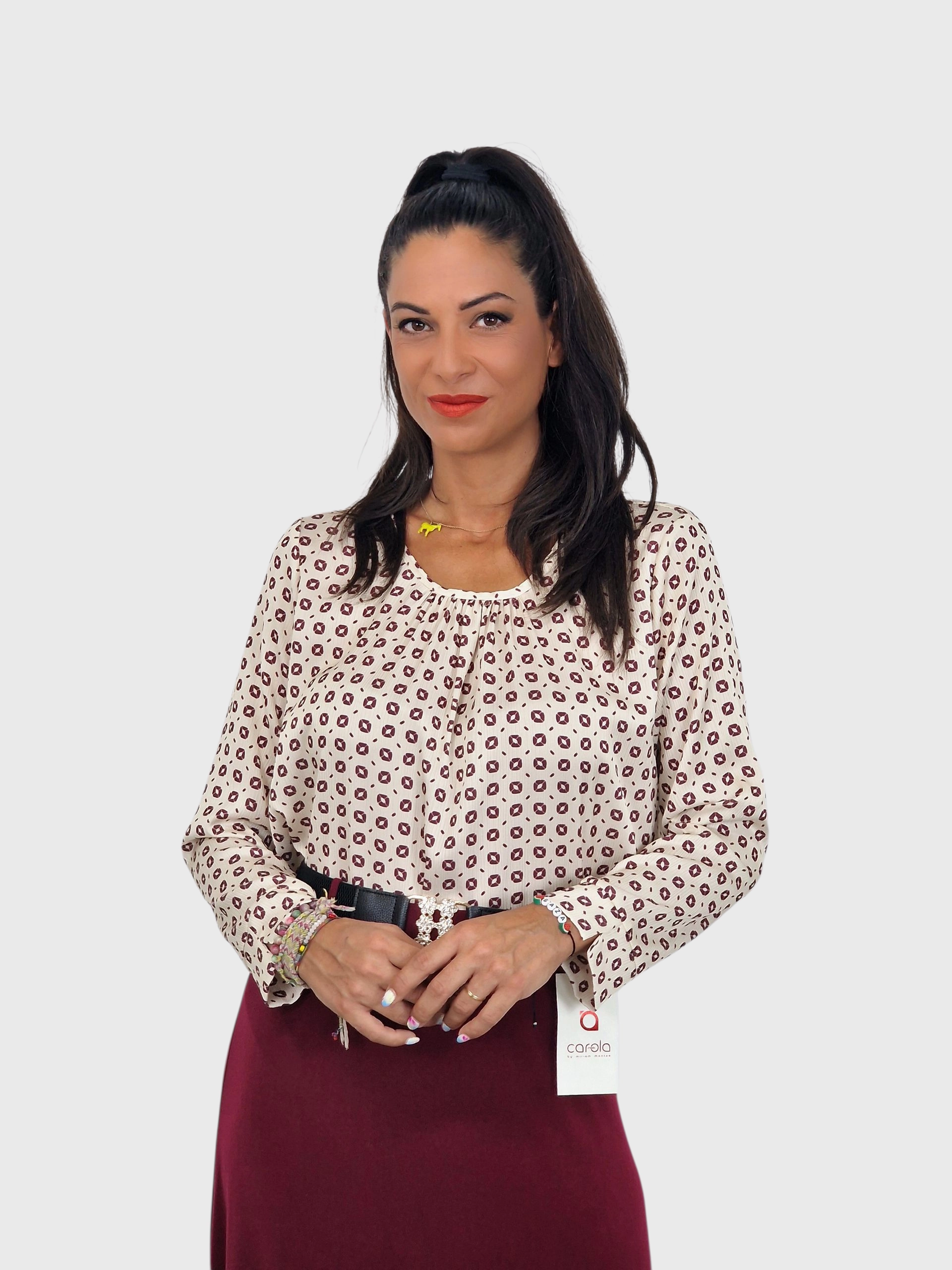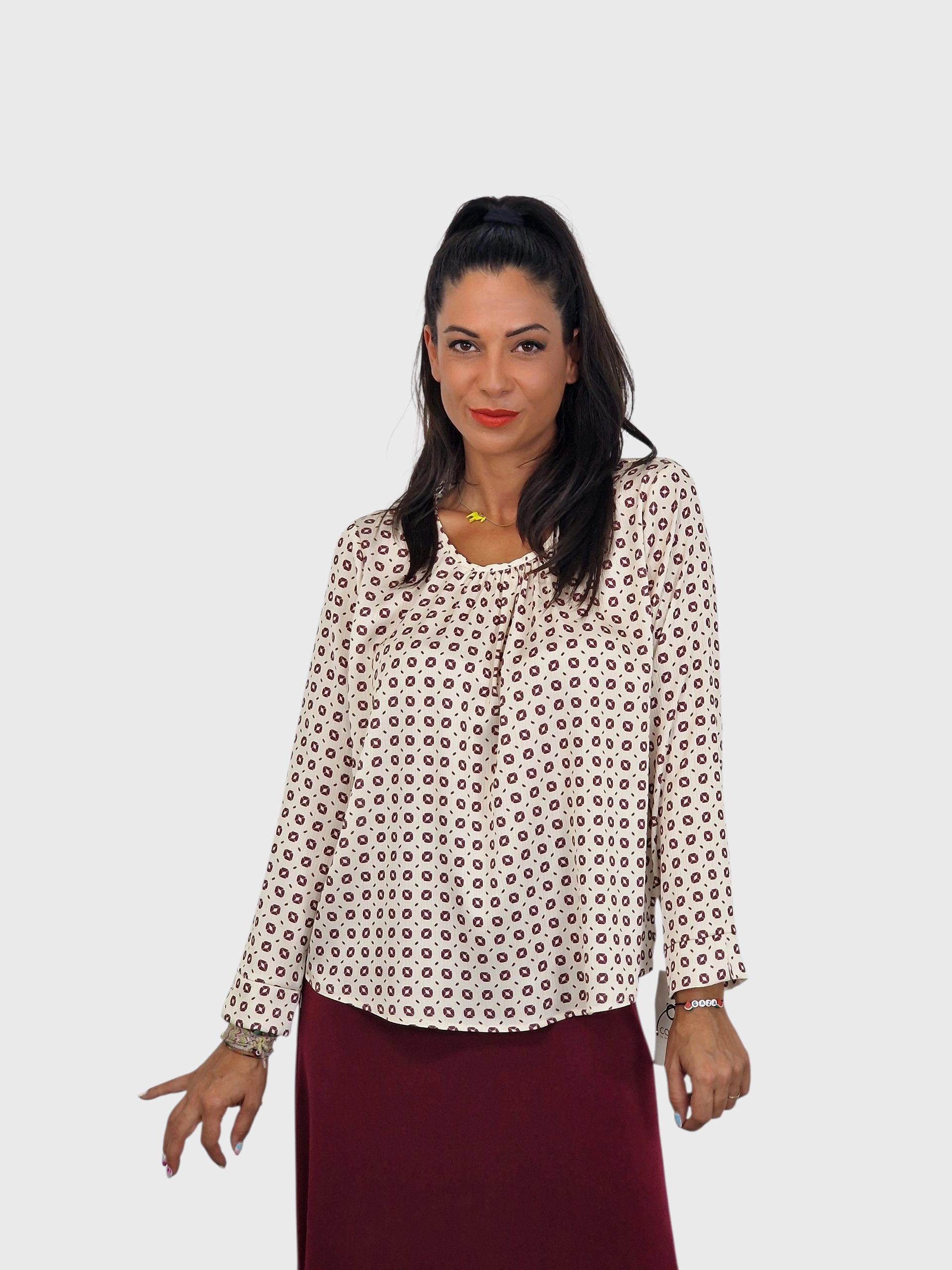 Blusa de manga larga sin botones, escote redondo y estampado geométrico. Disponible con fondo beige y estmapado en negro o pruma, granate.