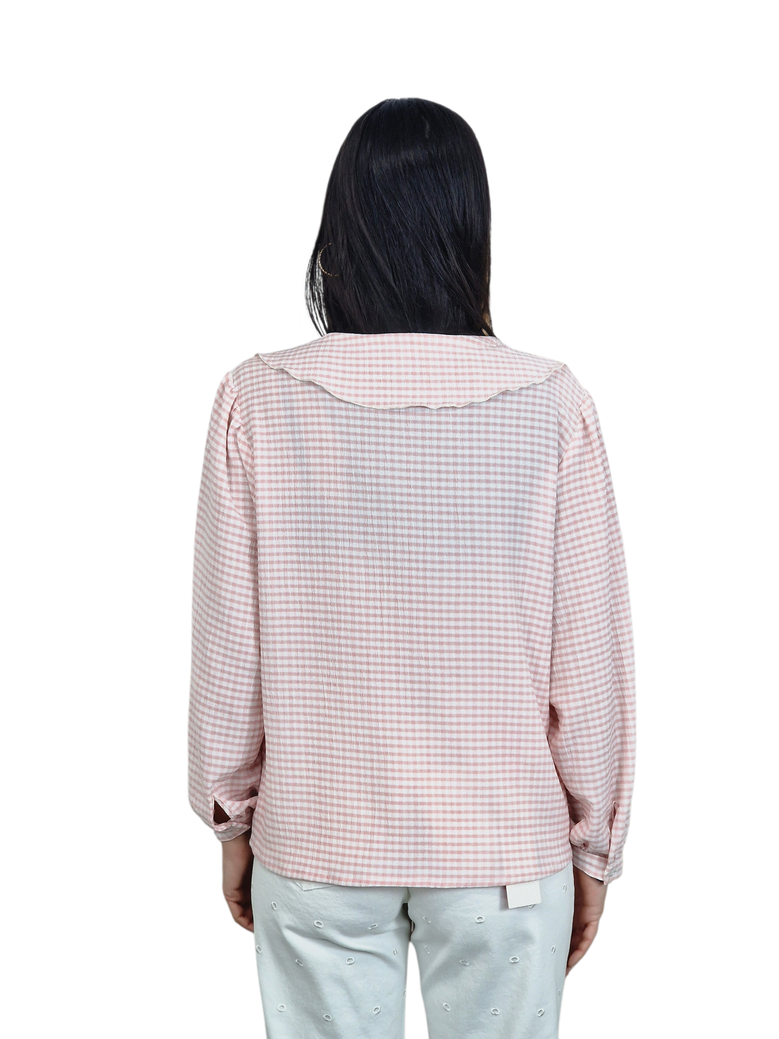 Blusa en estampado vichy, manga francesa y voante en cuello y escote.Disponible en rosa palo y en celeste.