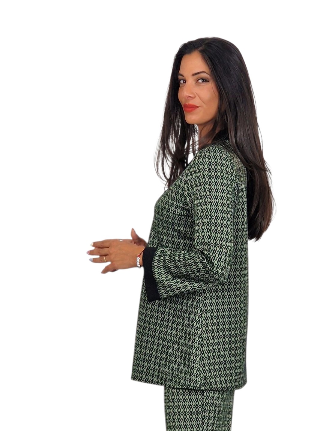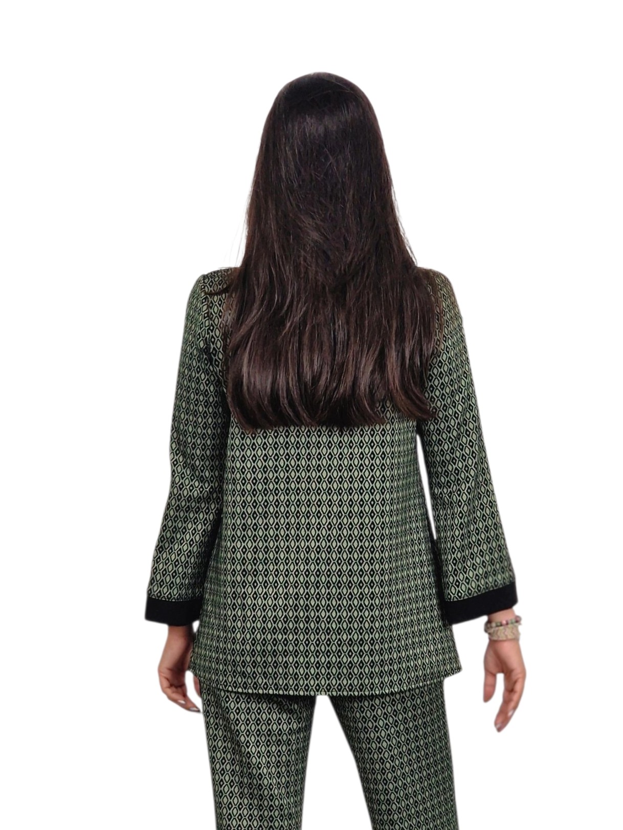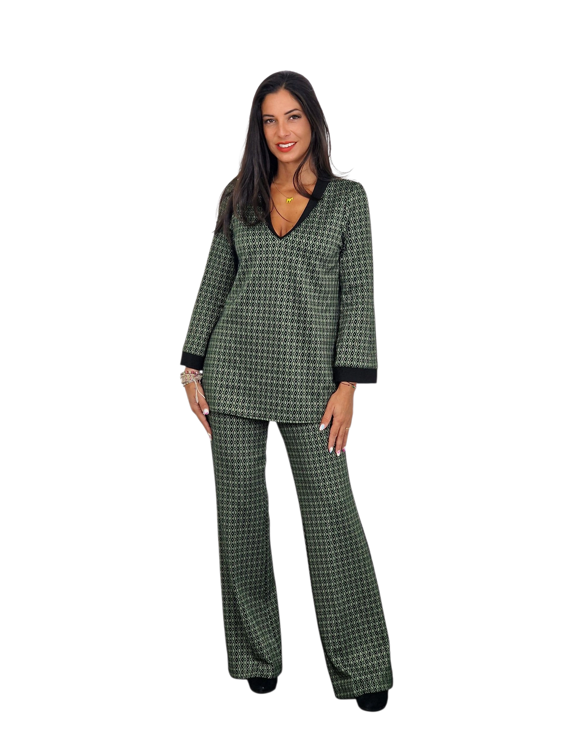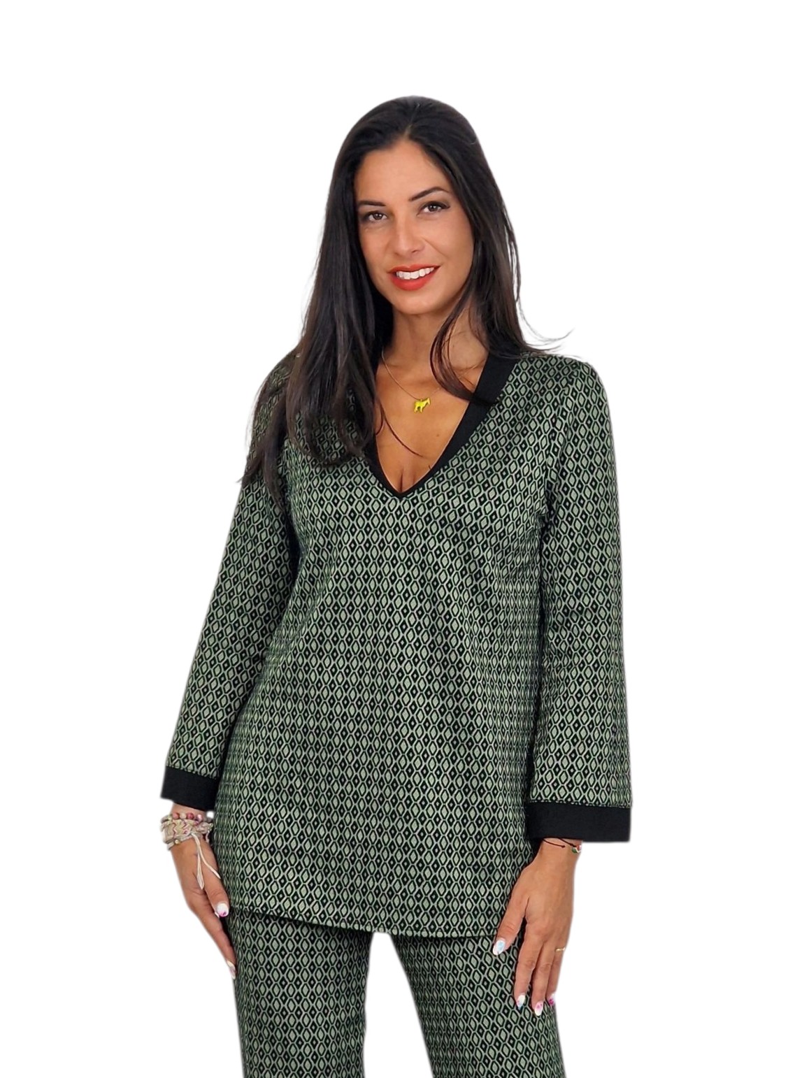 Blusa en punto frío con estampado en V, manga francesa, estampàdo geométrico en rombos mini y a conjunto con pantalón ref. O40055