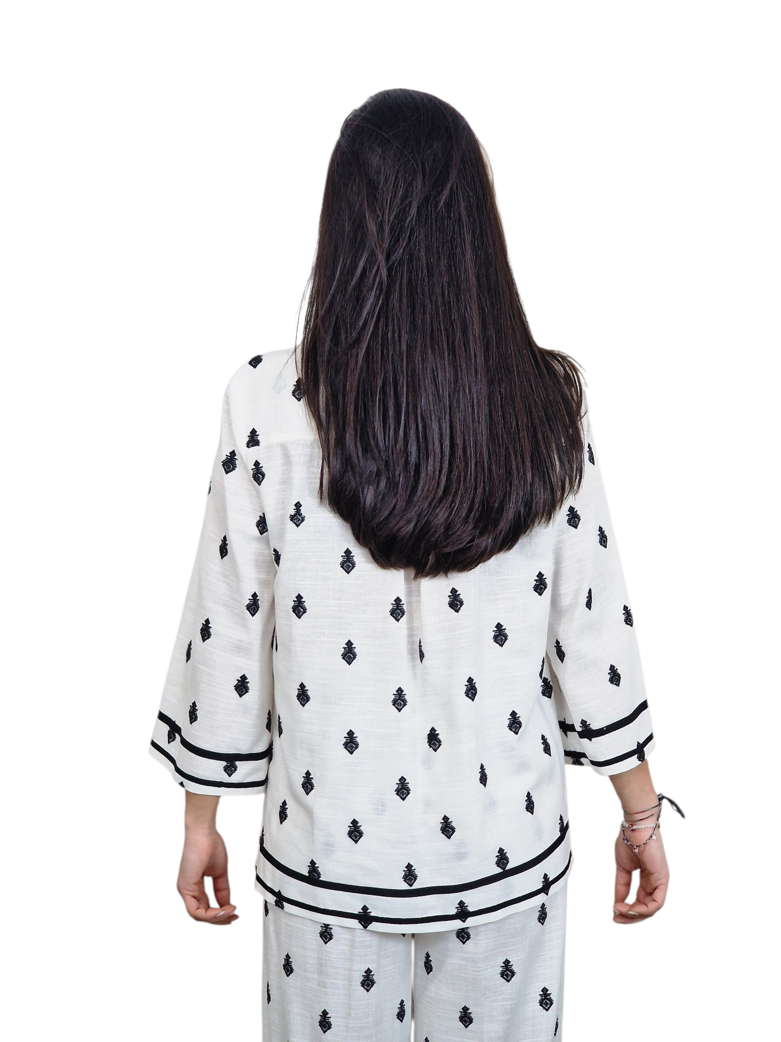 Blusçon de tejido tipo lino con manga francesa. Adornado con bordados. Disponiblen en blanco con bordados negros y en blanco con bordados negros.