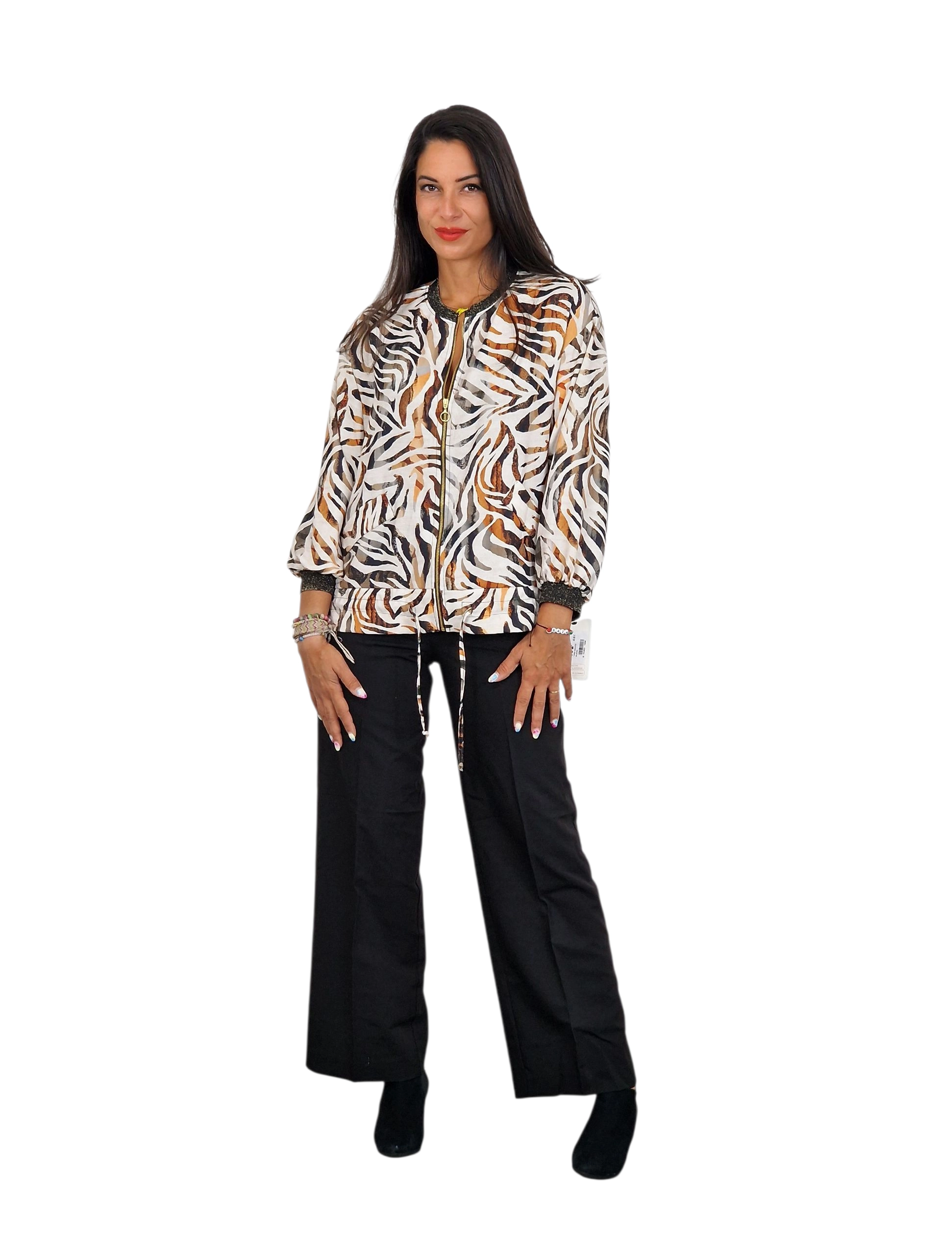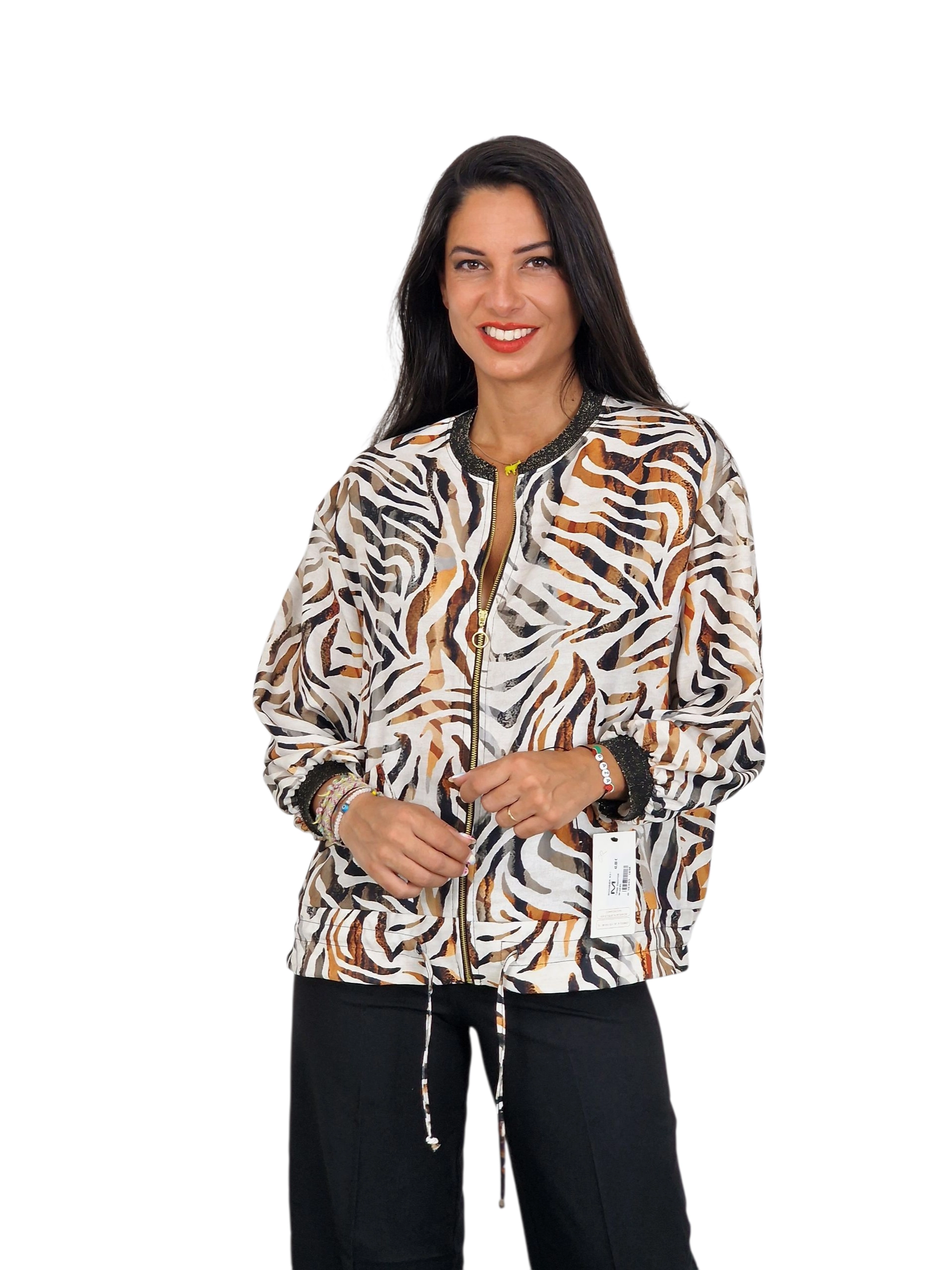 Cazadora bomber en tejido tipo gasa. Elásticos en cuello y puños con efecto purpurina. Estampado animal print en tonos camel, negro y crudo.