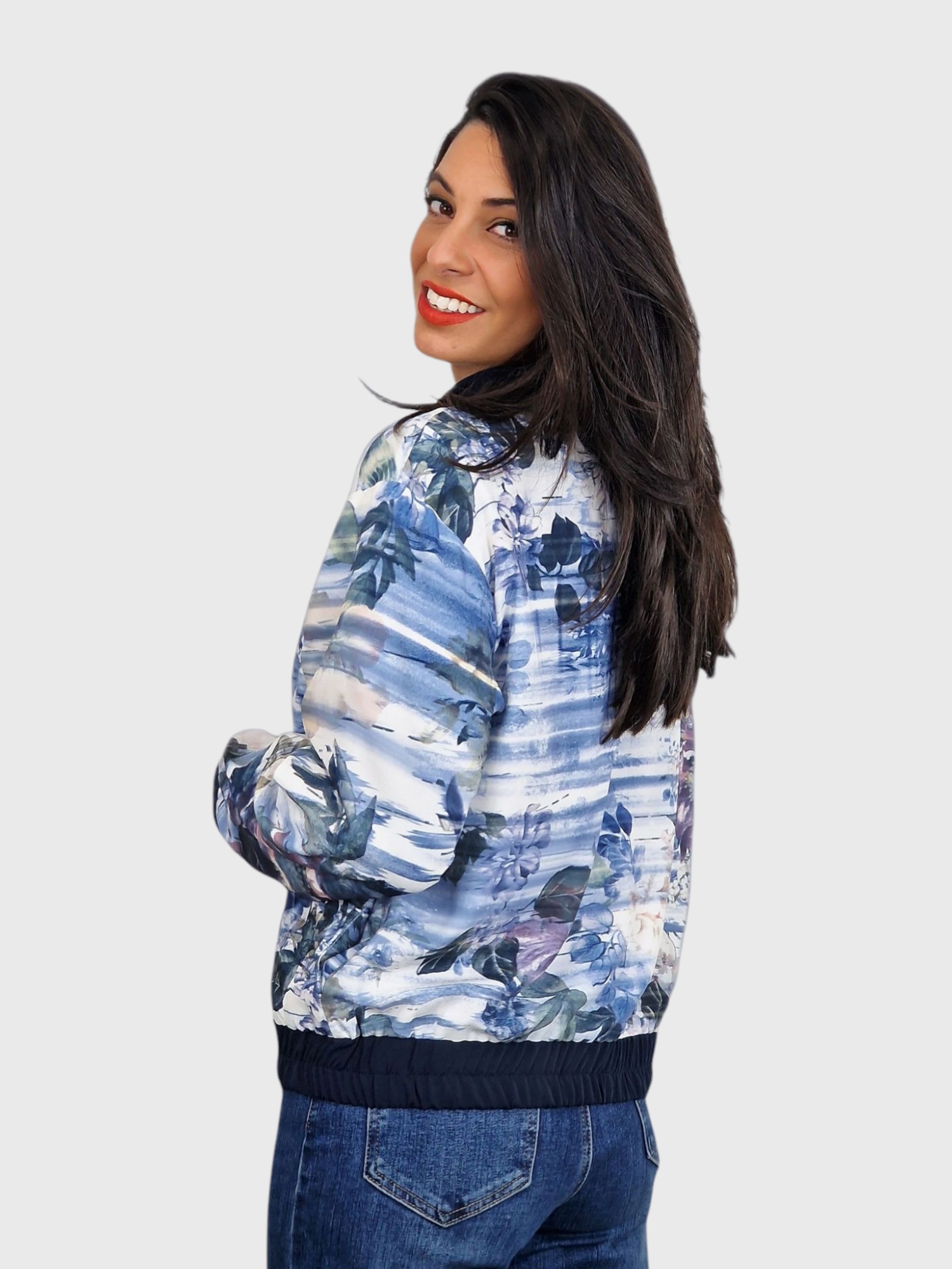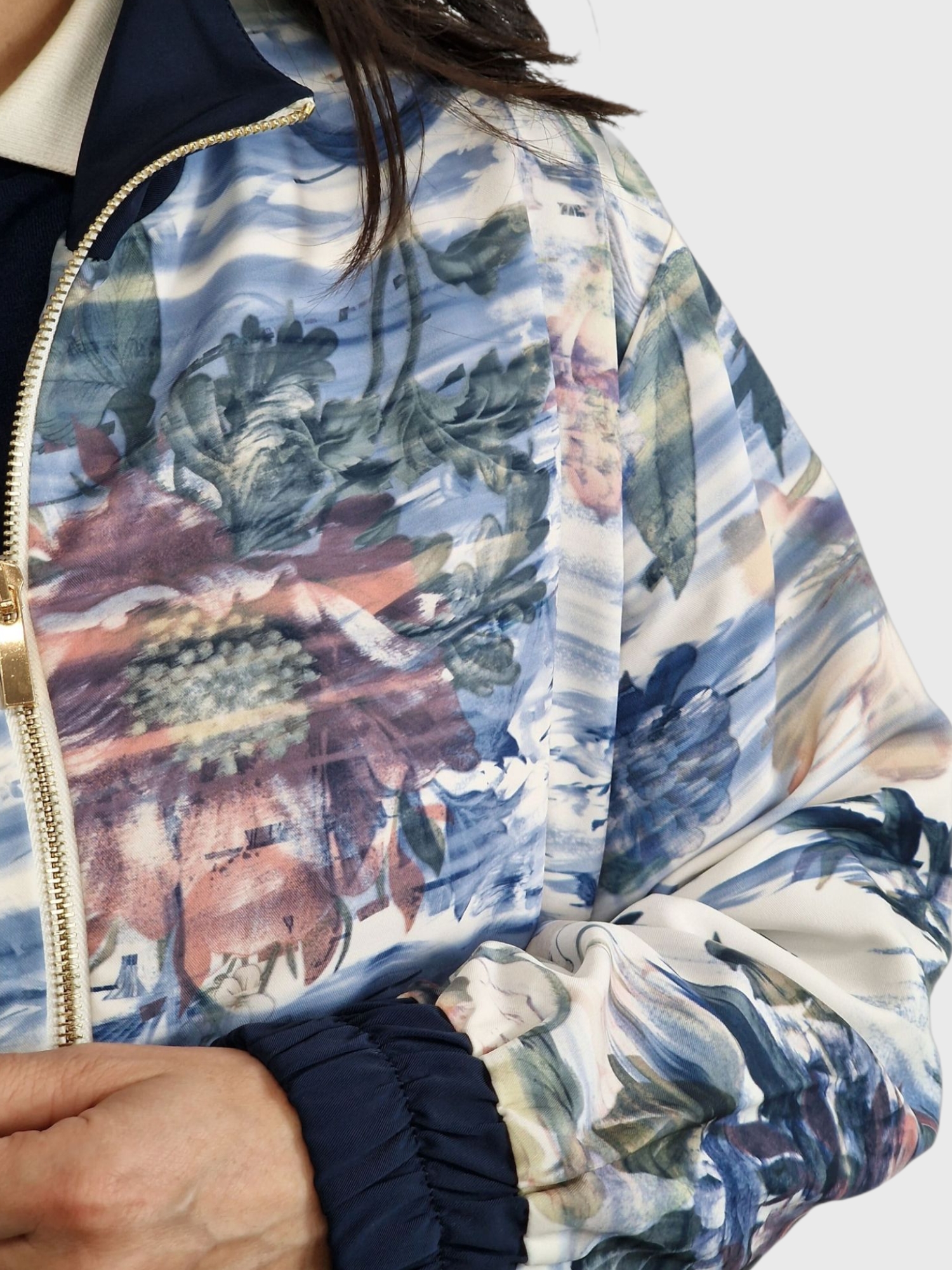 Bomber estampada con motivos florales tipo japonés. Disponible en azul marino y verde kaki.
