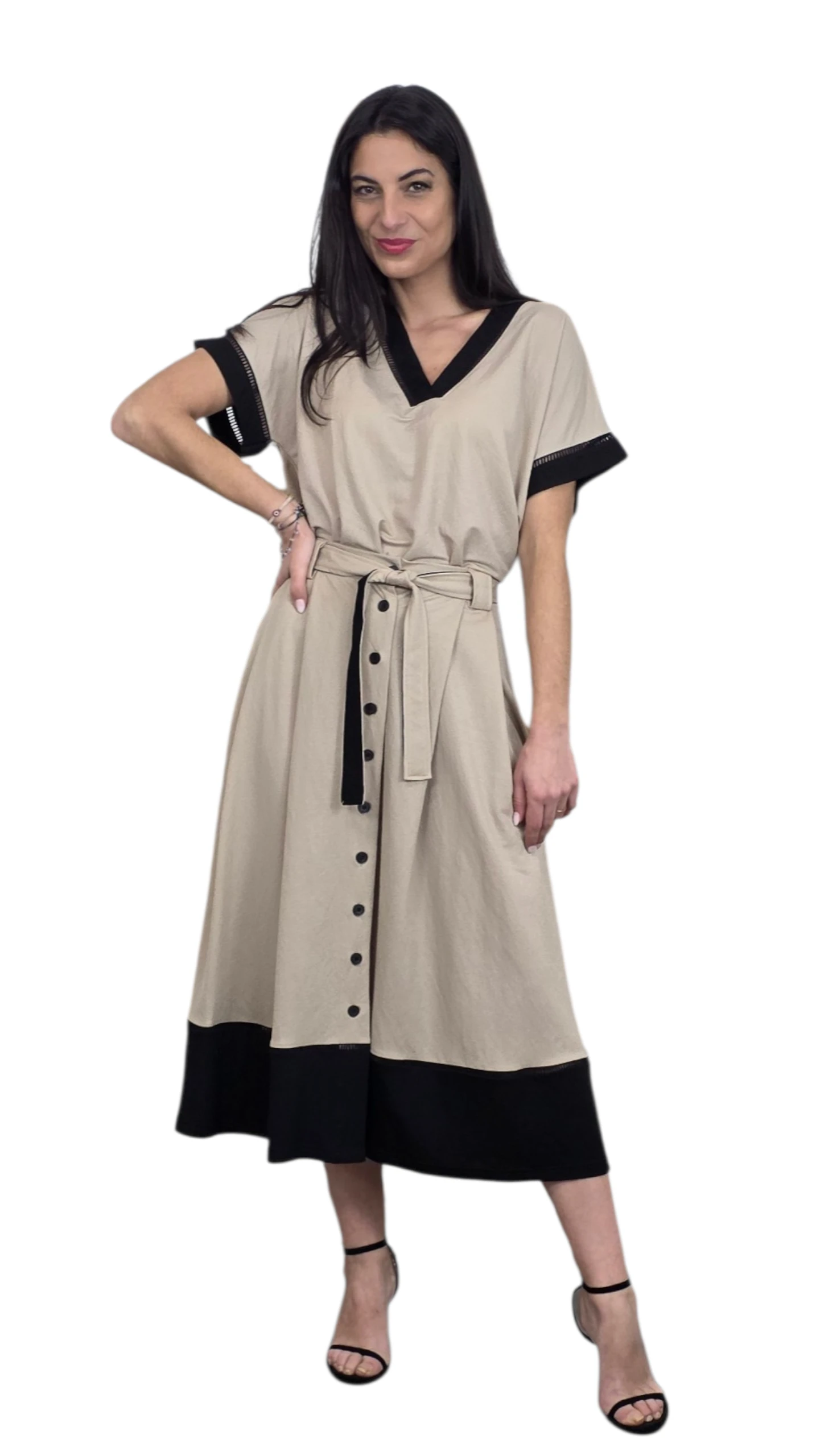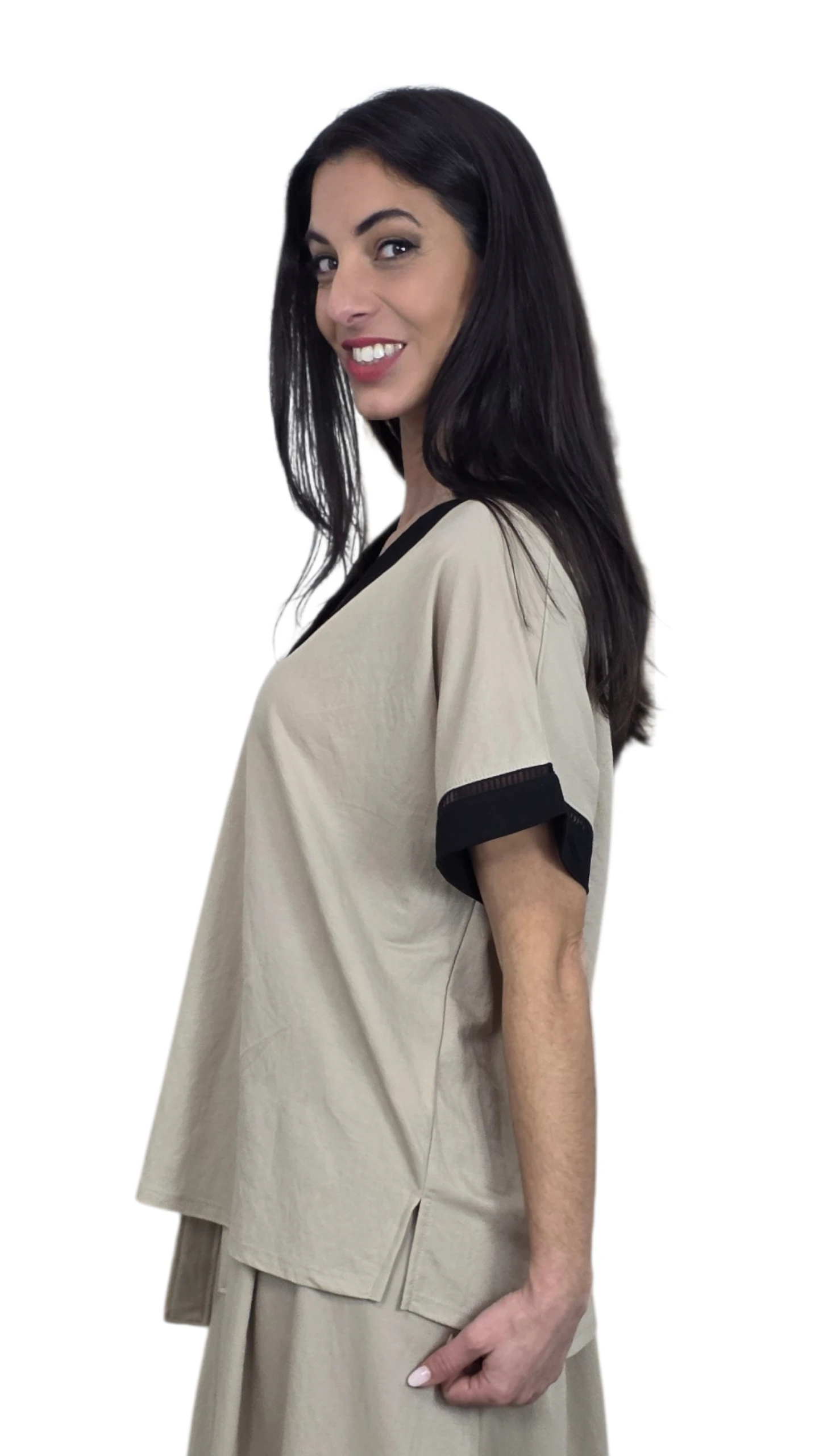 Camiseta de manga rangla corta con escote pico con cenefa en negro , también en las mangas.