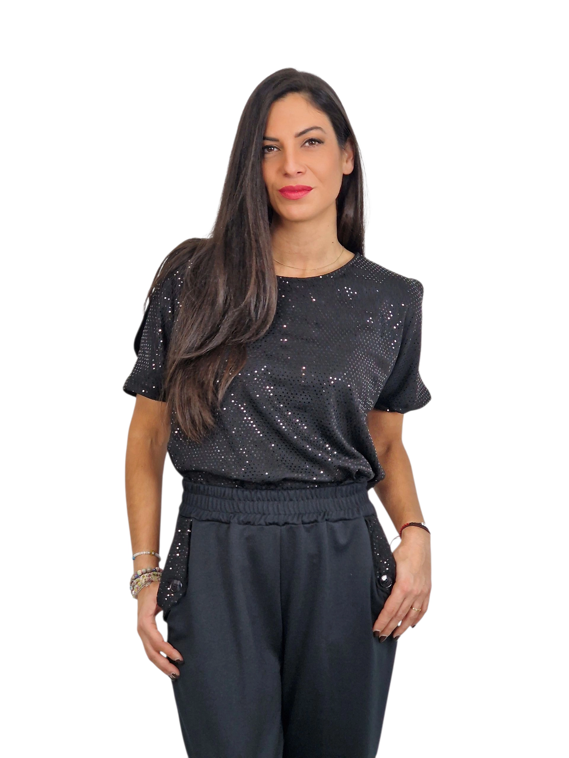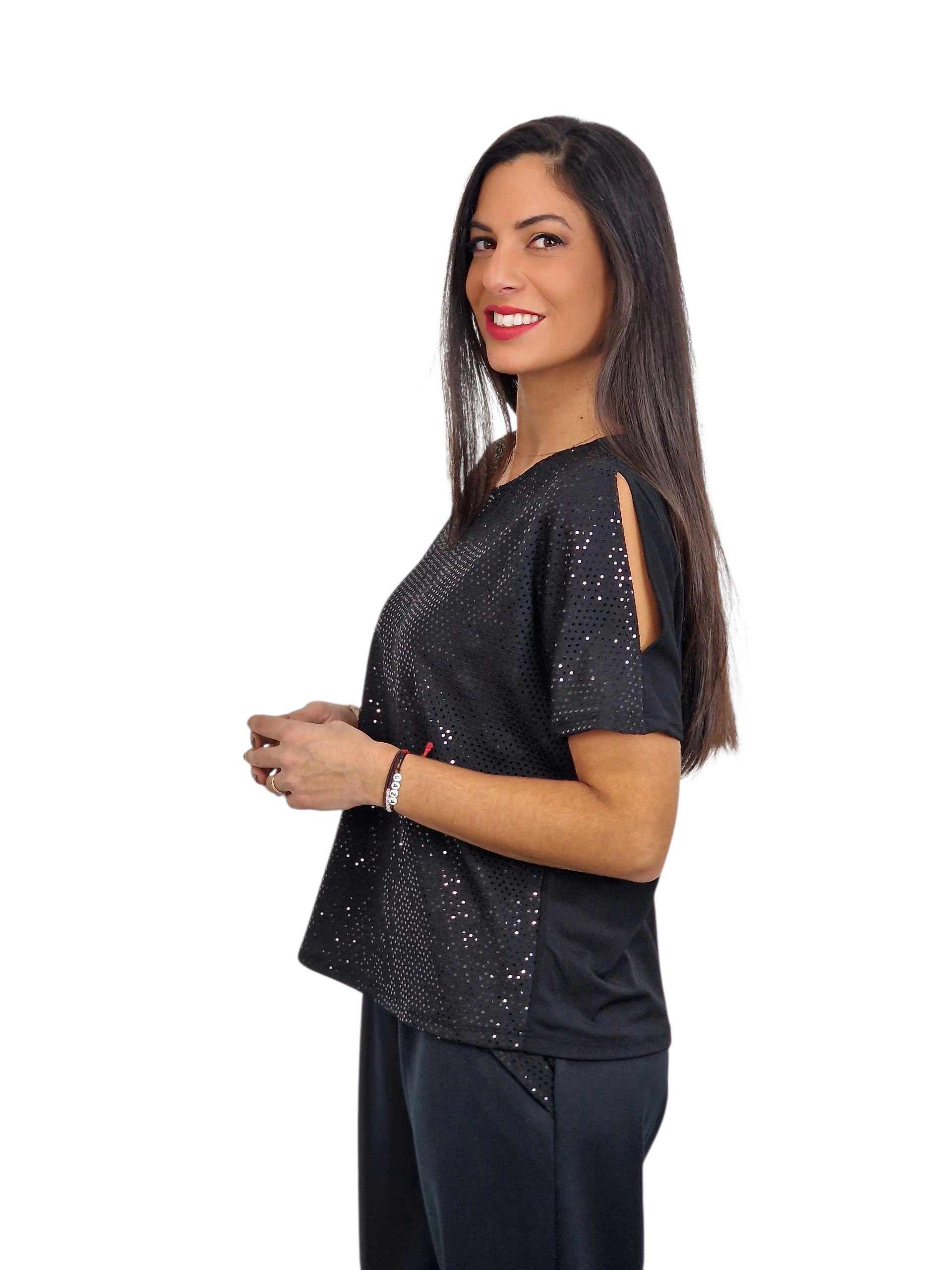 Camiseta de manga corta con abertura en ambas mangas, lentejuelas por la parte delantera y punto elástico en la espalda.