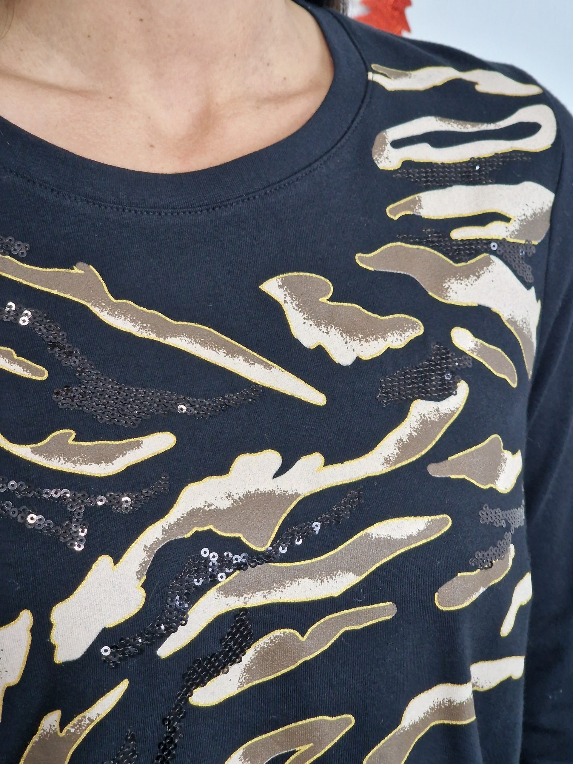 Camiseta de manga larga , cuello redondo y punto. Estamapado de animal print. Disponible en negro y en crudo.