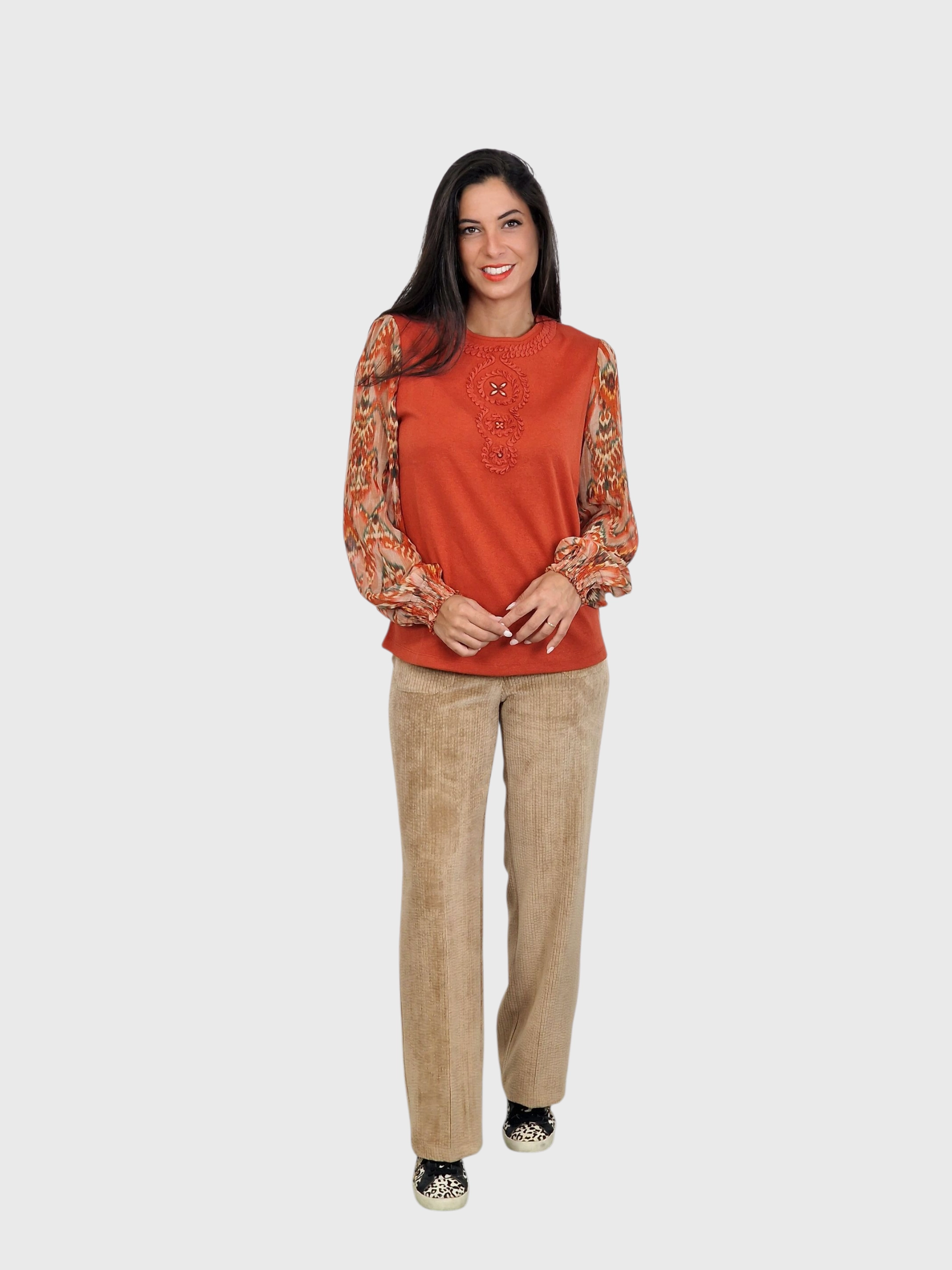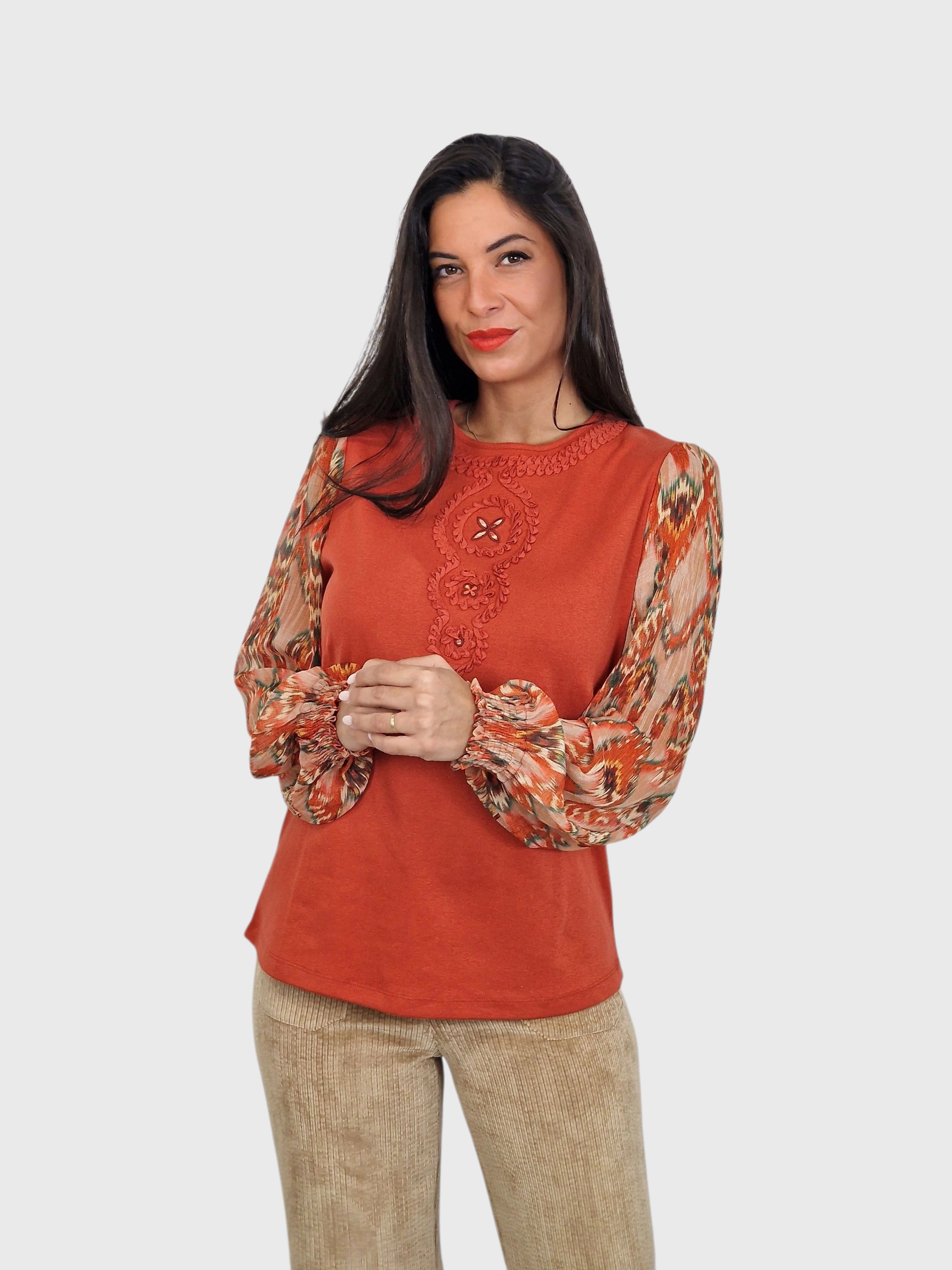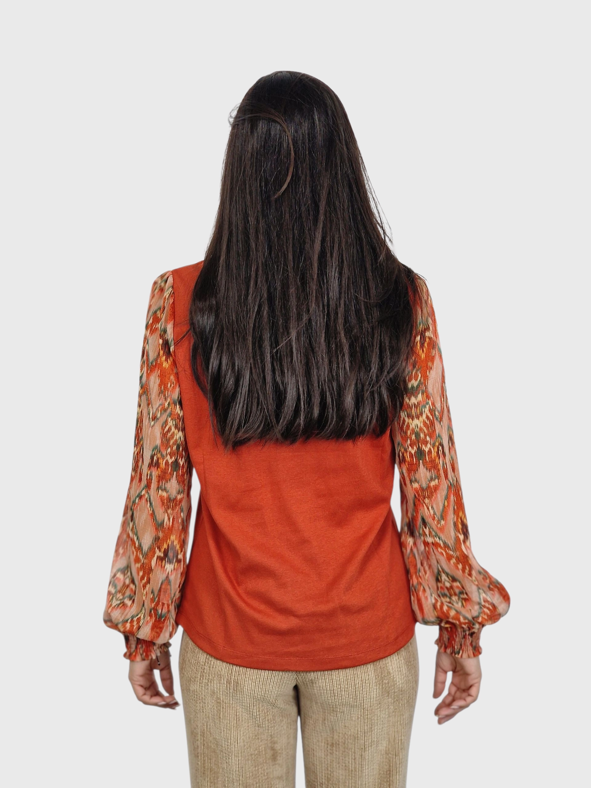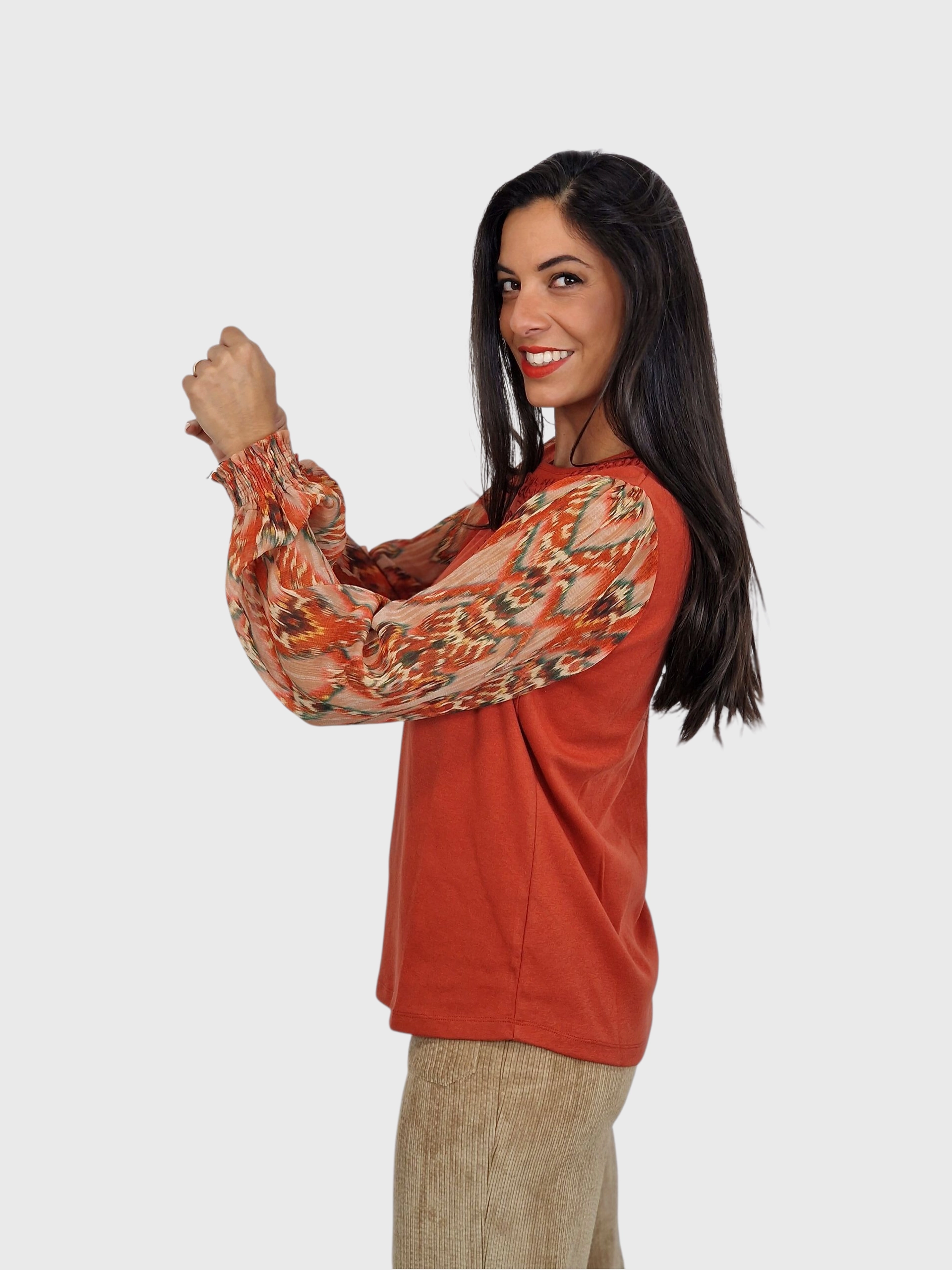 Camiseta con cuerpo color teja y mangas con estampado en colores tierra. Cuello redondo y manga larga.