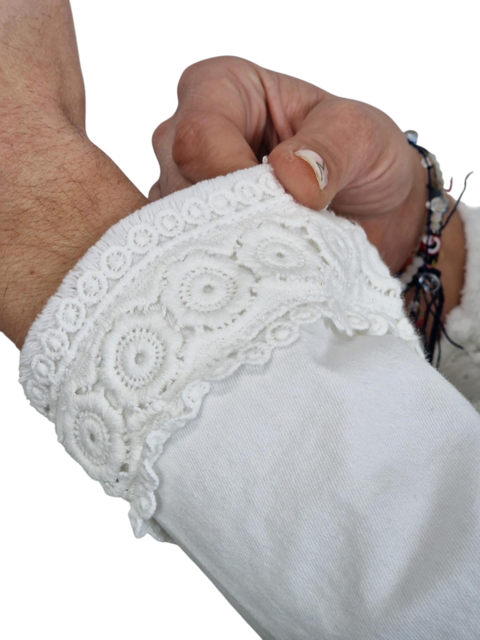 Cazadora vaquera con botones joya y puños adornados con puntilla crochet. Disponible en blanco y en rosa chicle.