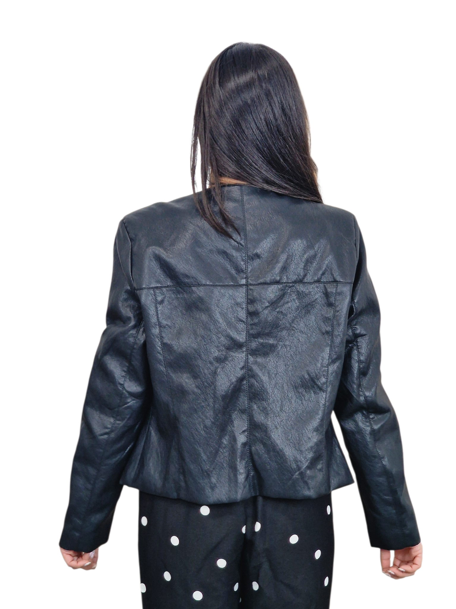 Cazadora de polipiel con aros plateados en la parte frontal, de los dos lados. Disponible en negro y crudo