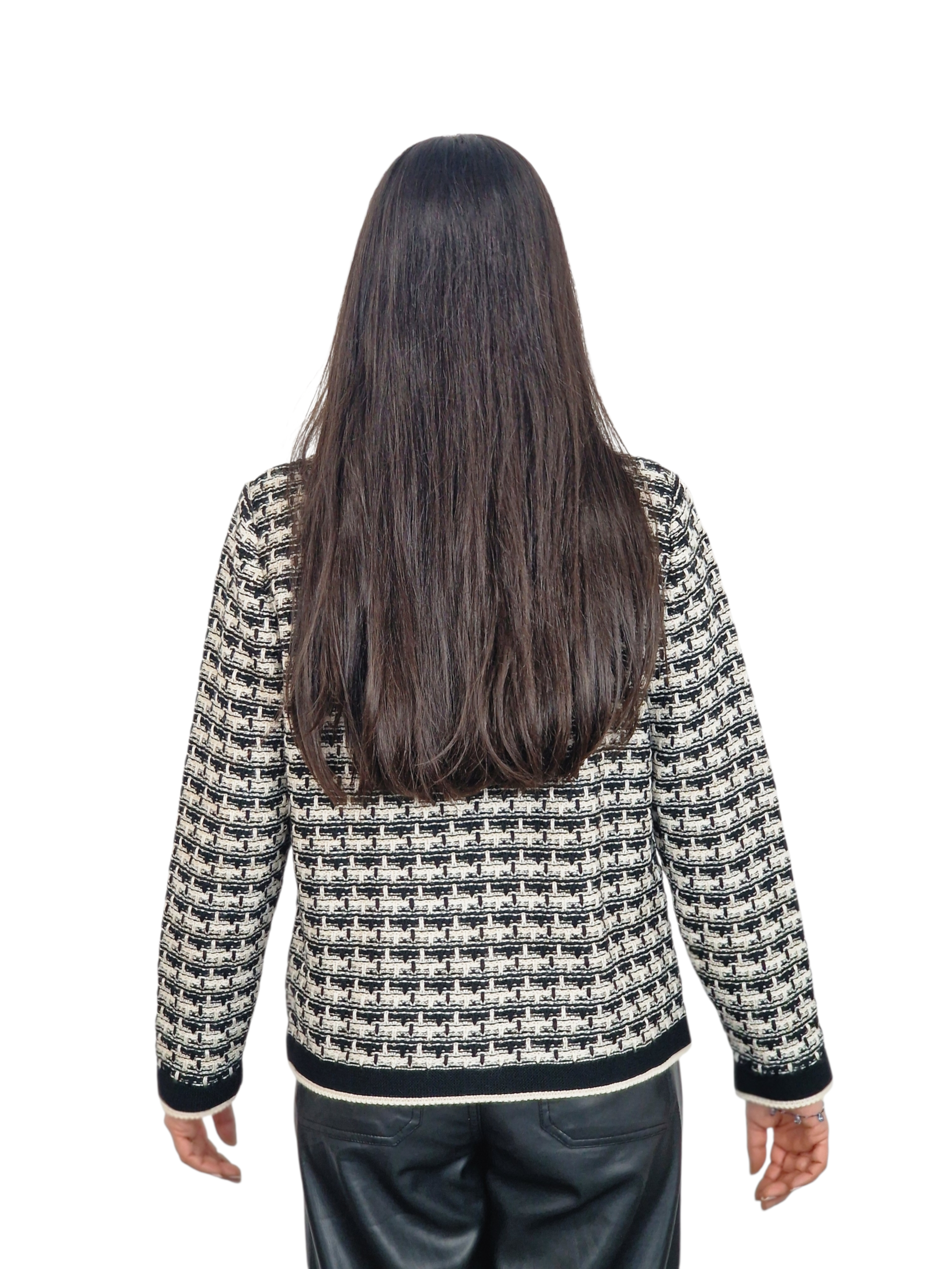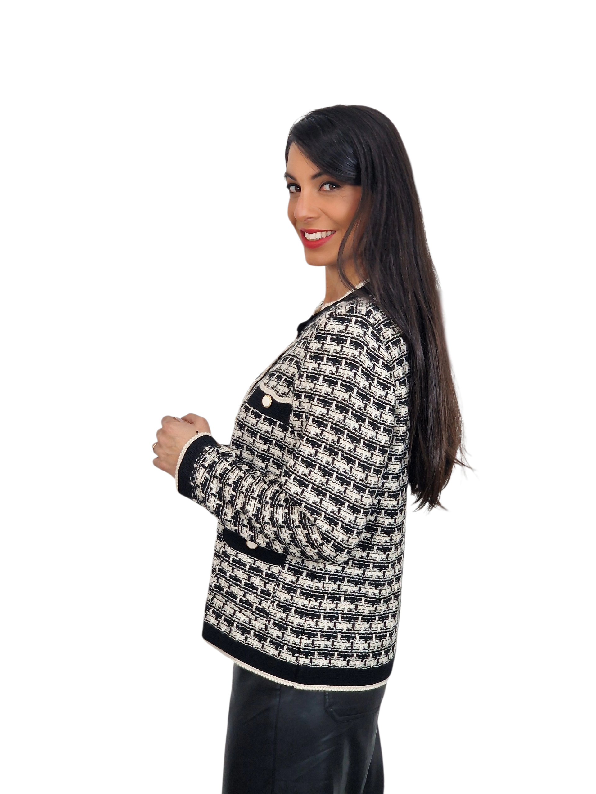 Chaqueta de punto tipo chanel. Mezcla en crudo y negro, bolsillos taflón y botones dorados.Disponible en negro y en marrón.