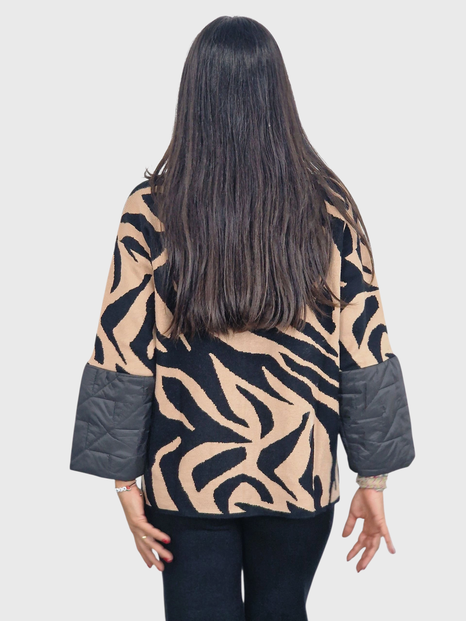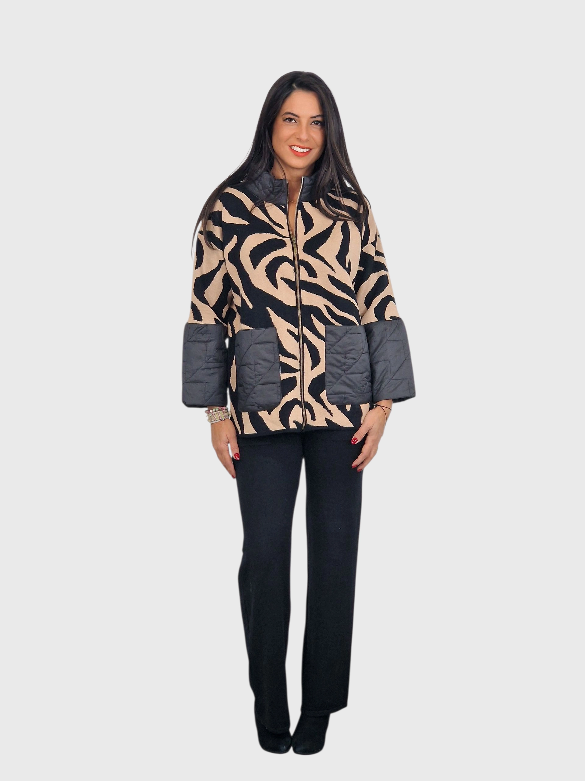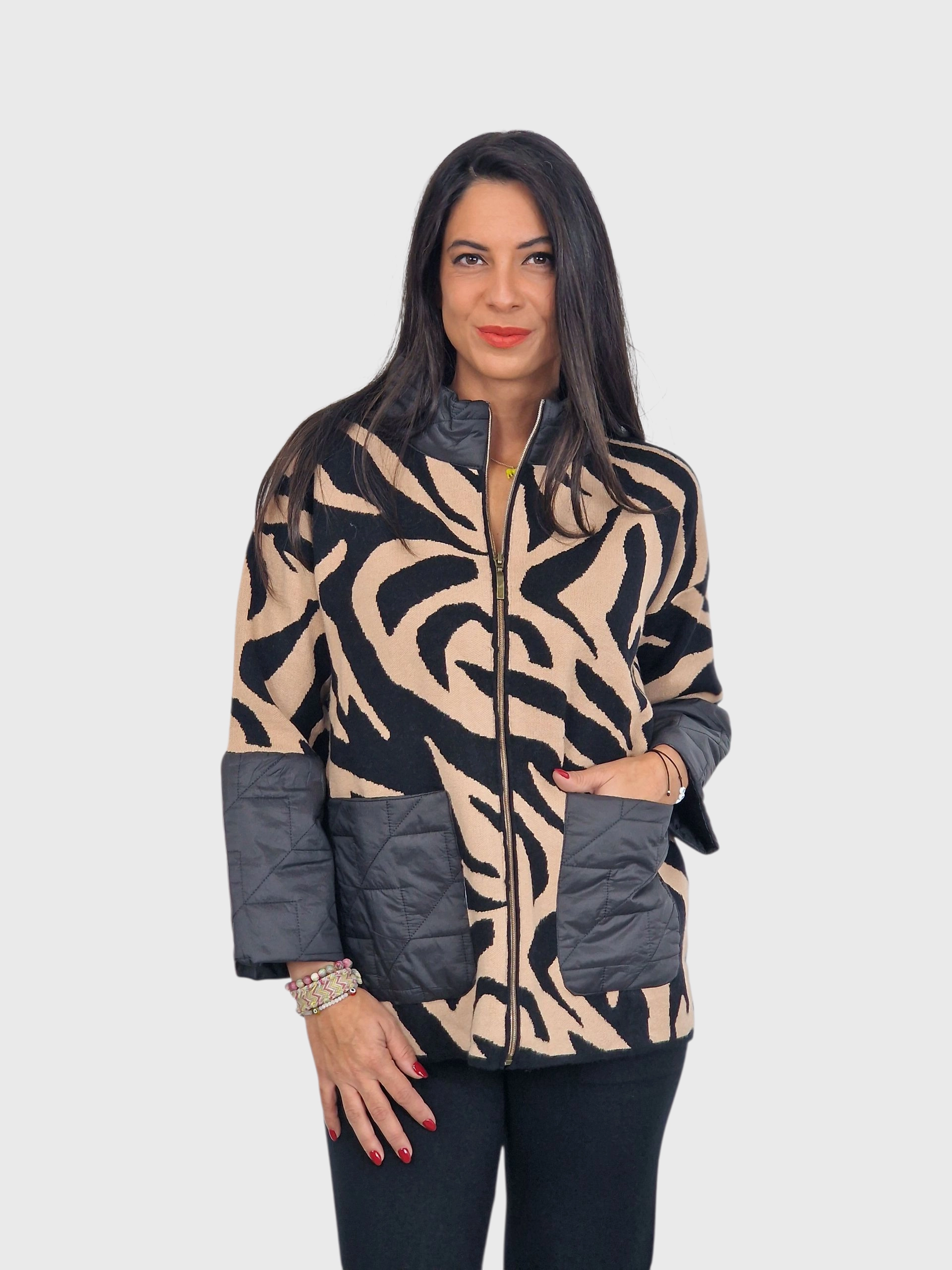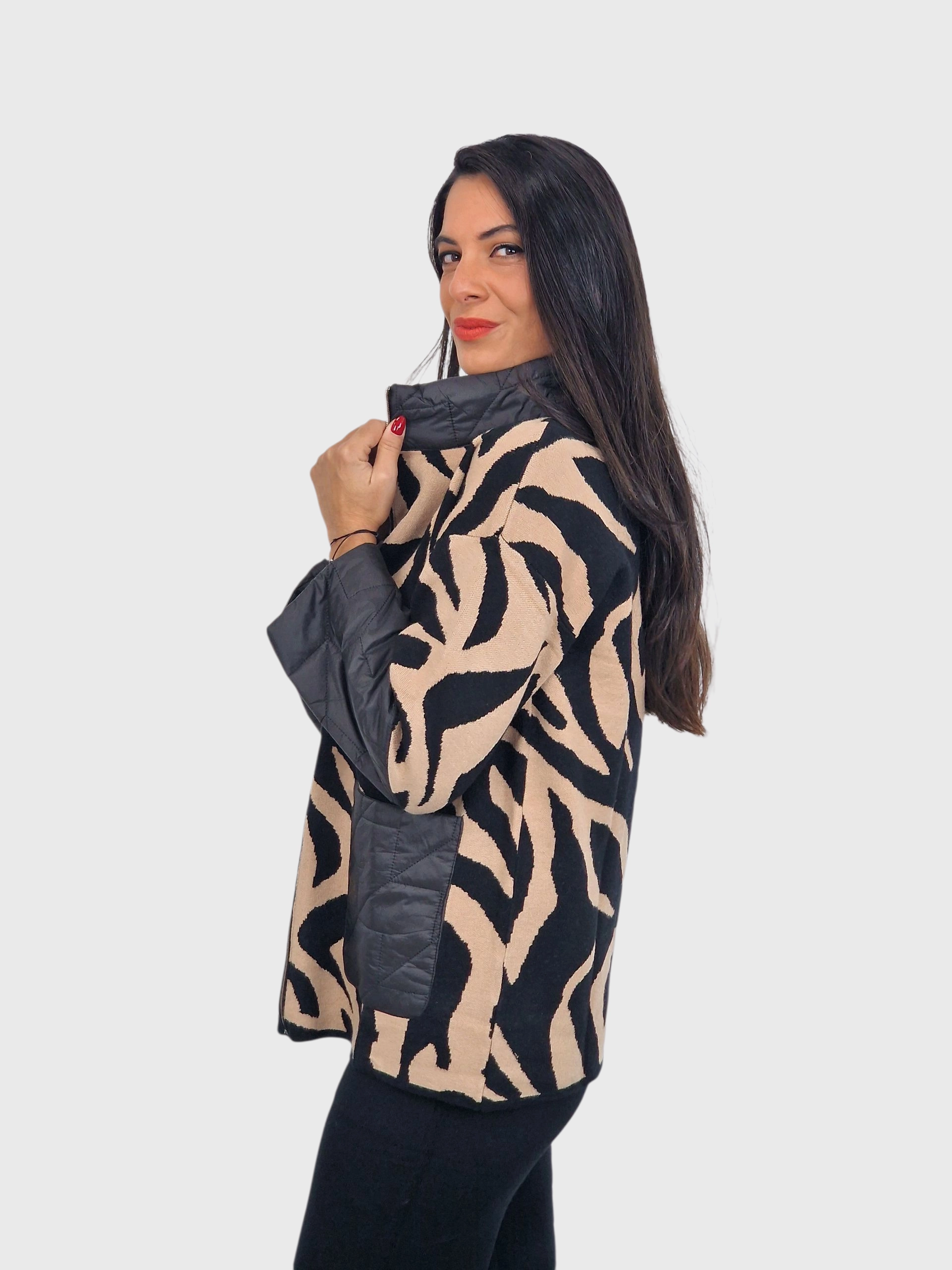 Chaqueta animal print, con cuello alto, bolsillos taflón y manga de codo a muleca en tejido impermeable y cuerpo en punto.