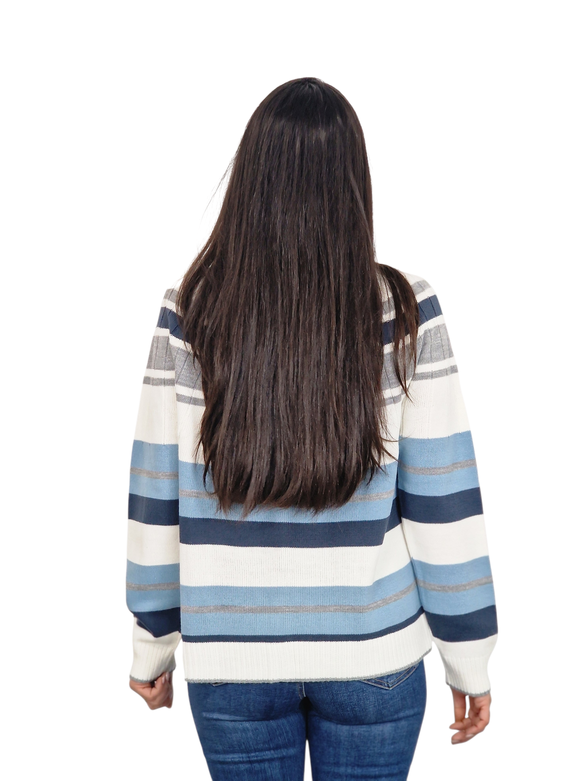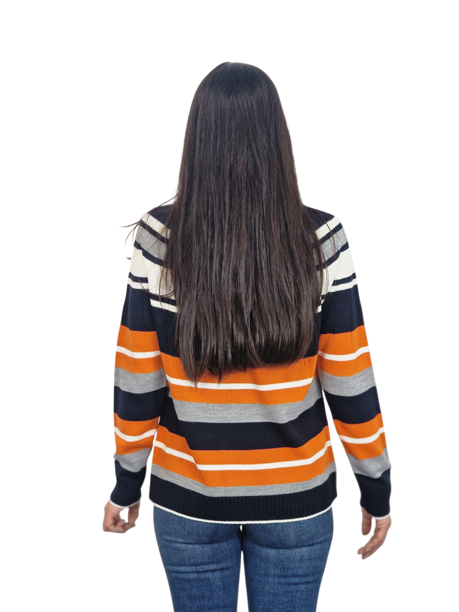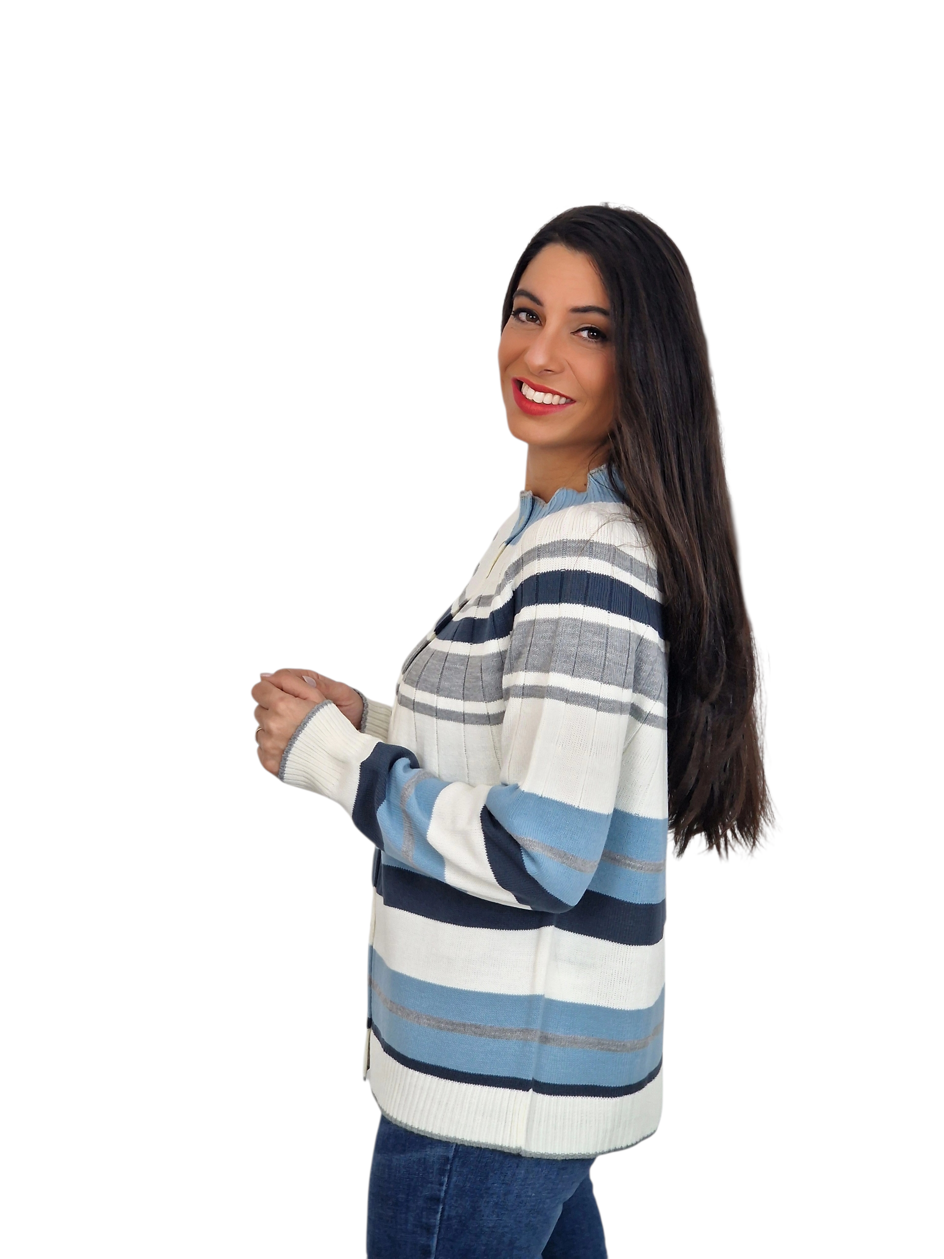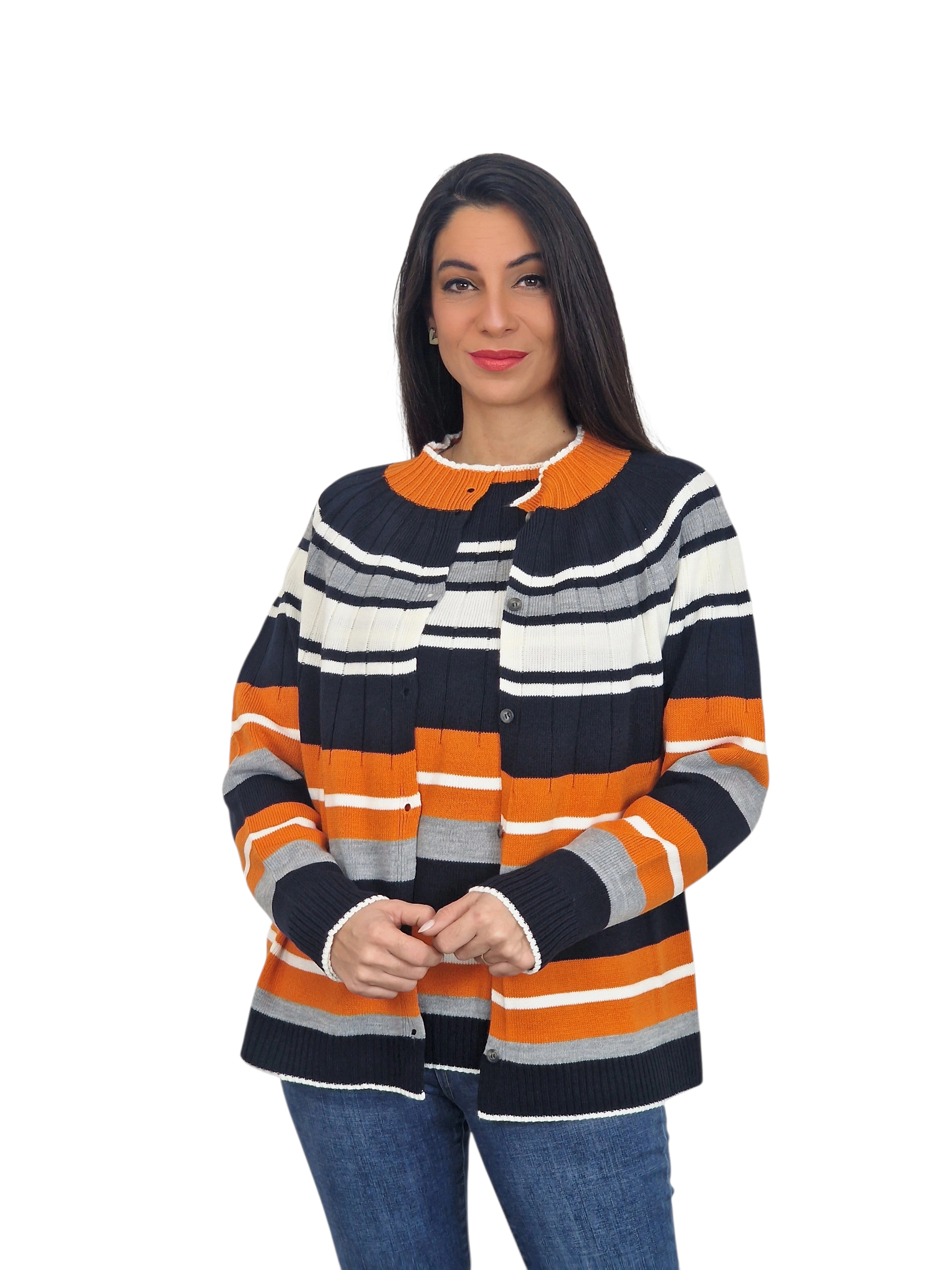 Chaqueta de punto con cuello redondo. Franjas horizontales. Disponible en marino, crudo y pruma. Suéter a juego.
