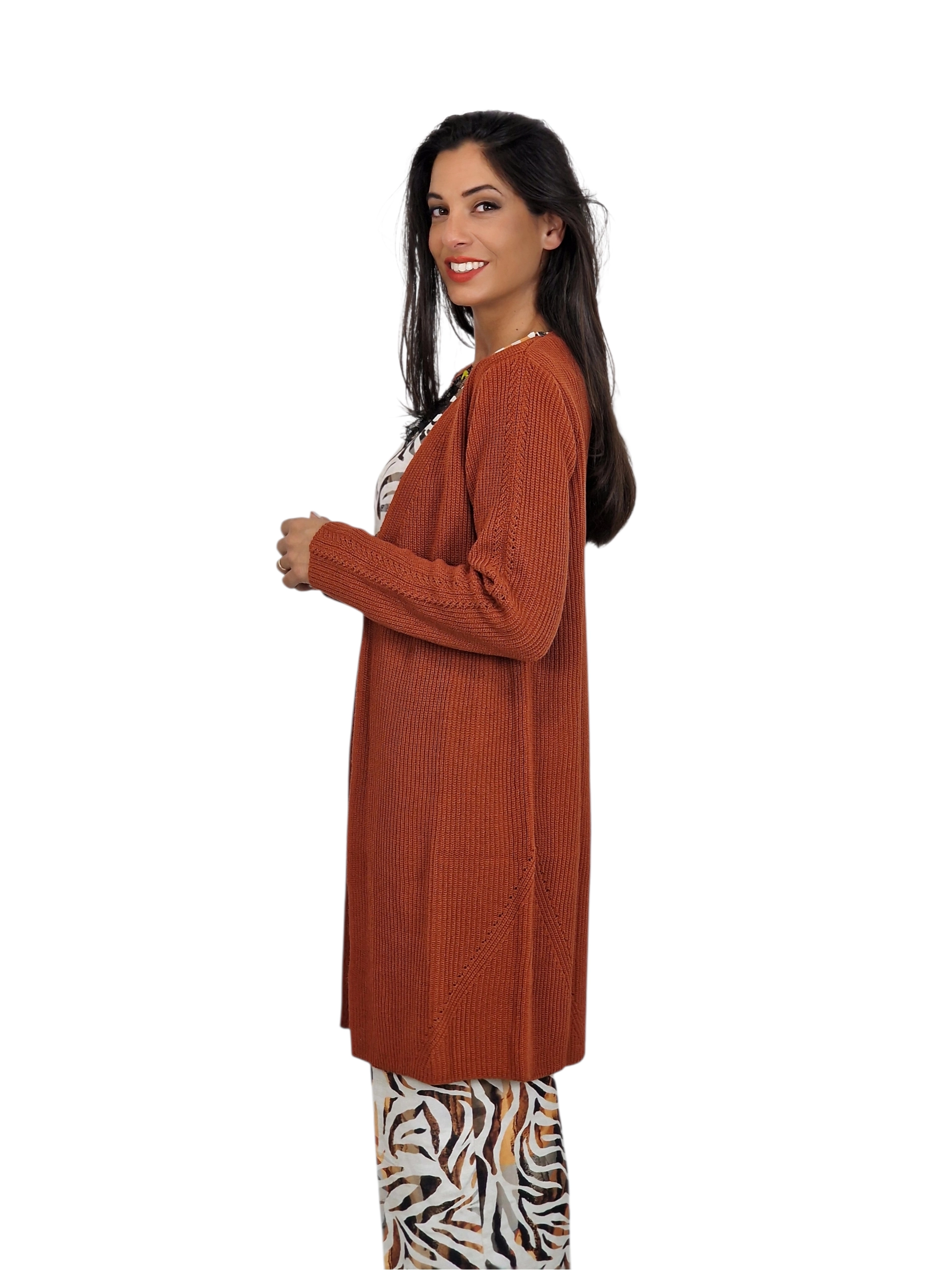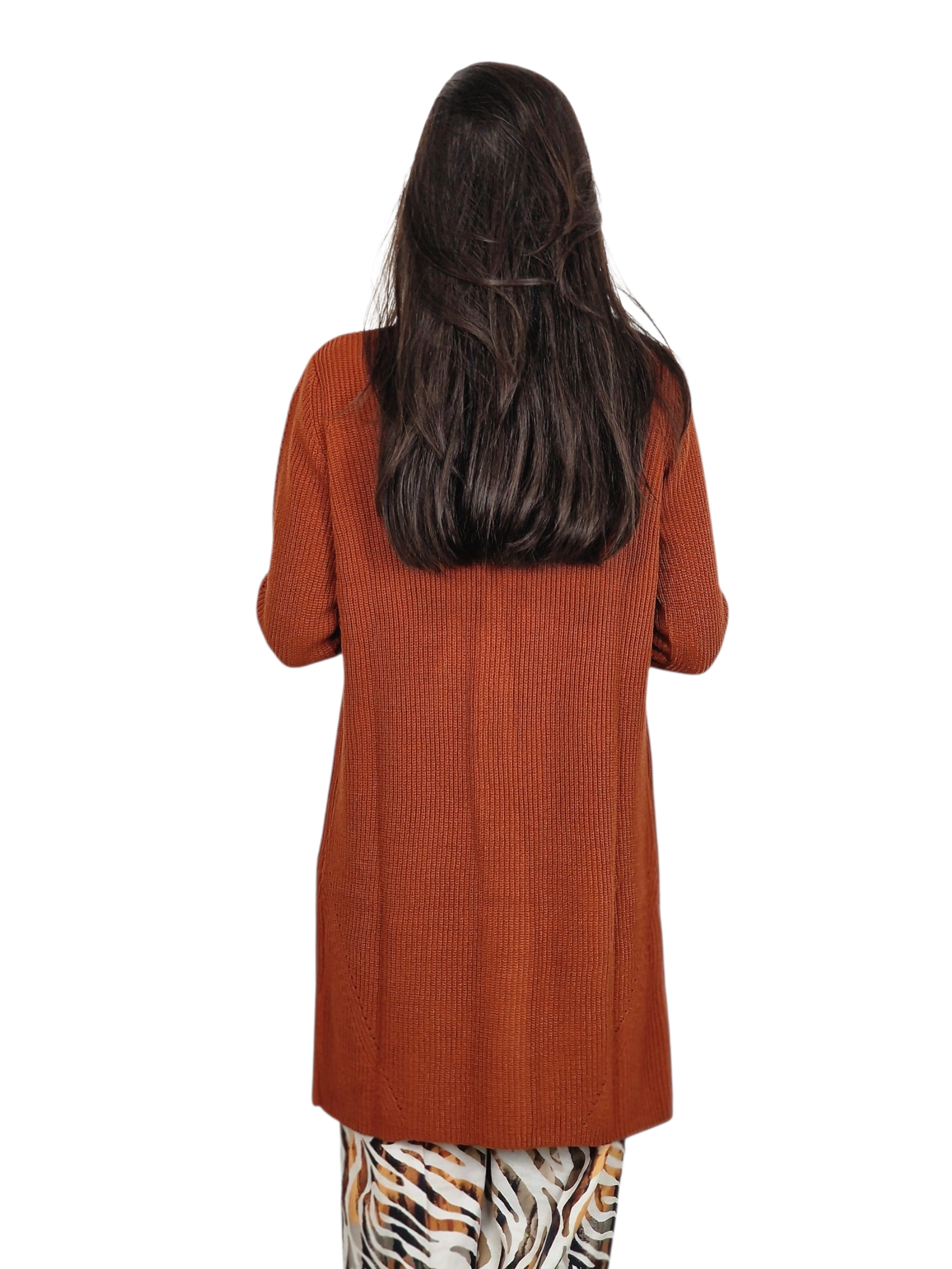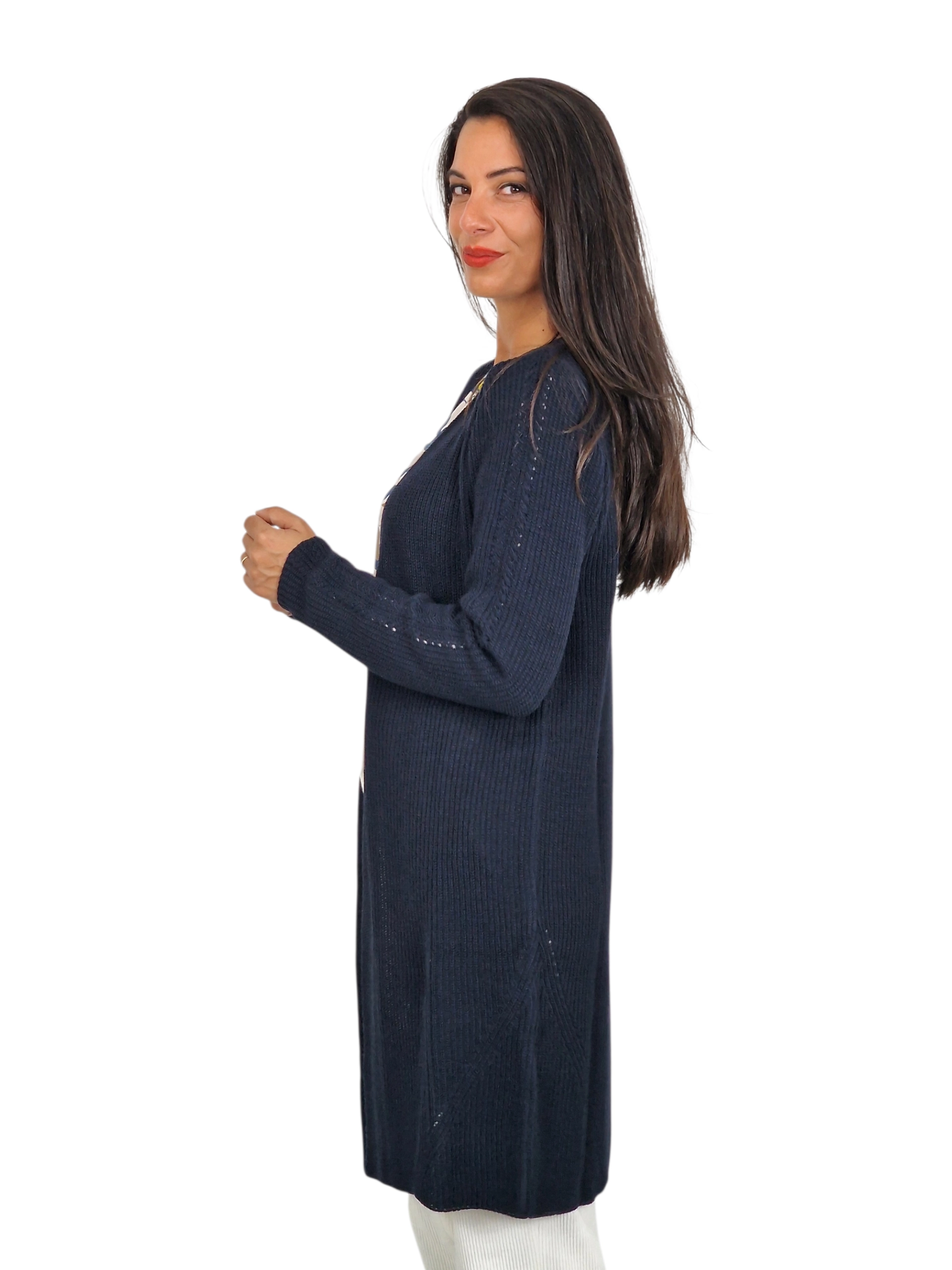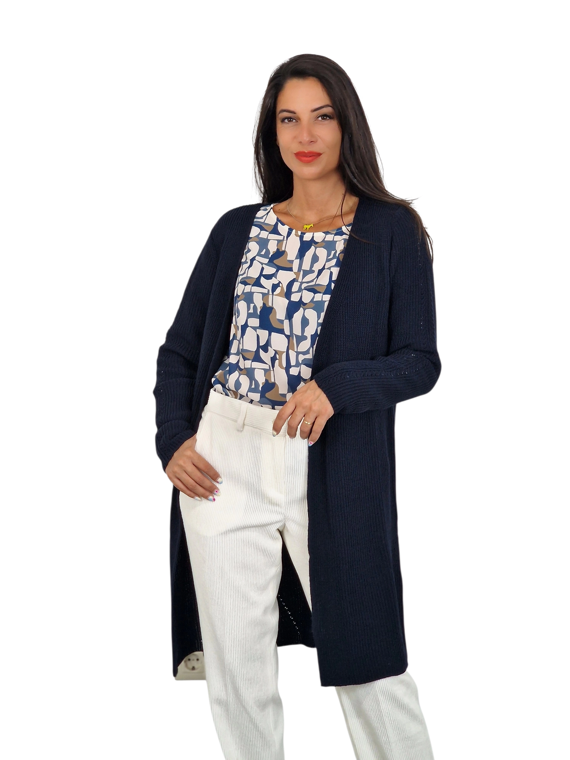 Chaqueta de punto larga sin botones.Disponible en marino, tostado y caramelo.