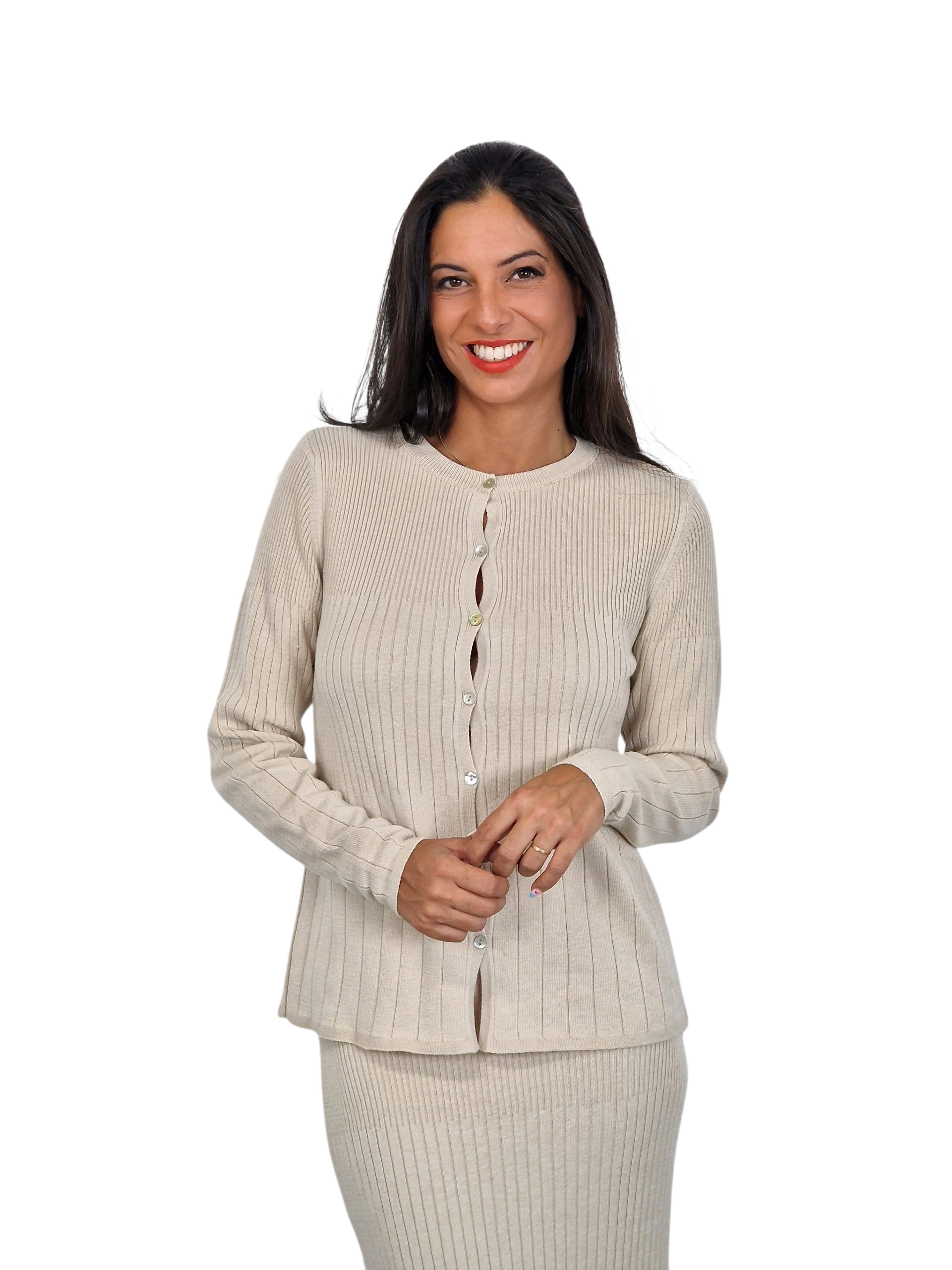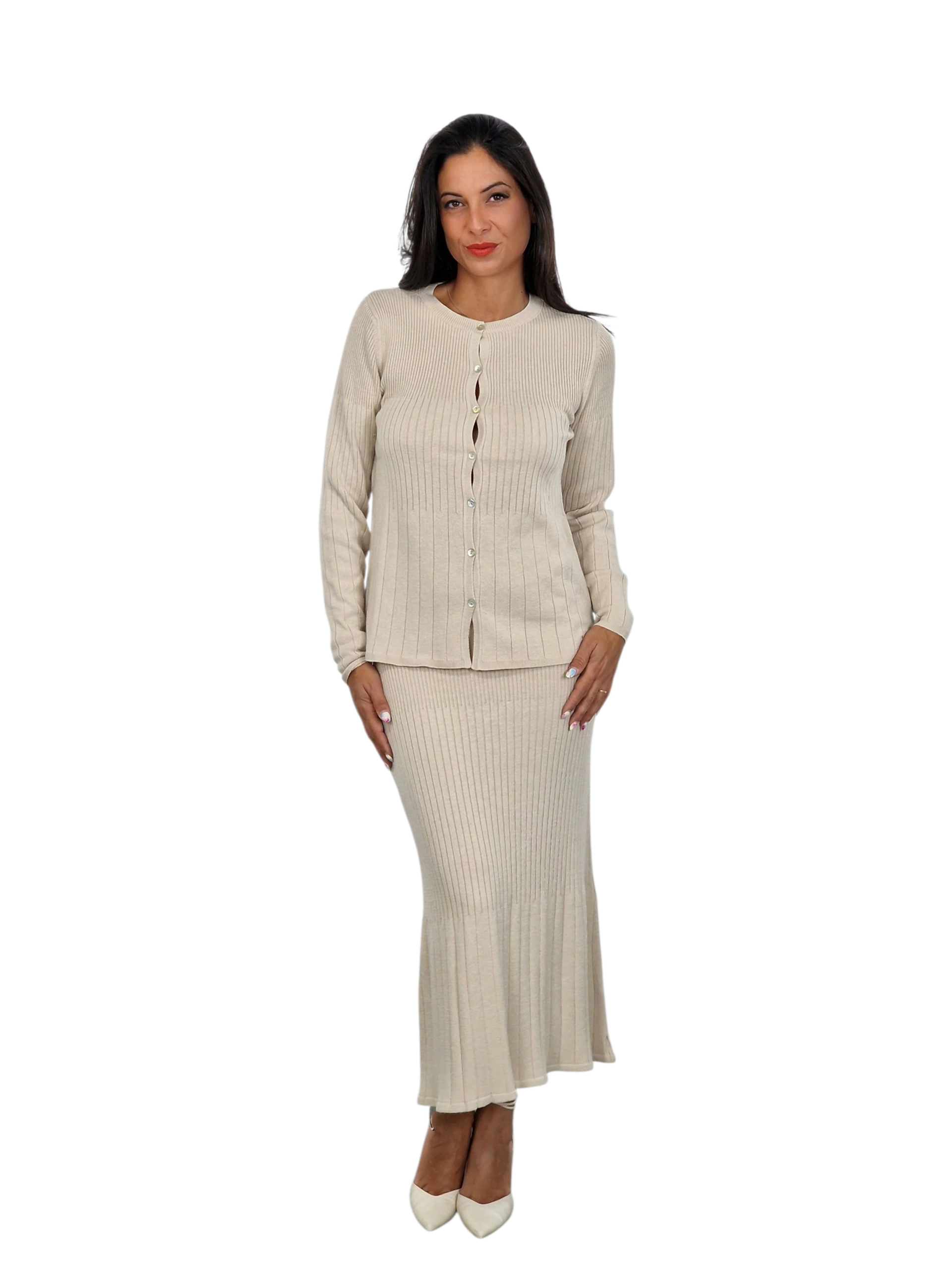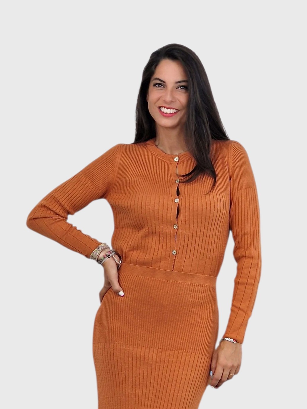Chaqueta de punto corta con cierre con botones. A conjunto con una falda con ref. O3159. Conjunto disponible en color arena y teja.
