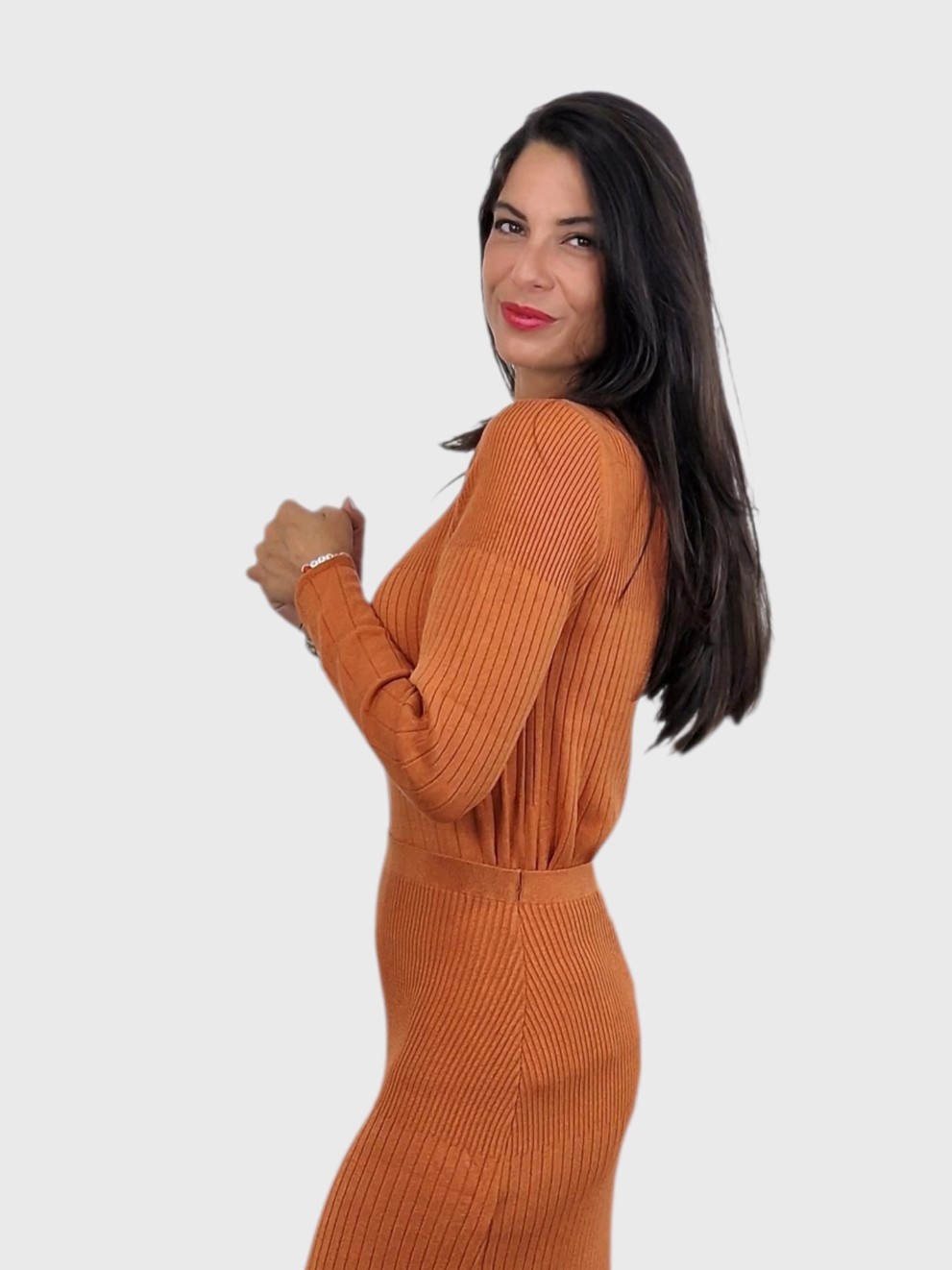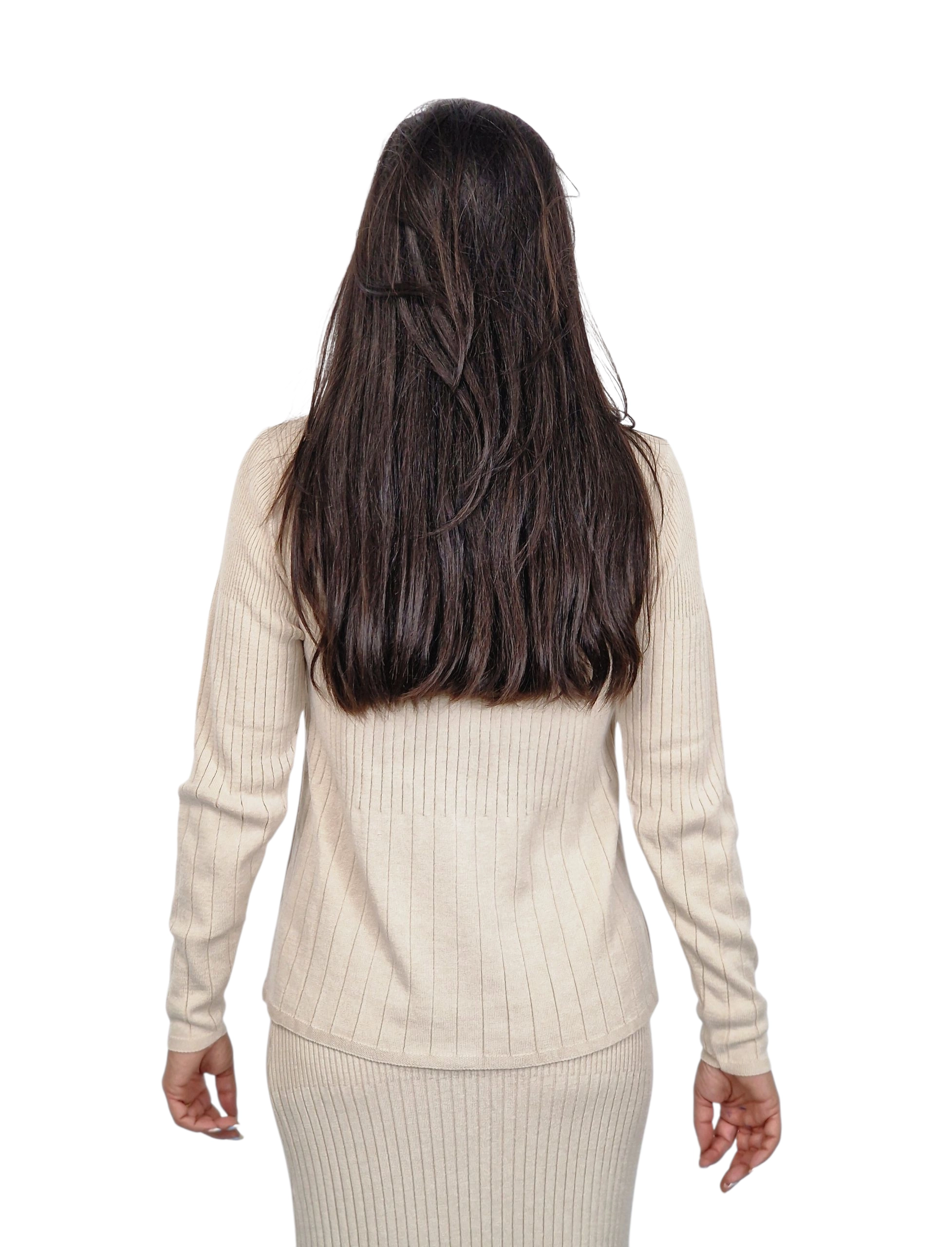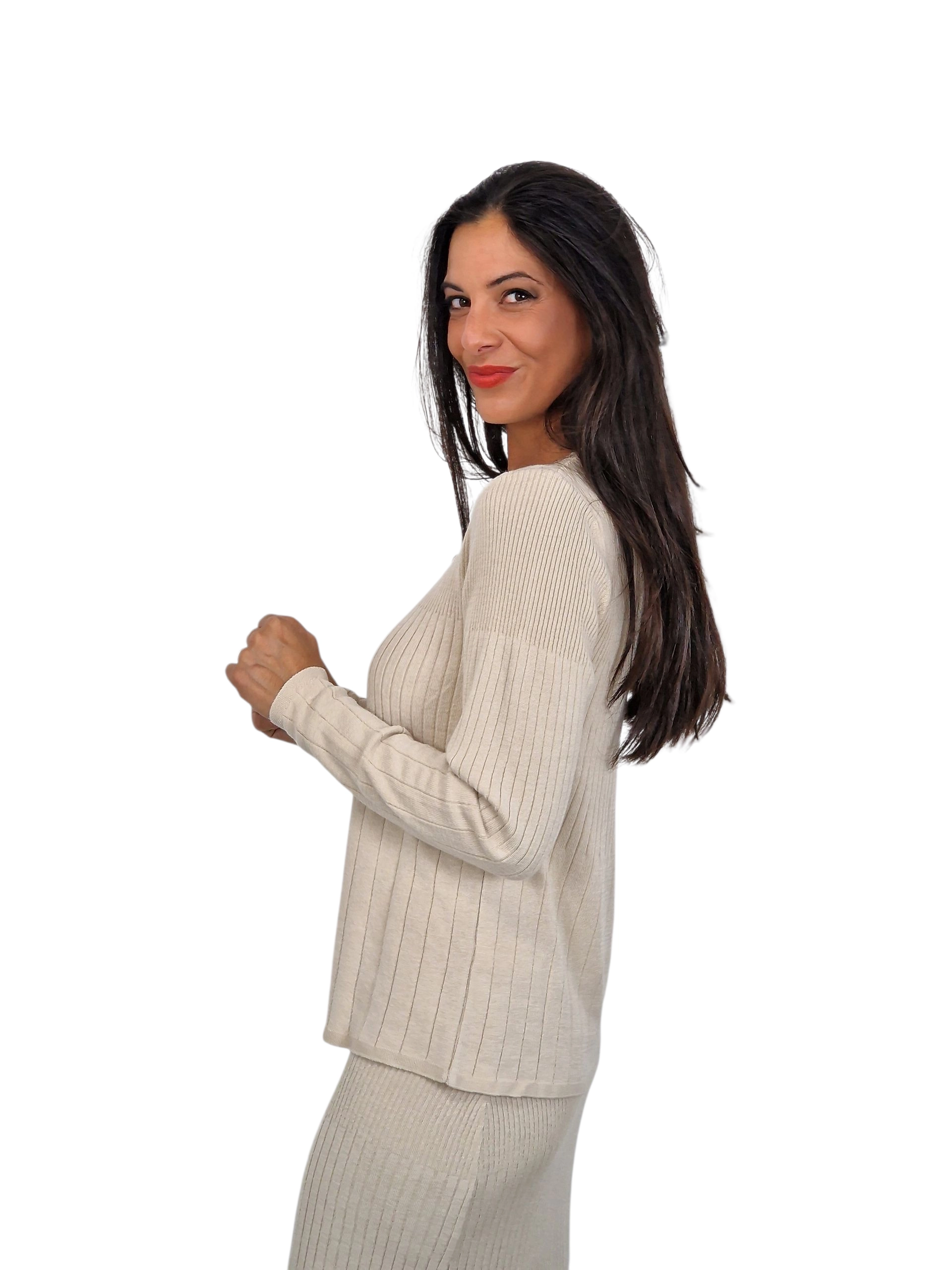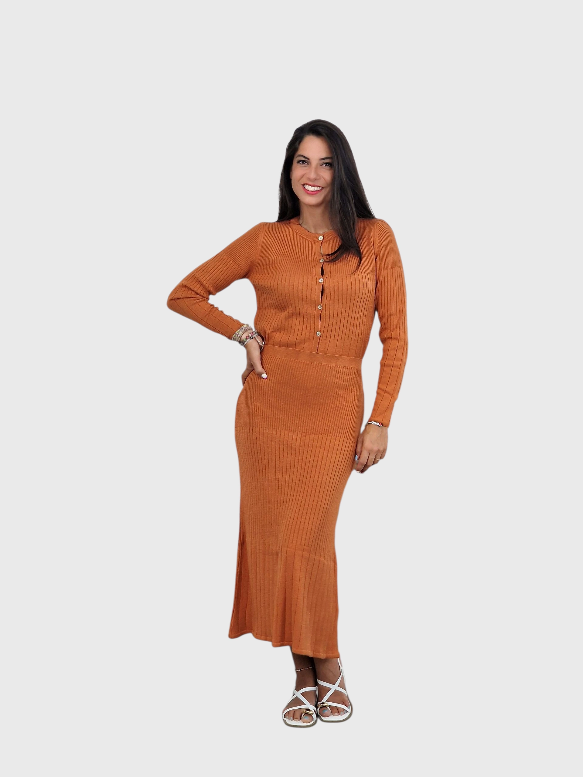 Chaqueta de punto corta con cierre con botones. A conjunto con una falda con ref. O3159. Conjunto disponible en color arena y teja.
