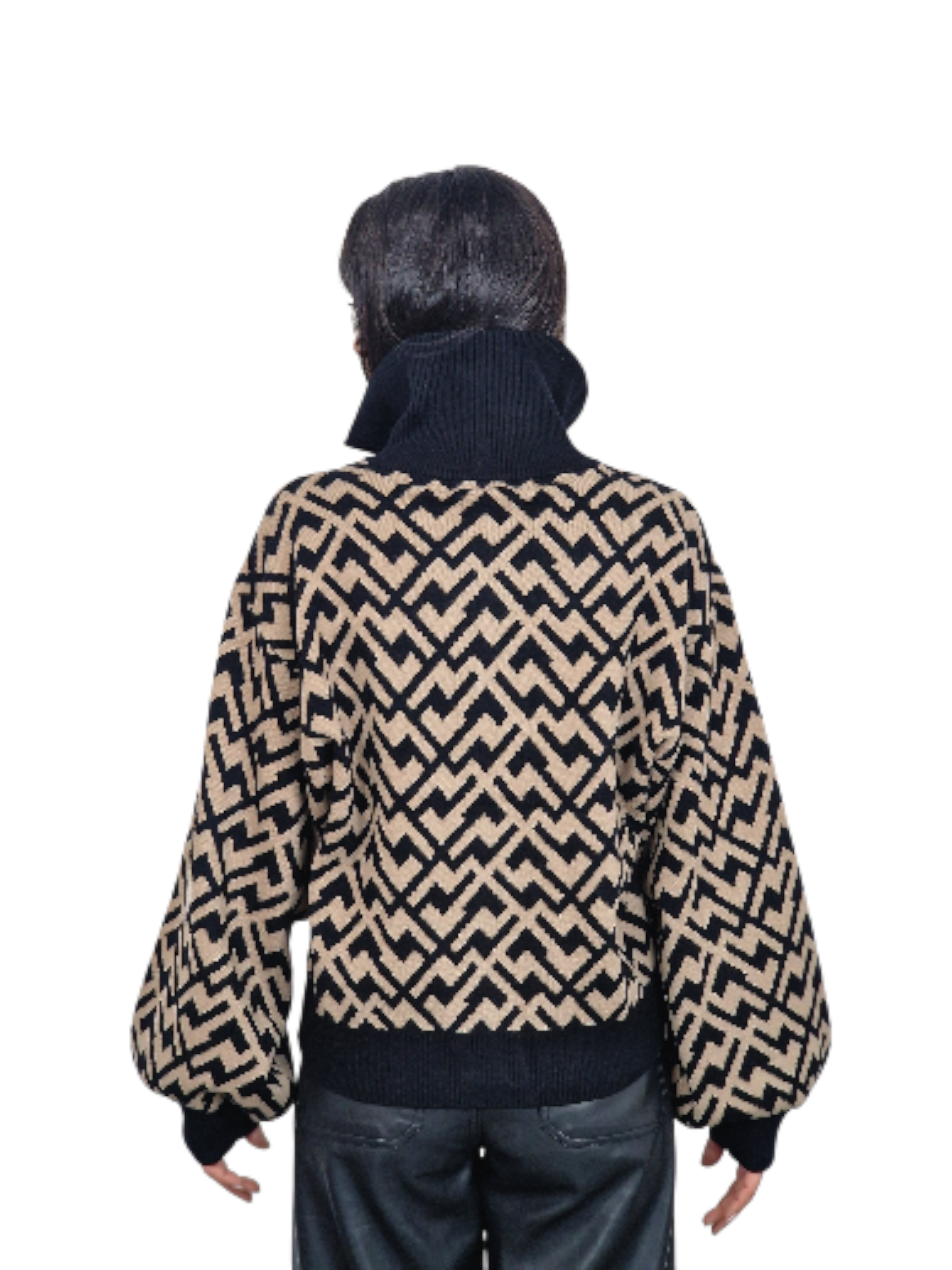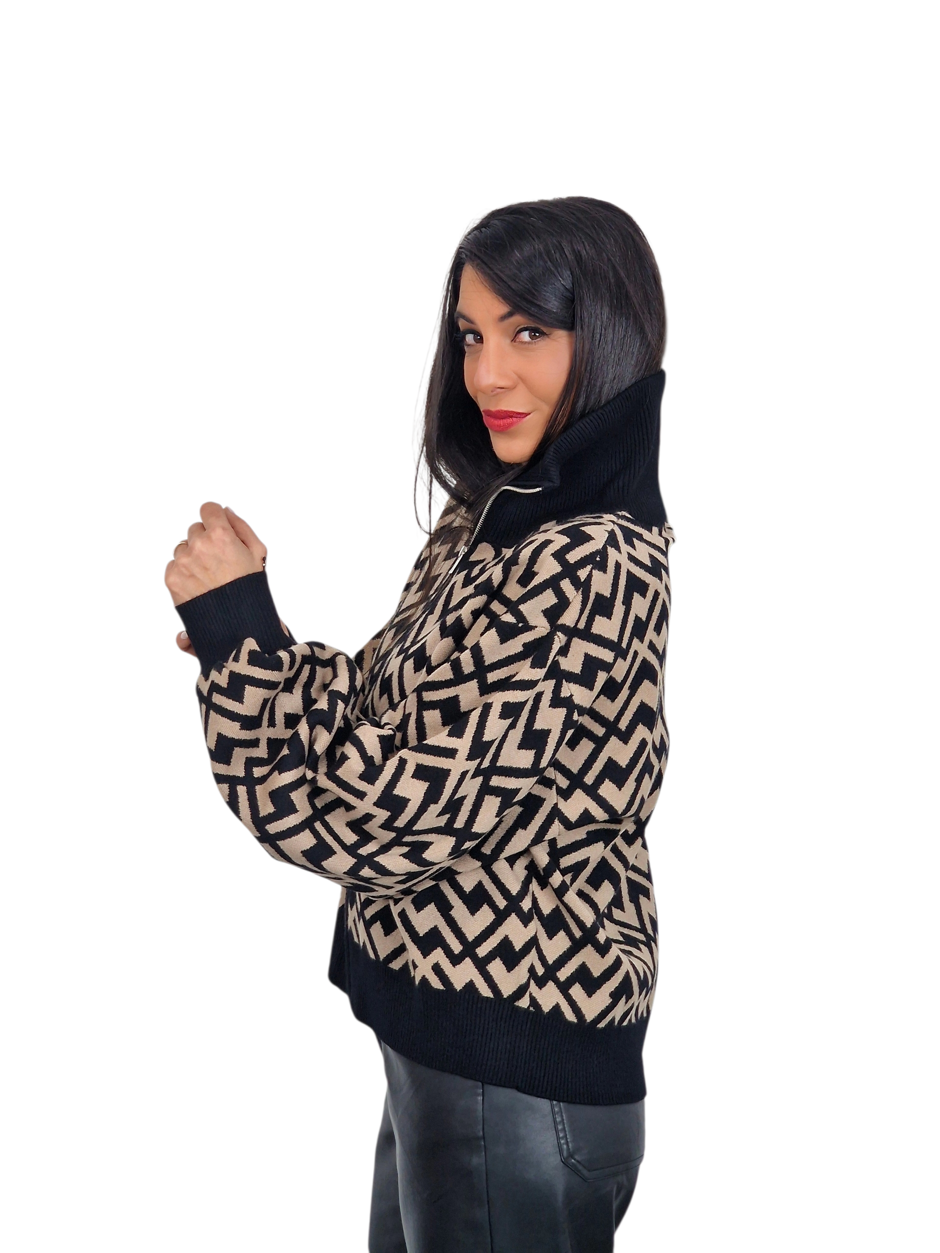Chaqueta de punto con cremallera dorada, cuello subidos, puños elásticos en mangas creando efecto abombado. Estampado en zigzag. Disponible en negro y en marrón.