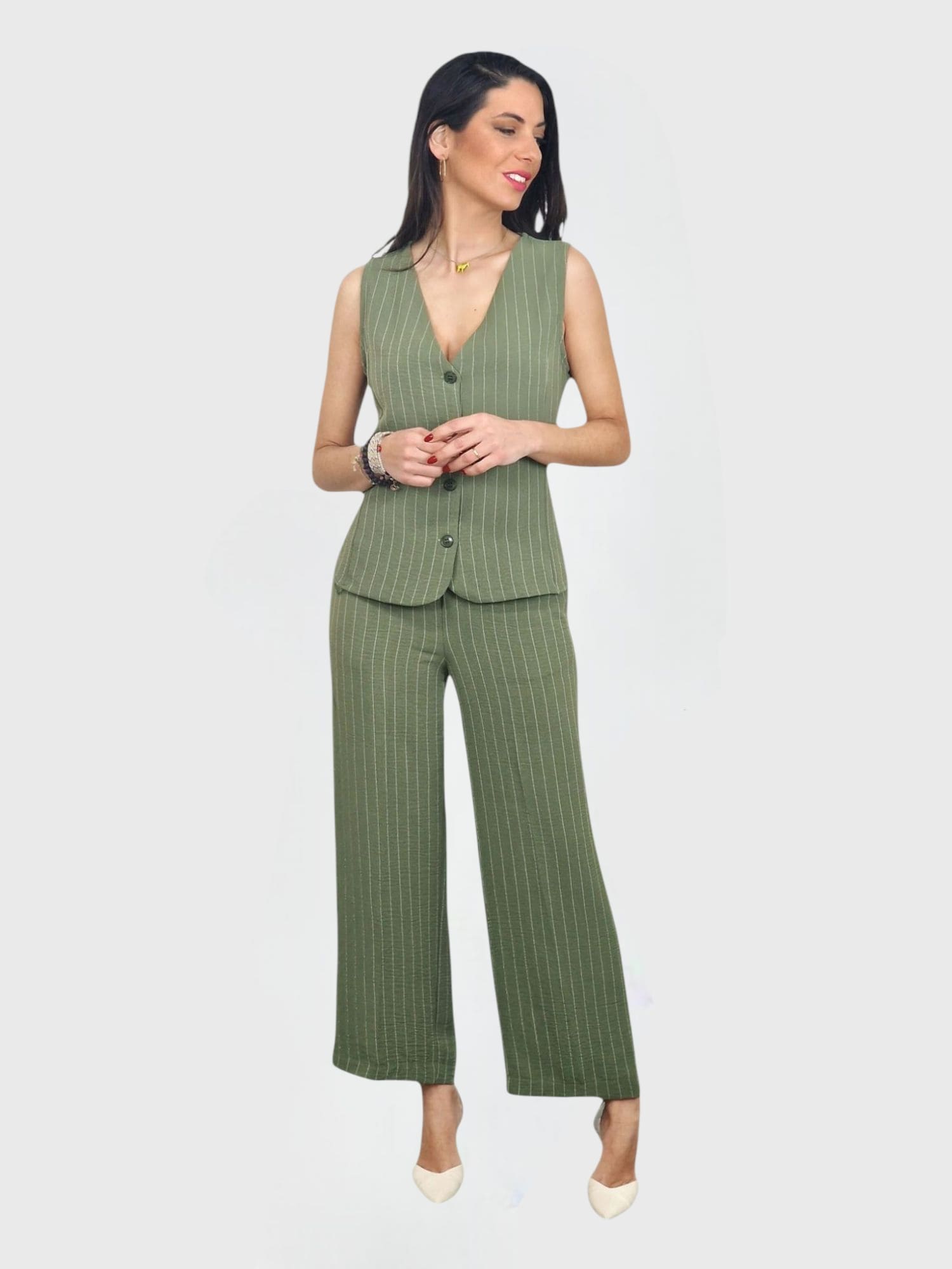 Conjunto con con raya diplomática. Chaleco con botones delanteros y trabilla trasera para ajustarlo. A juego con un pantalón palazzo tobillero. Disponible en azul marino y verde kaki.