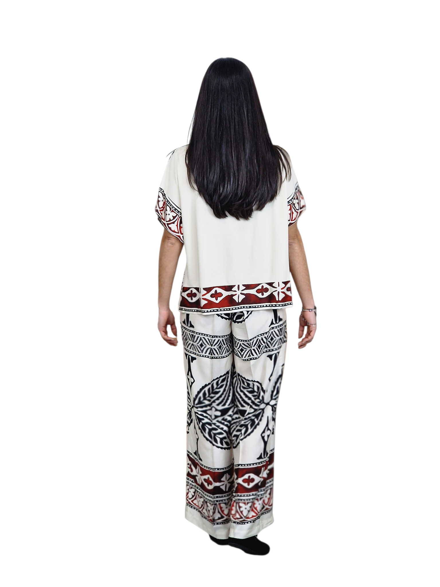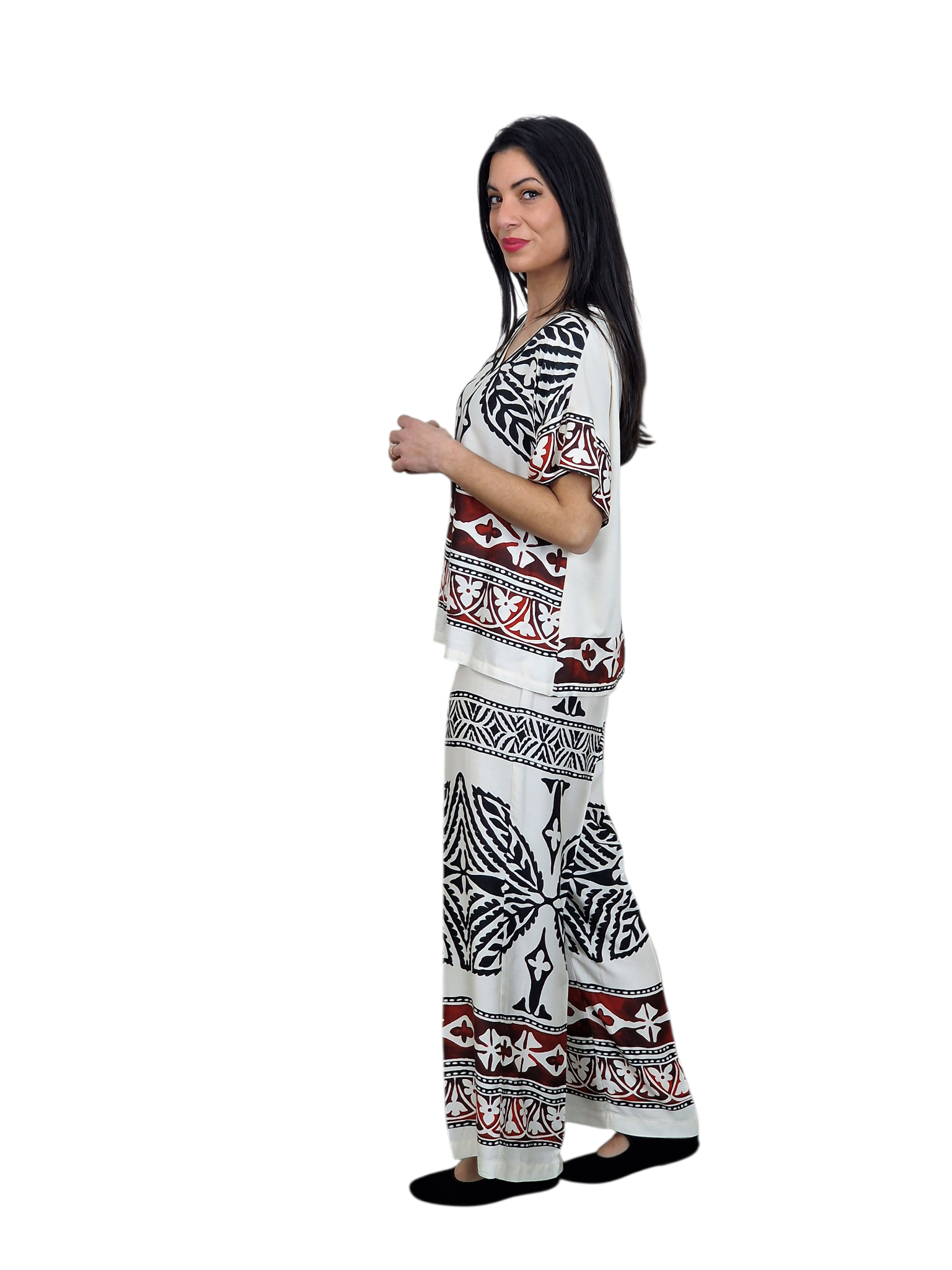 Conjunto dos piezas, camiseta y pantalón , tejido estampado fluído.