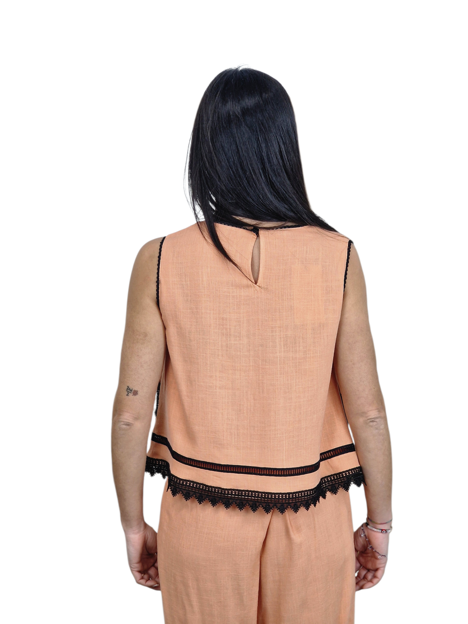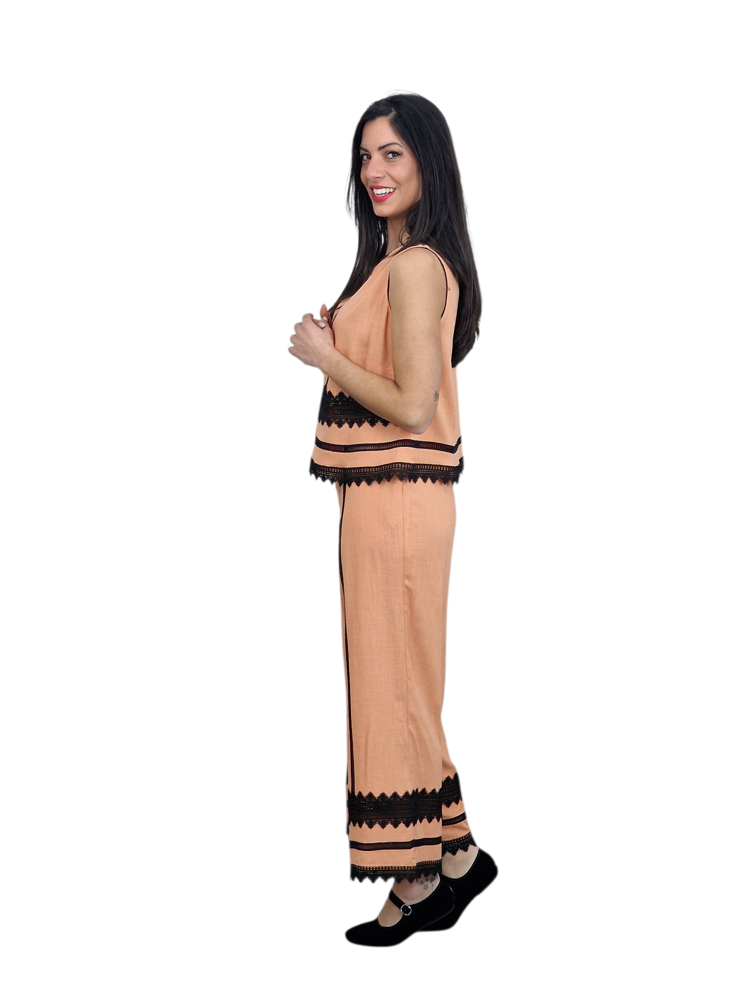 Conjunto de pantalón y top. Tejido tipo lino adornado con puntillas en bordes y también incrustadas. Disponible en salmón y en verde kaki.
