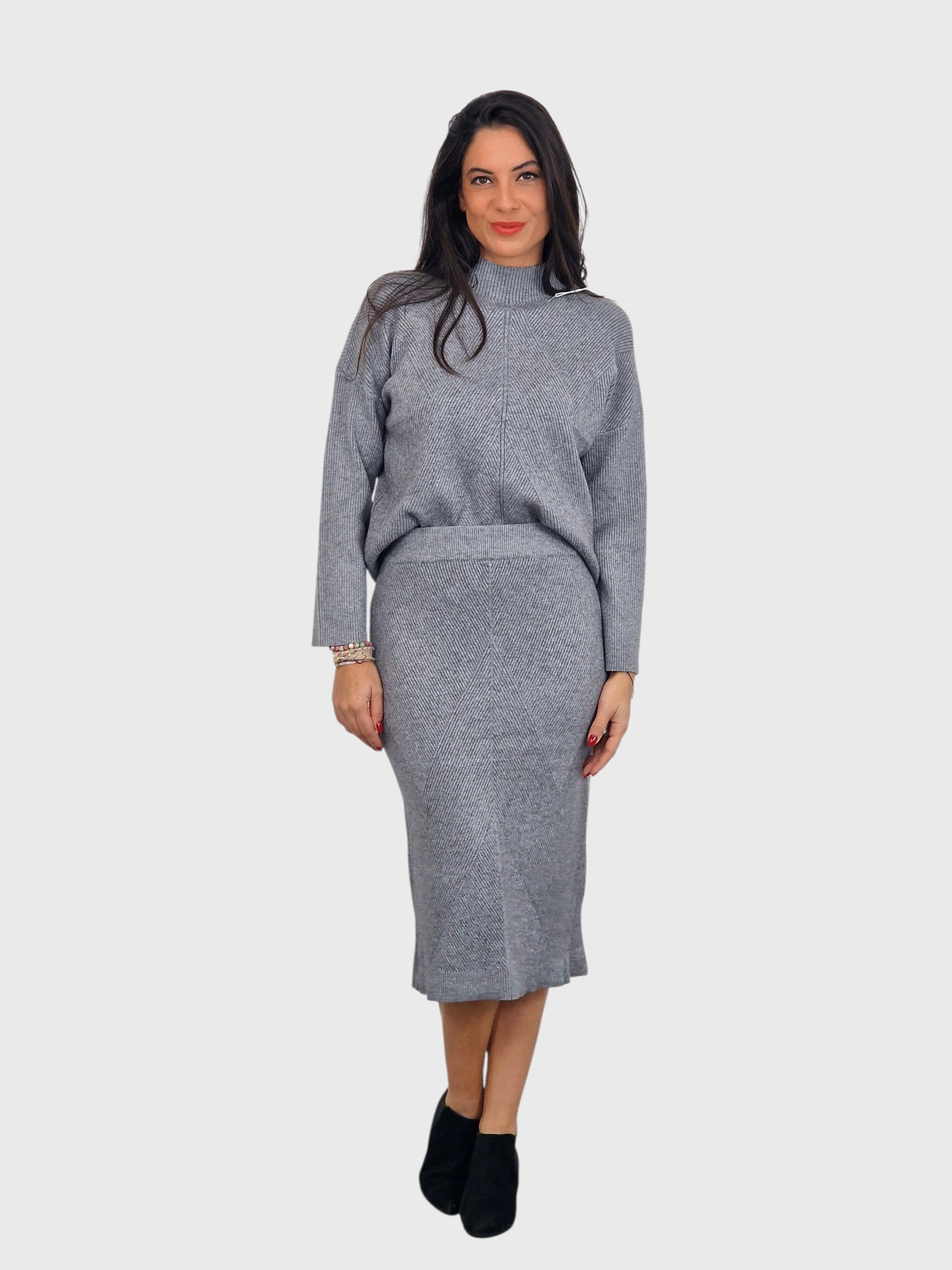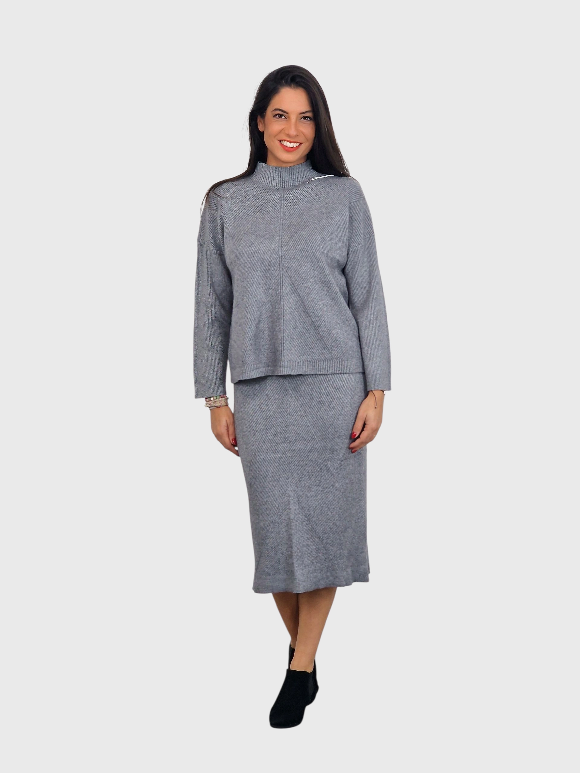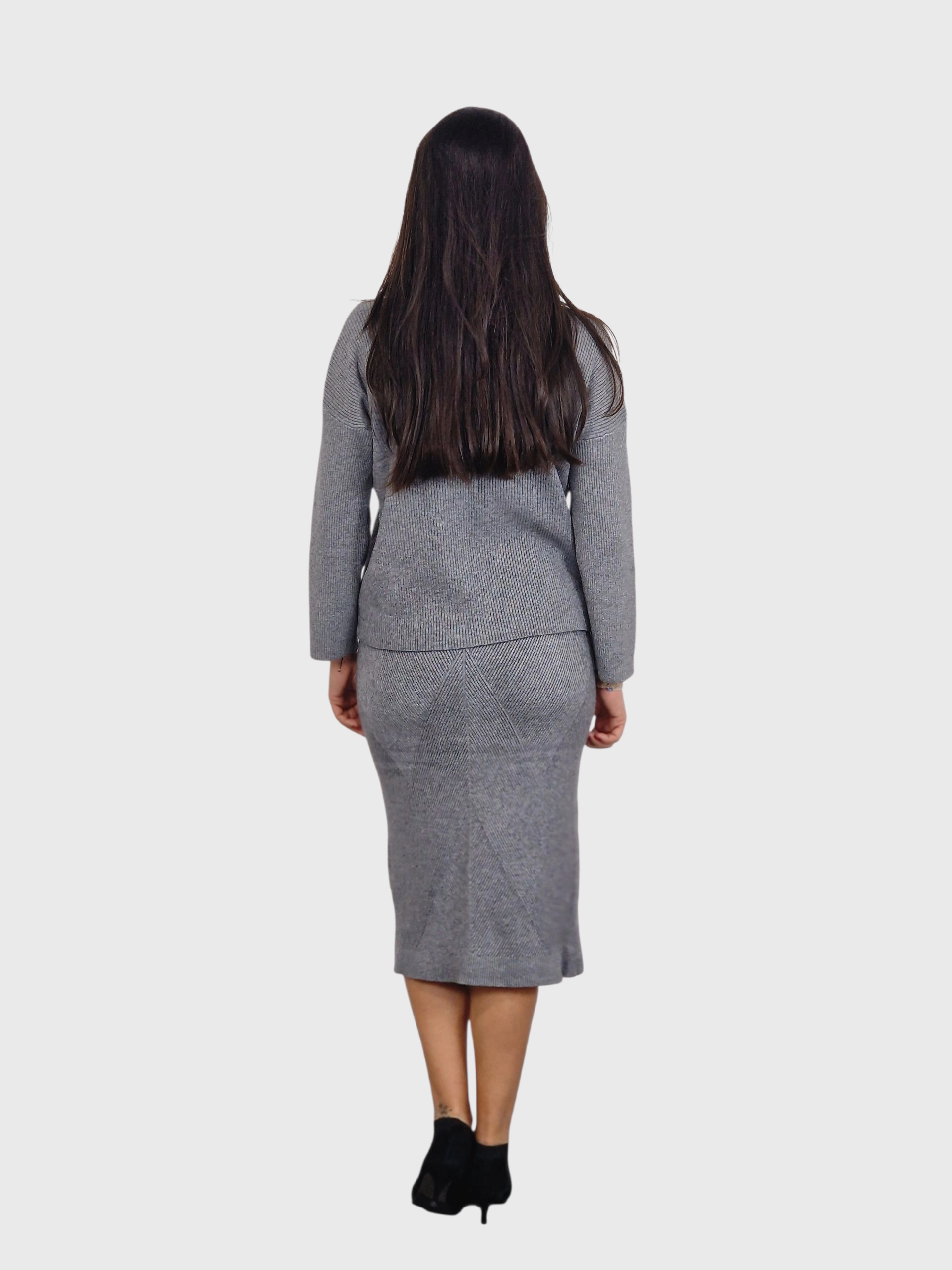 Conjunto de suéter y falda de punto canalé. Disponible en negro, gris medio, verde kaki y pruma.