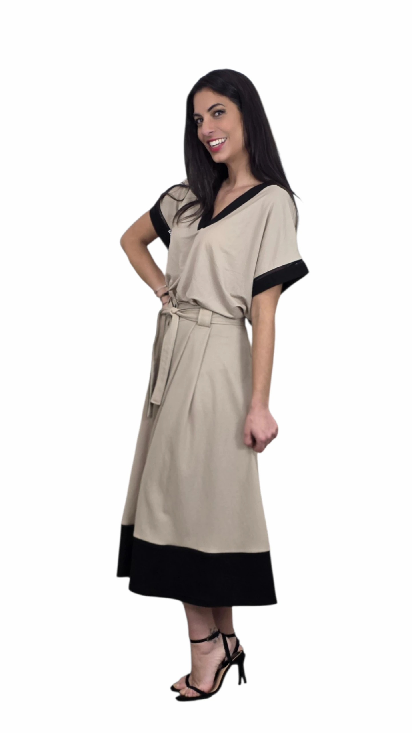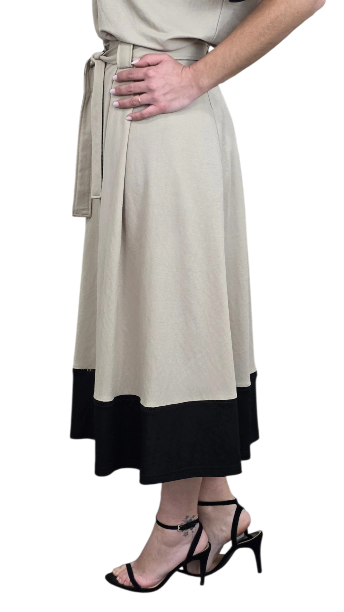 Falda acamapanada con botones a lo largo de toda la parte frontal. con bolsillos y cinturón en mismo tejido. Cintura y bastilla en negro combinado con el color visón.