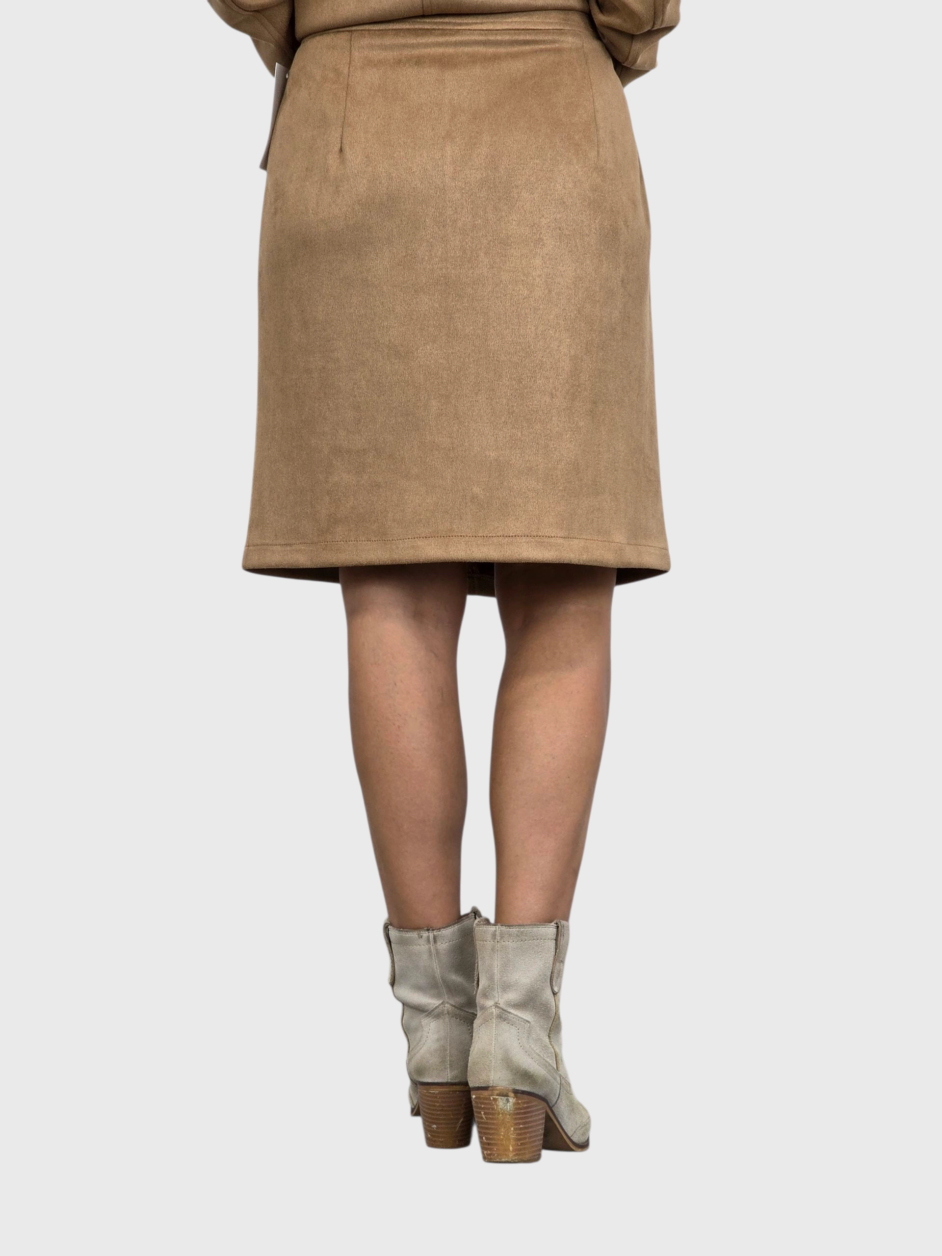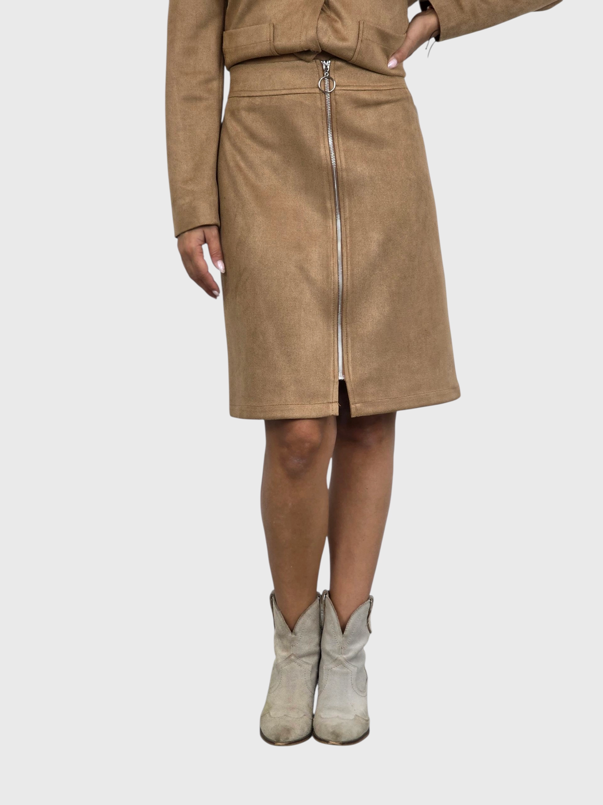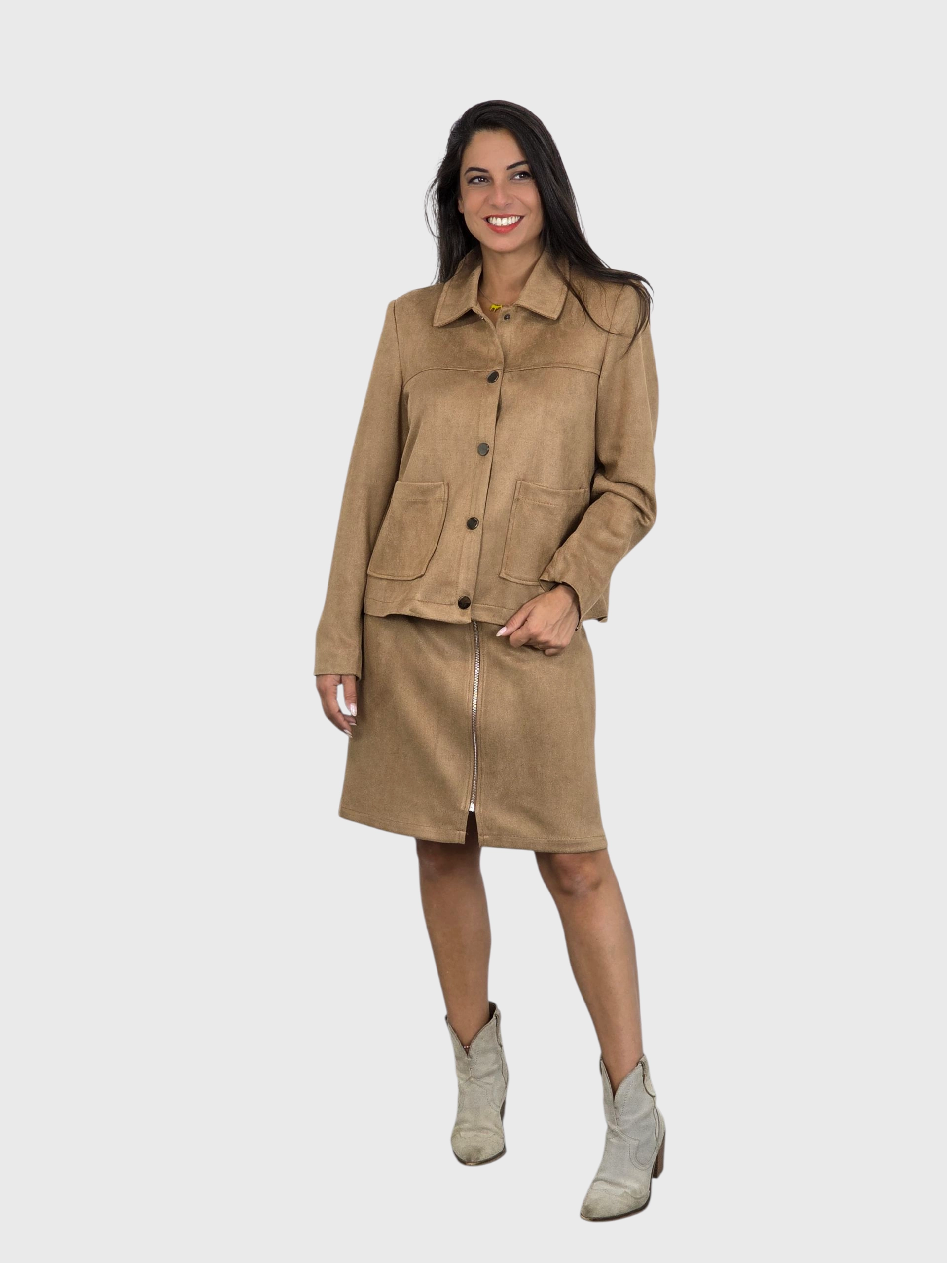 Falda corta de antelina con cremallera delantera. A juego con una chaqueta. Disponible en negro y camel.