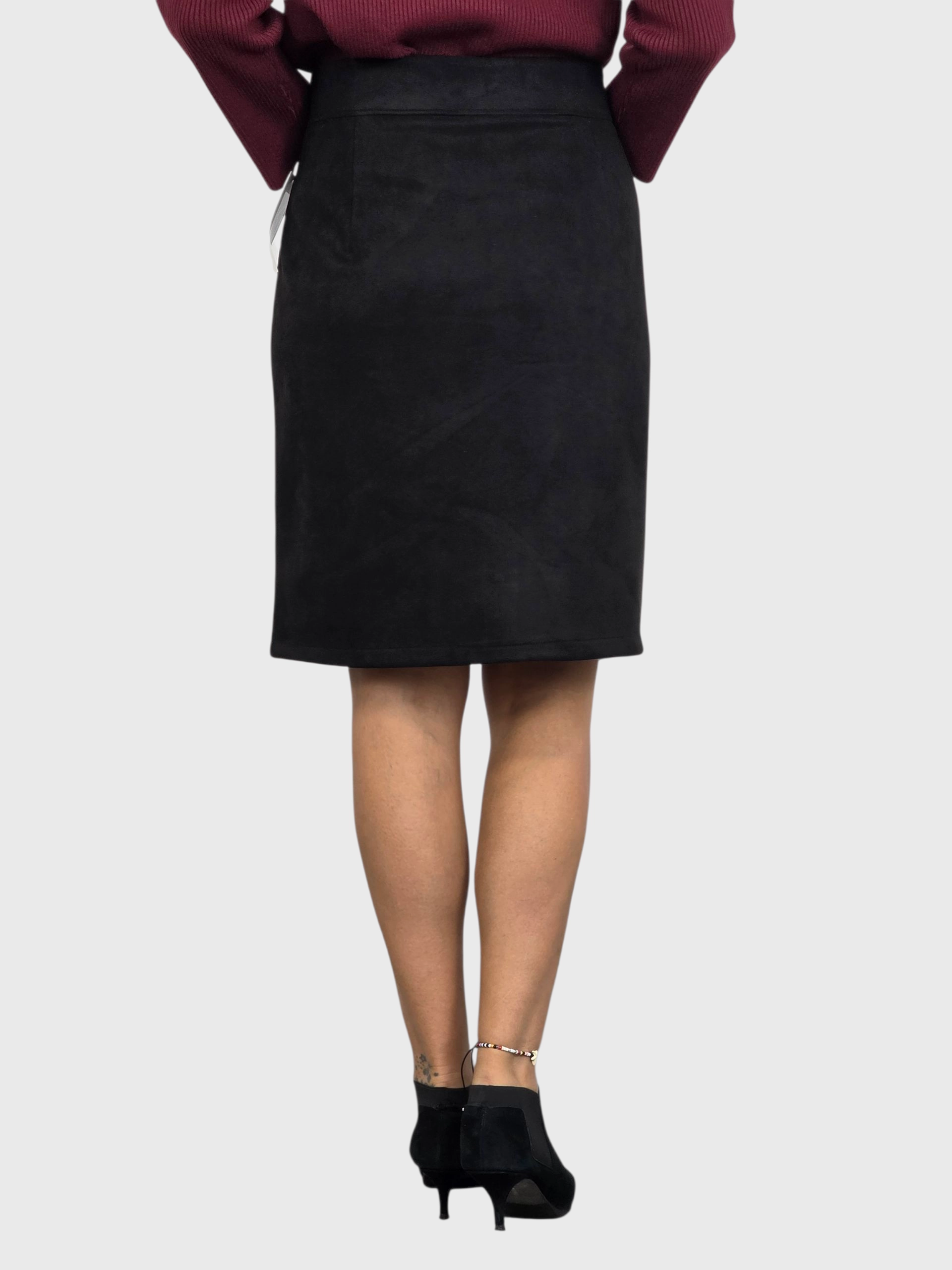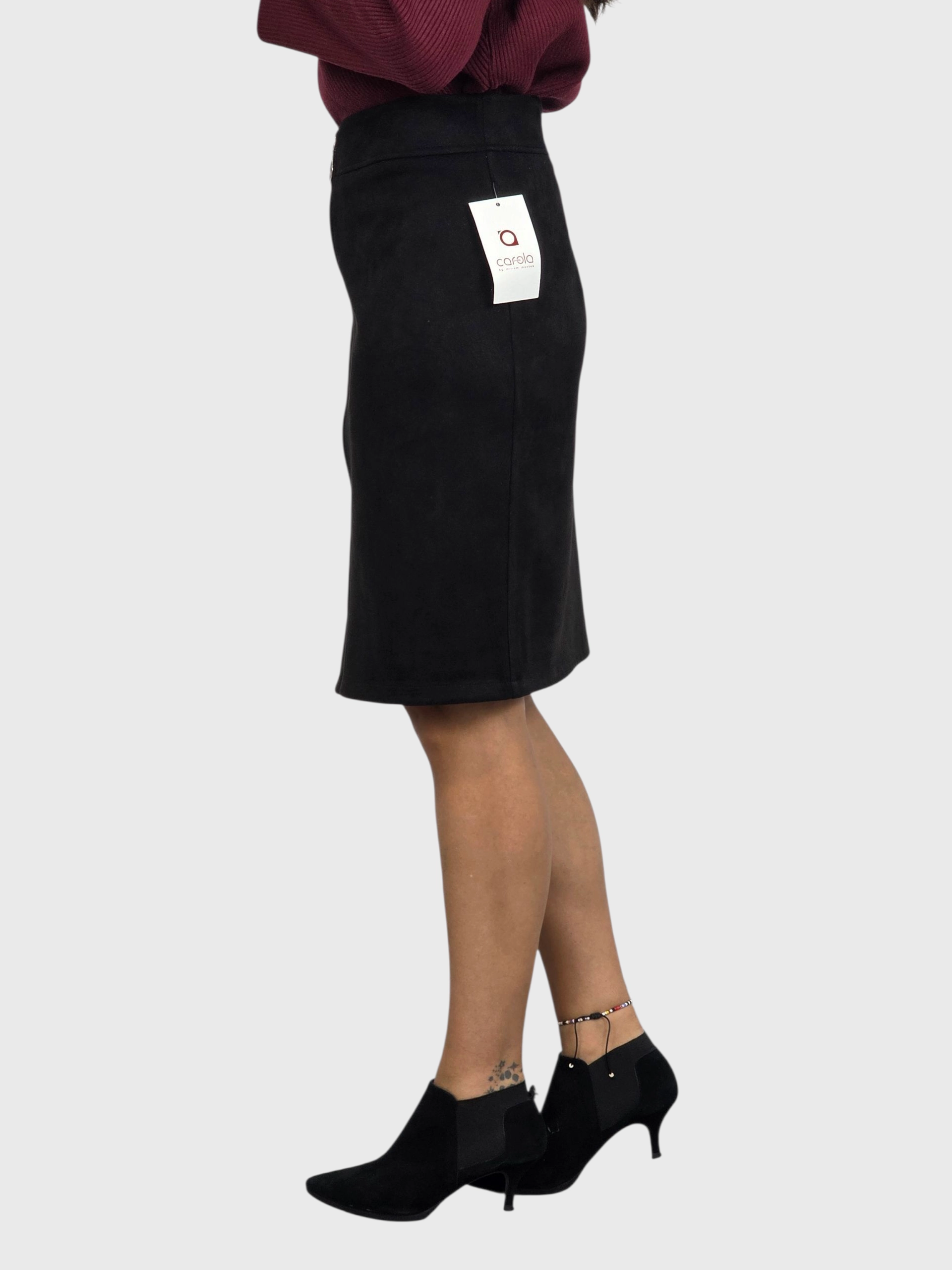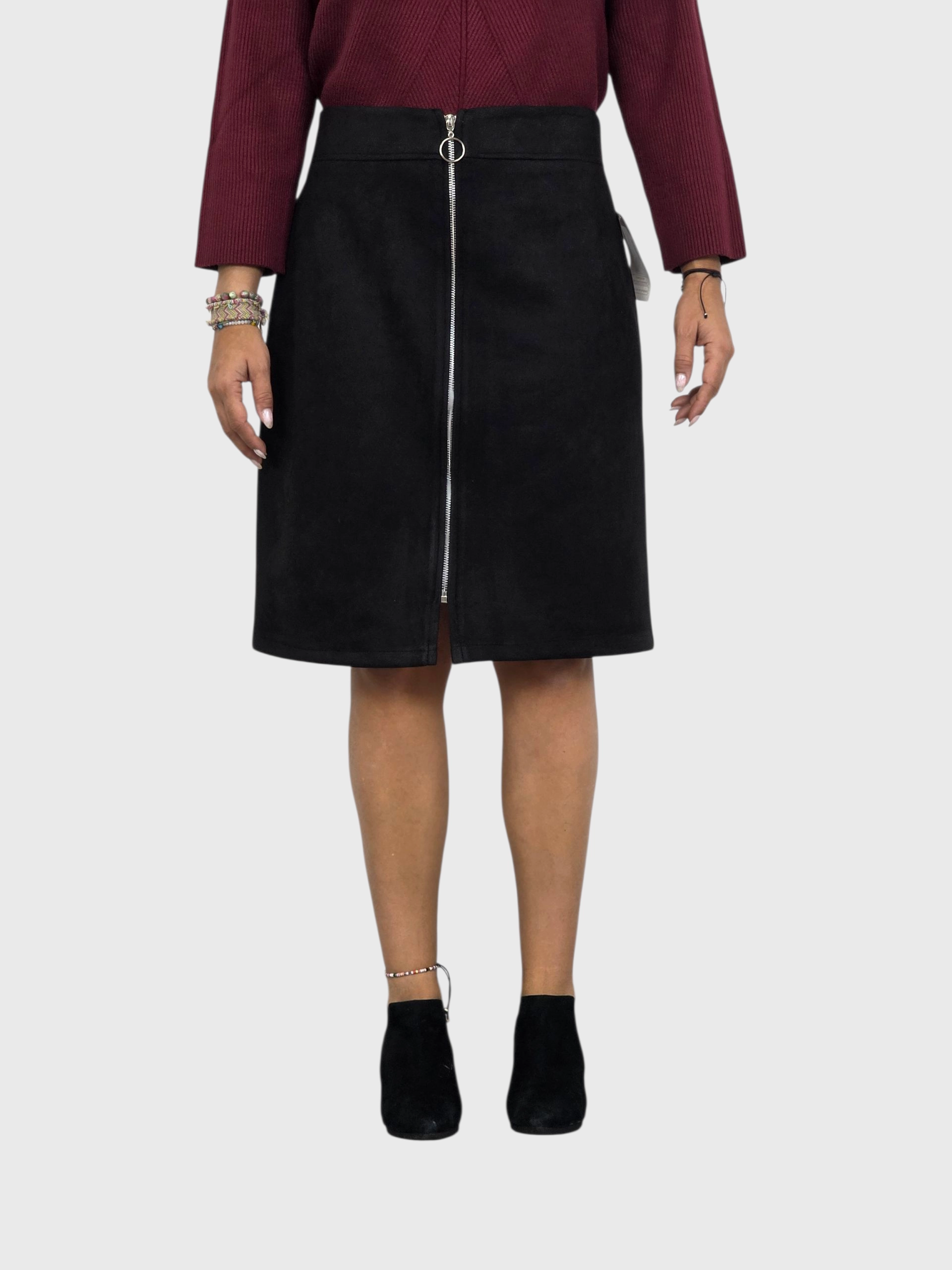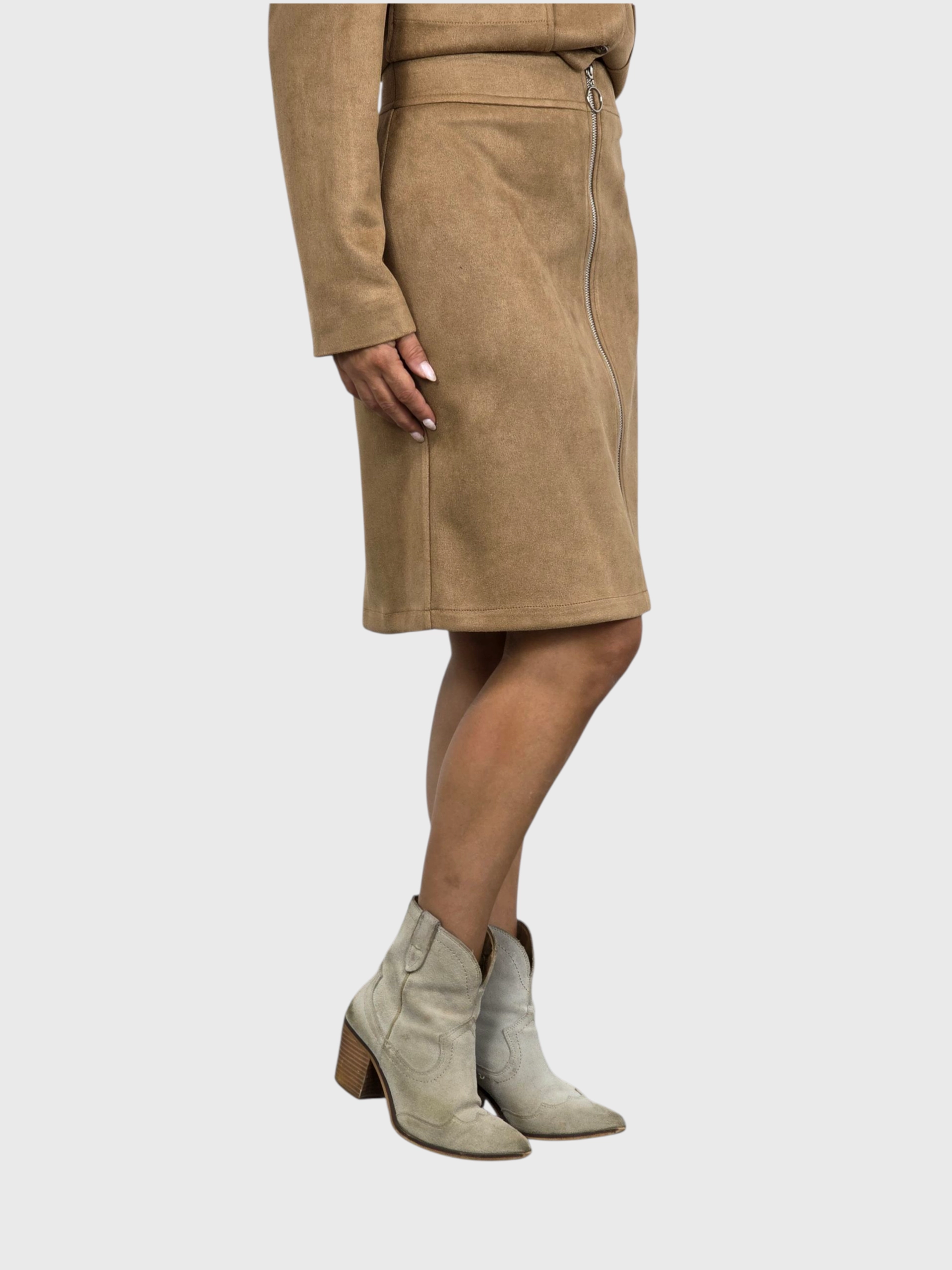 Falda corta de antelina con cremallera delantera. A juego con una chaqueta. Disponible en negro y camel.