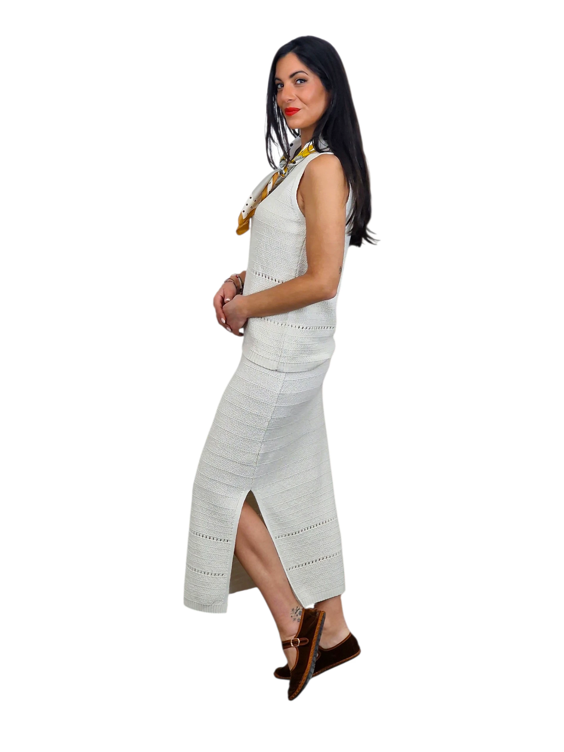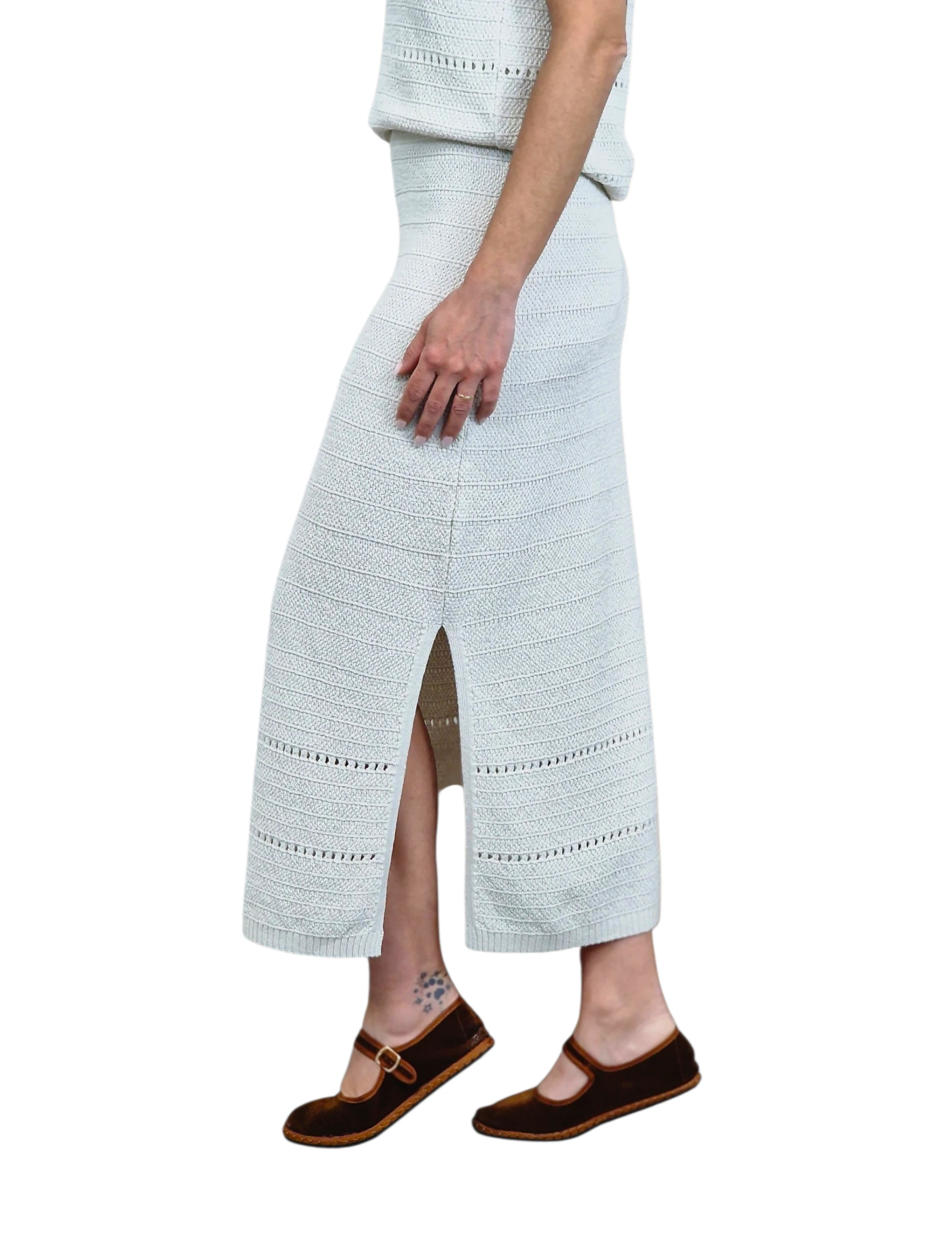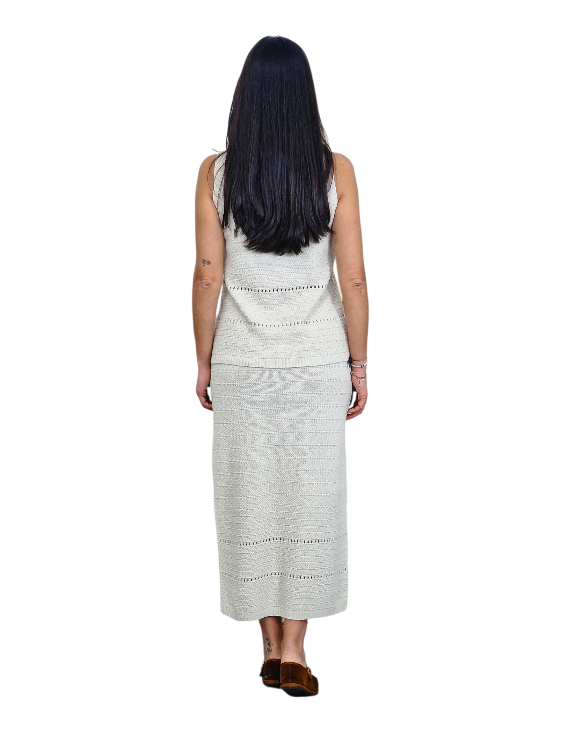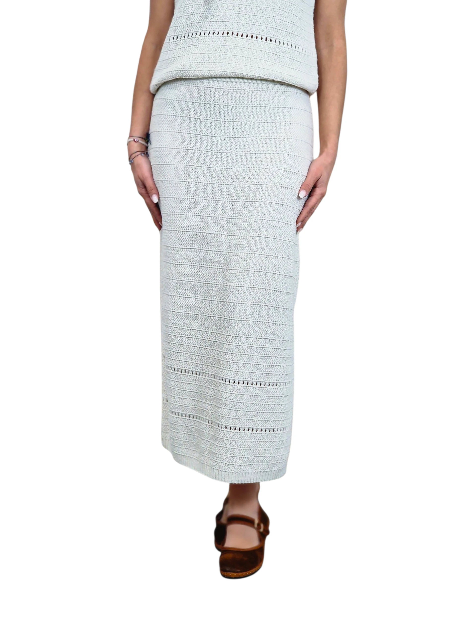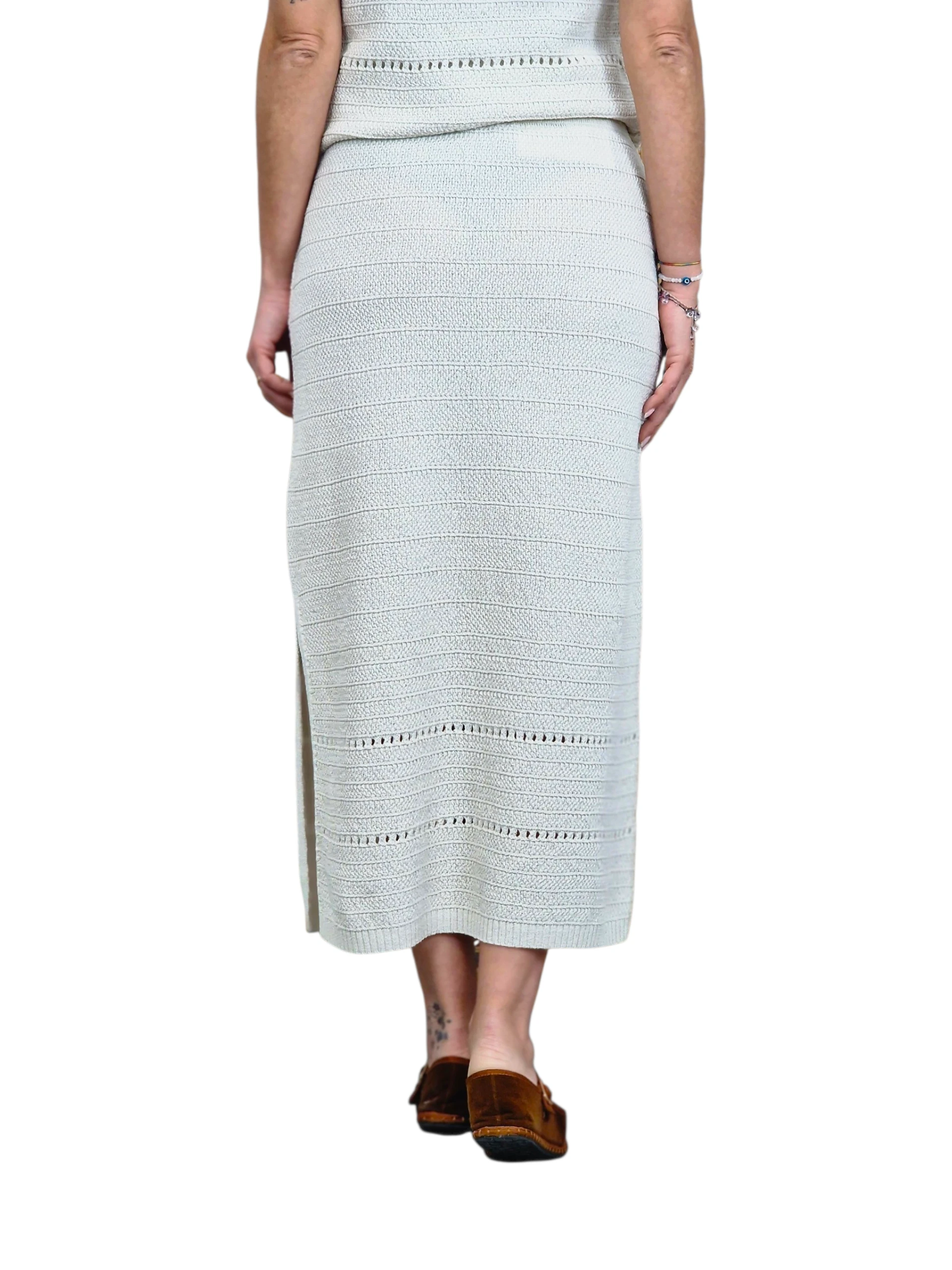 Falda de punto midi, con cintura de goma, abertura lateral y perforados. Disponible en verde kaki y en arena