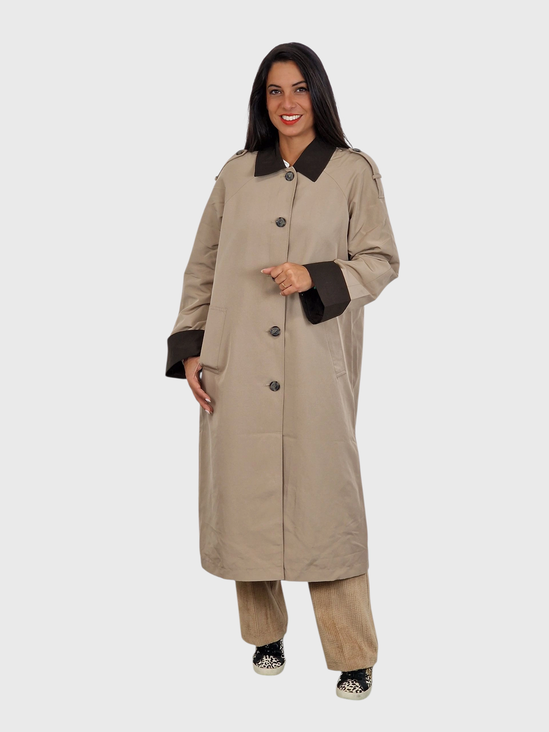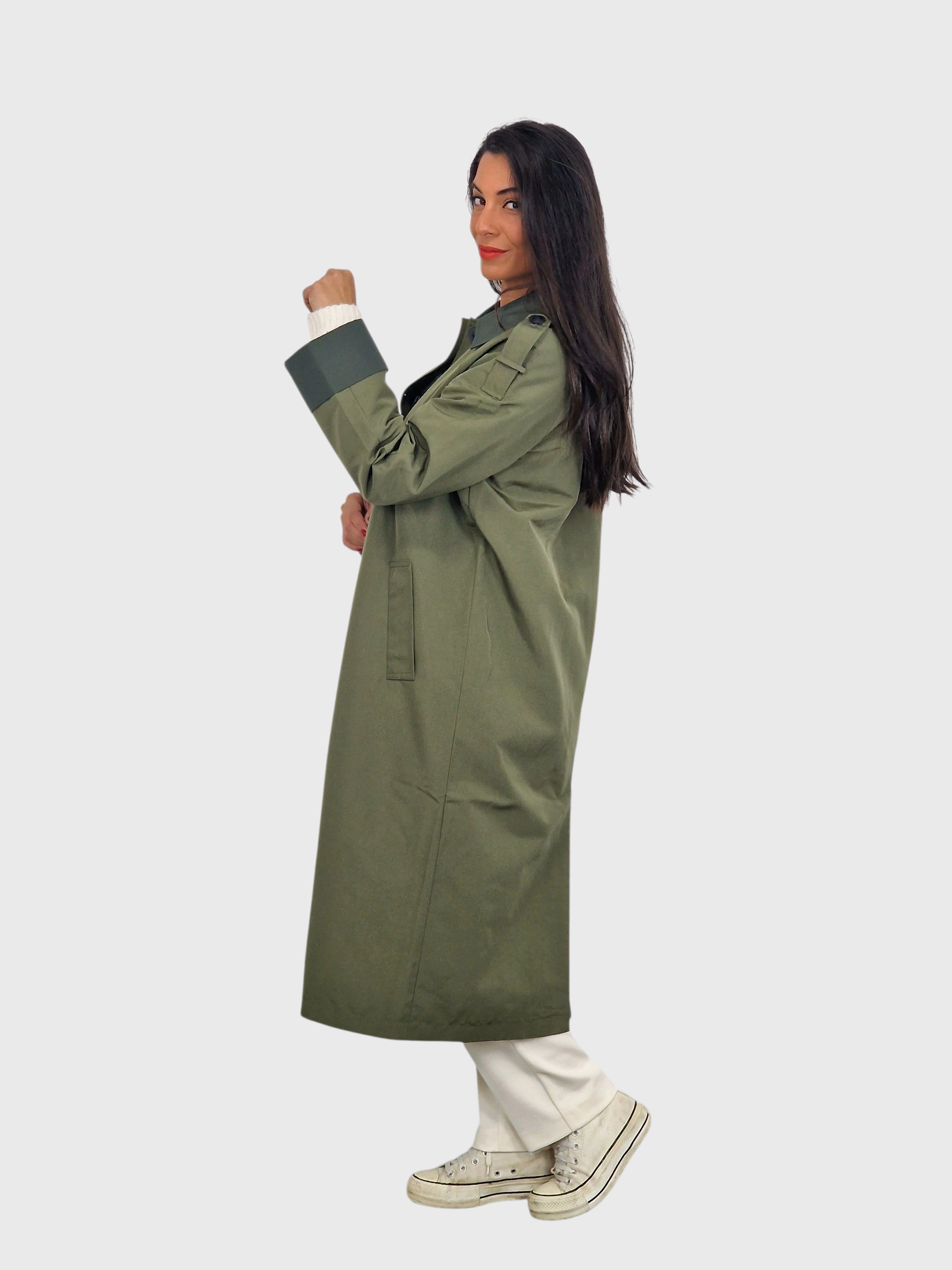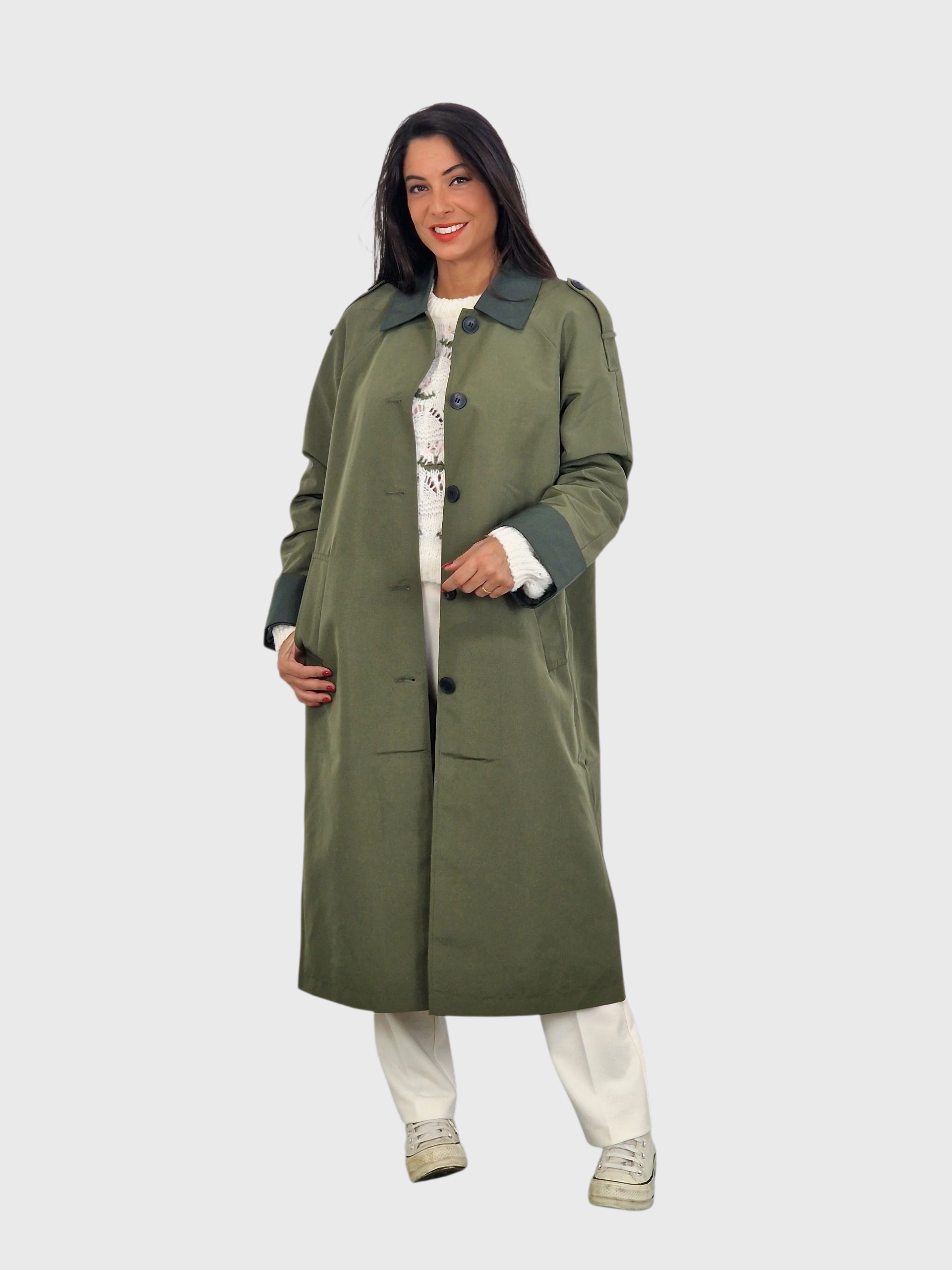 Gabardina larga, cierre con botones, cuello camisero, bolsillos y puños y cuellos en un tono diferente al cuerpo. Disponible en verde kaki, piedra y tabaco.