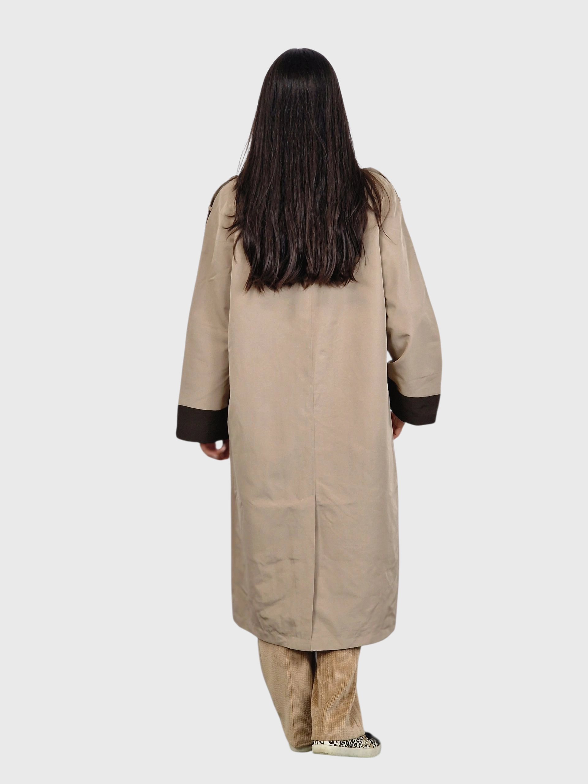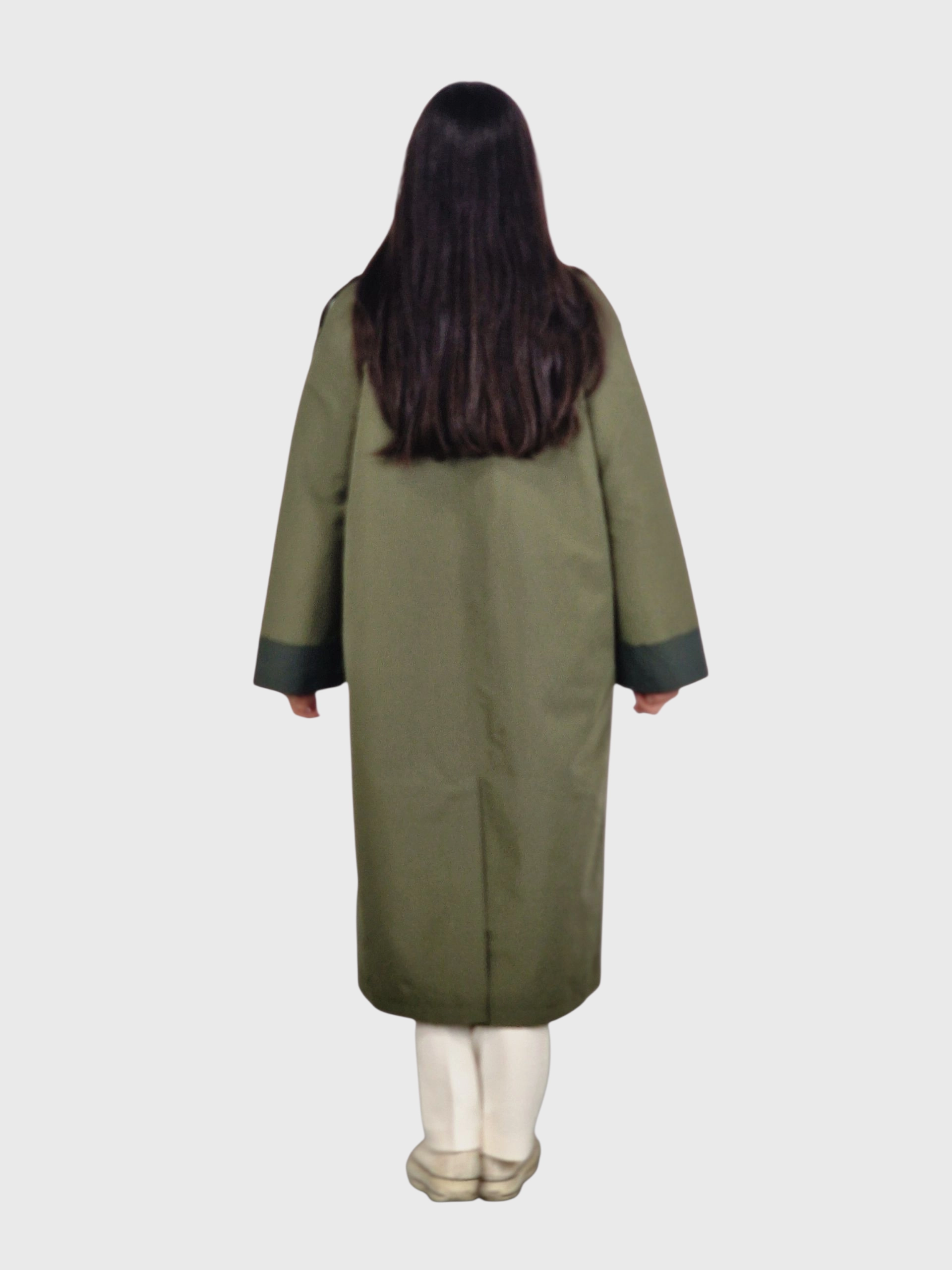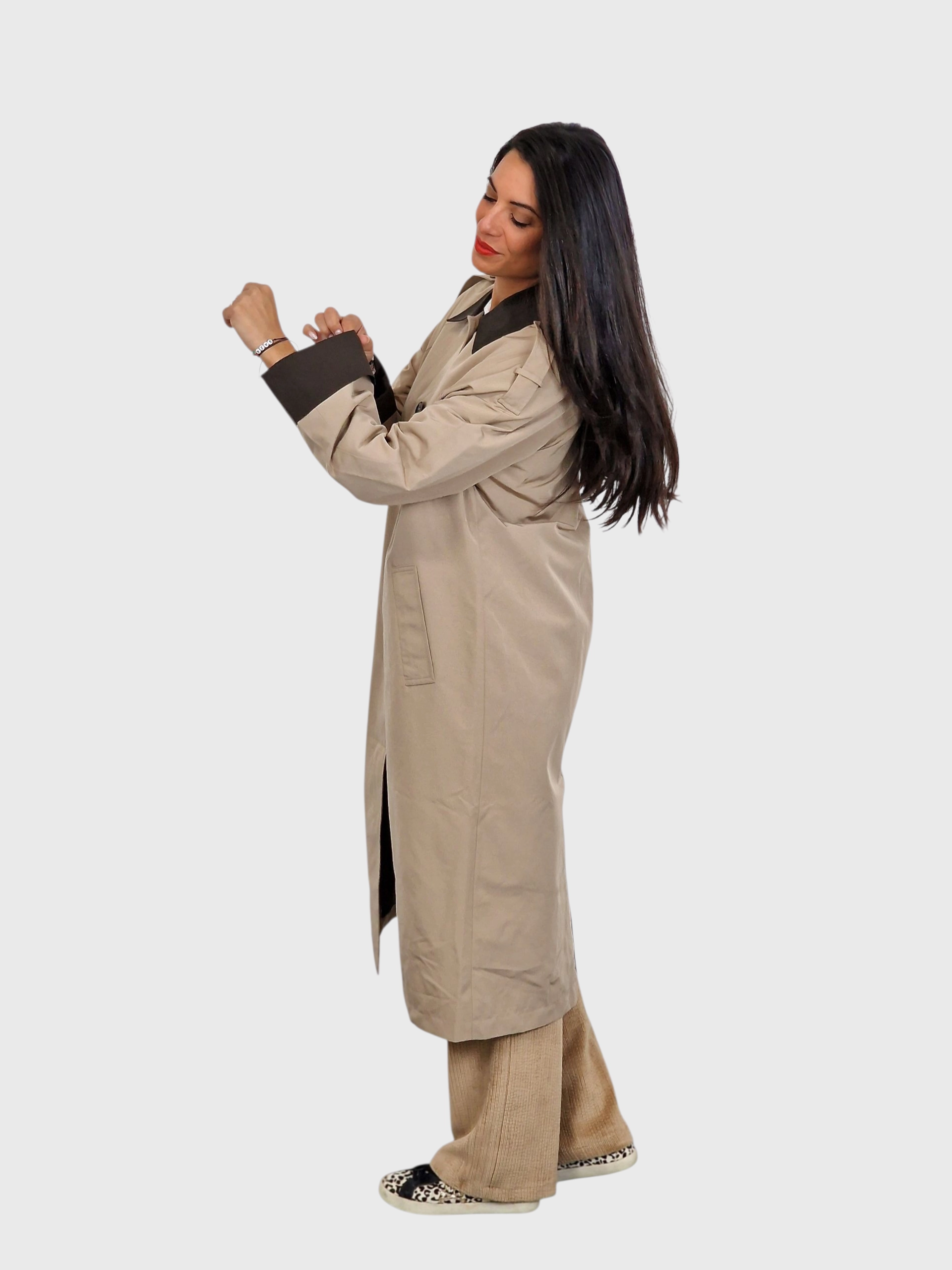 Gabardina larga, cierre con botones, cuello camisero, bolsillos y puños y cuellos en un tono diferente al cuerpo. Disponible en verde kaki, piedra y tabaco.