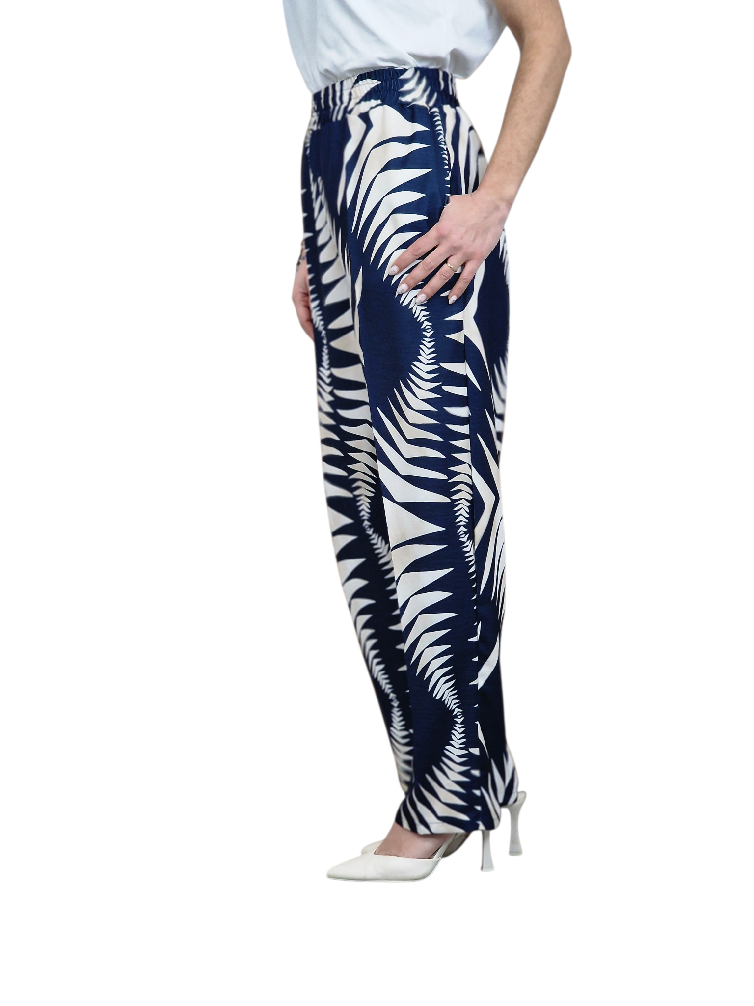 Pantalón con cintura de goma en tejido de gasa estampado. Disponible en marino, verde kaki y marrón.