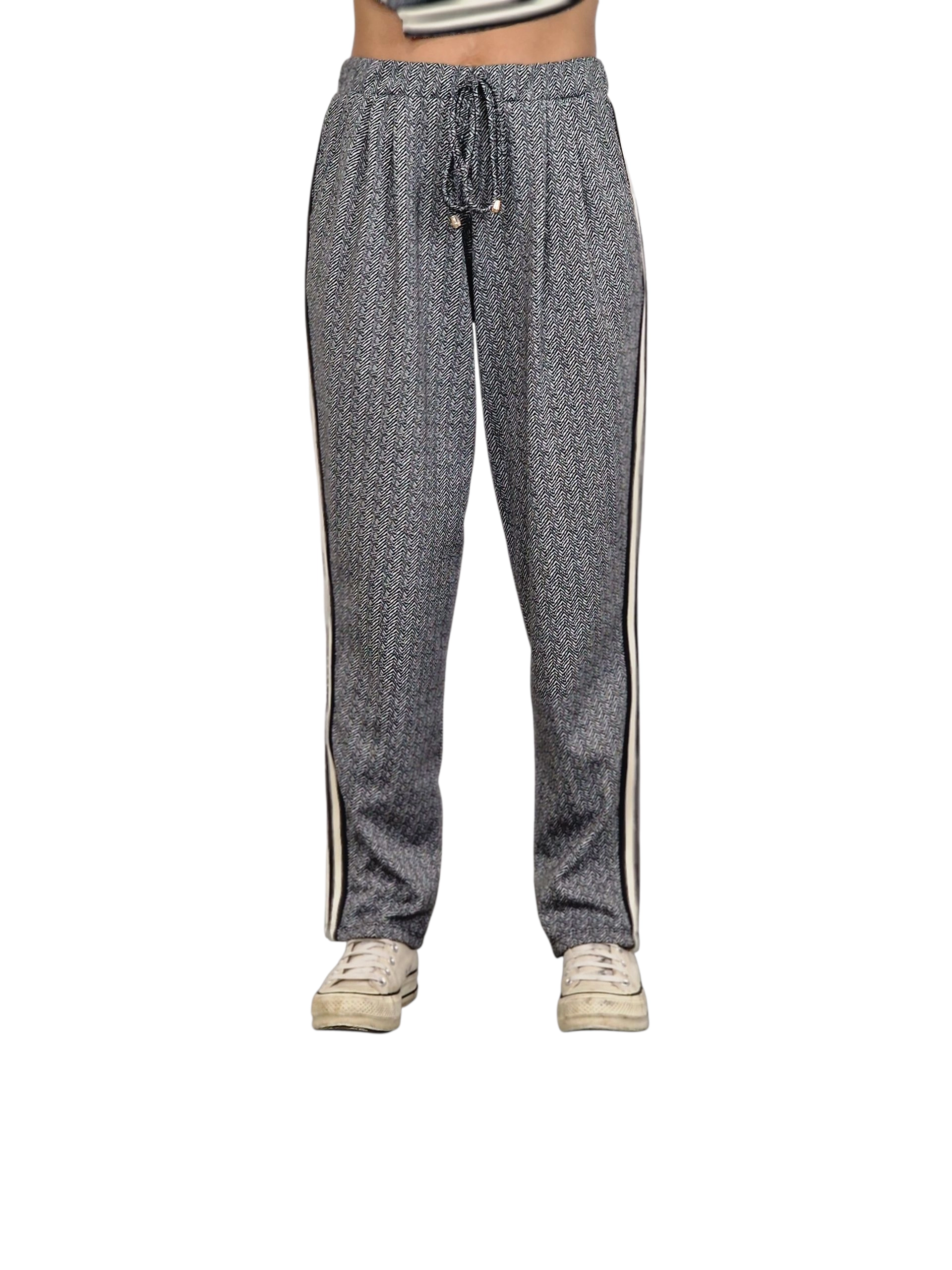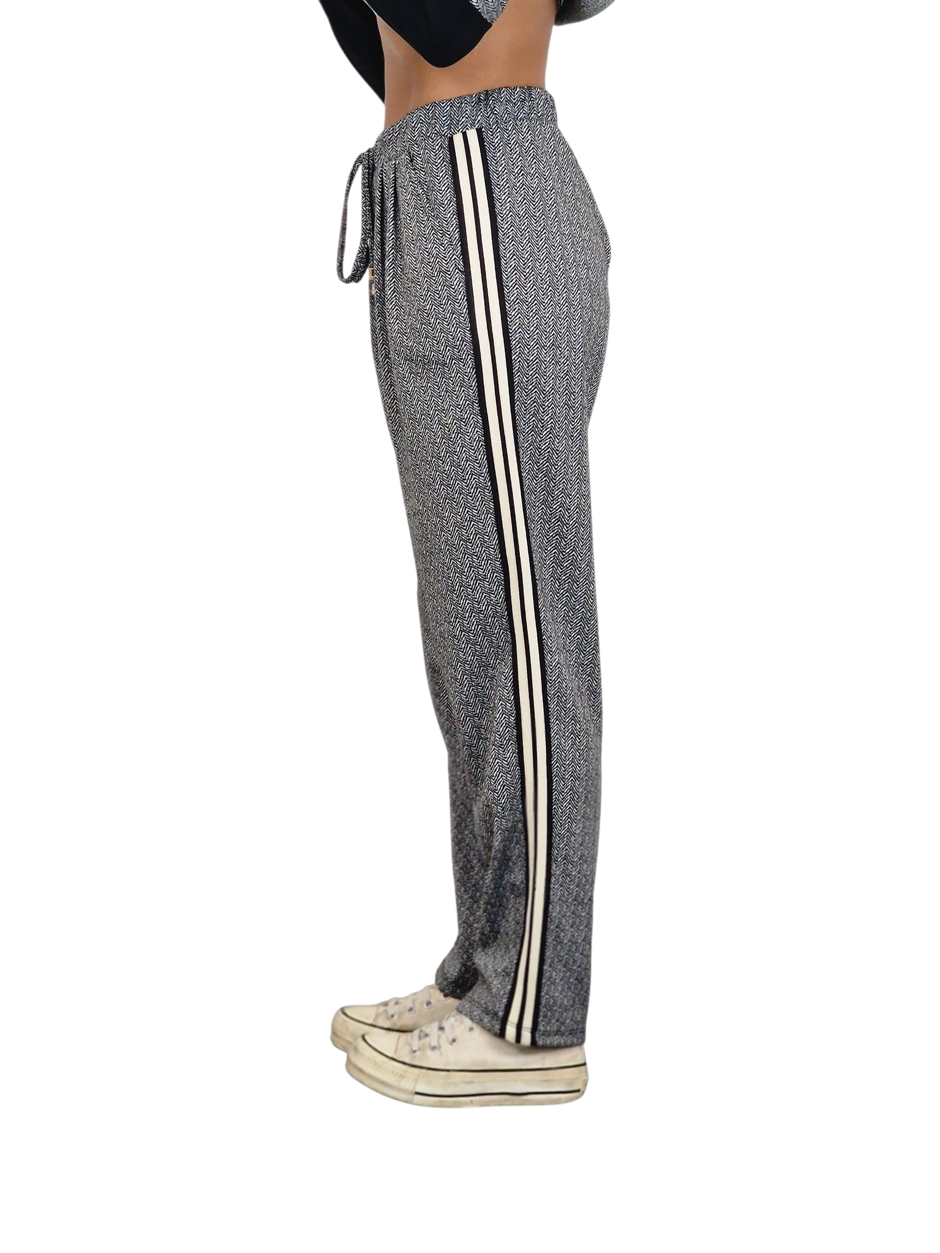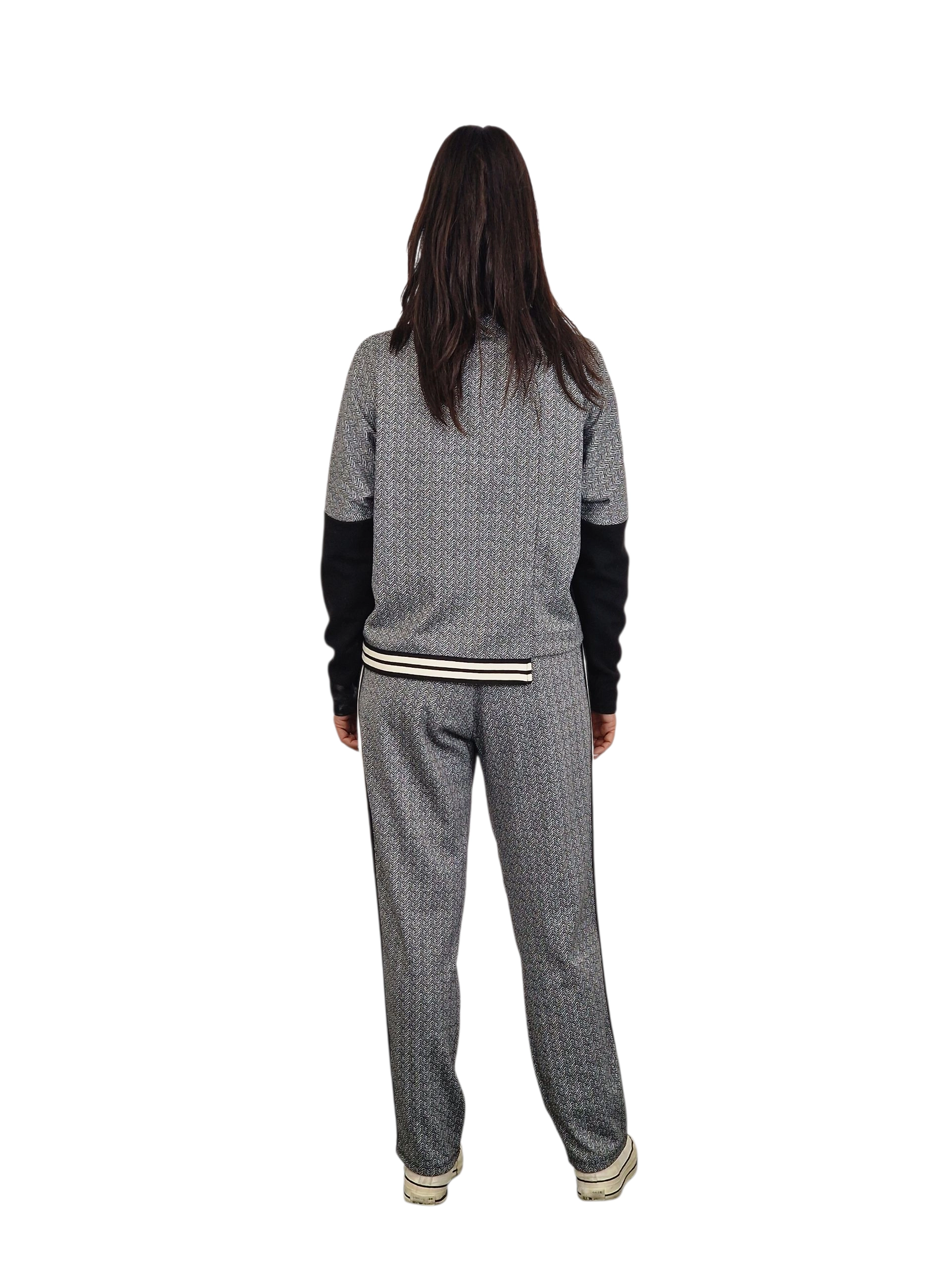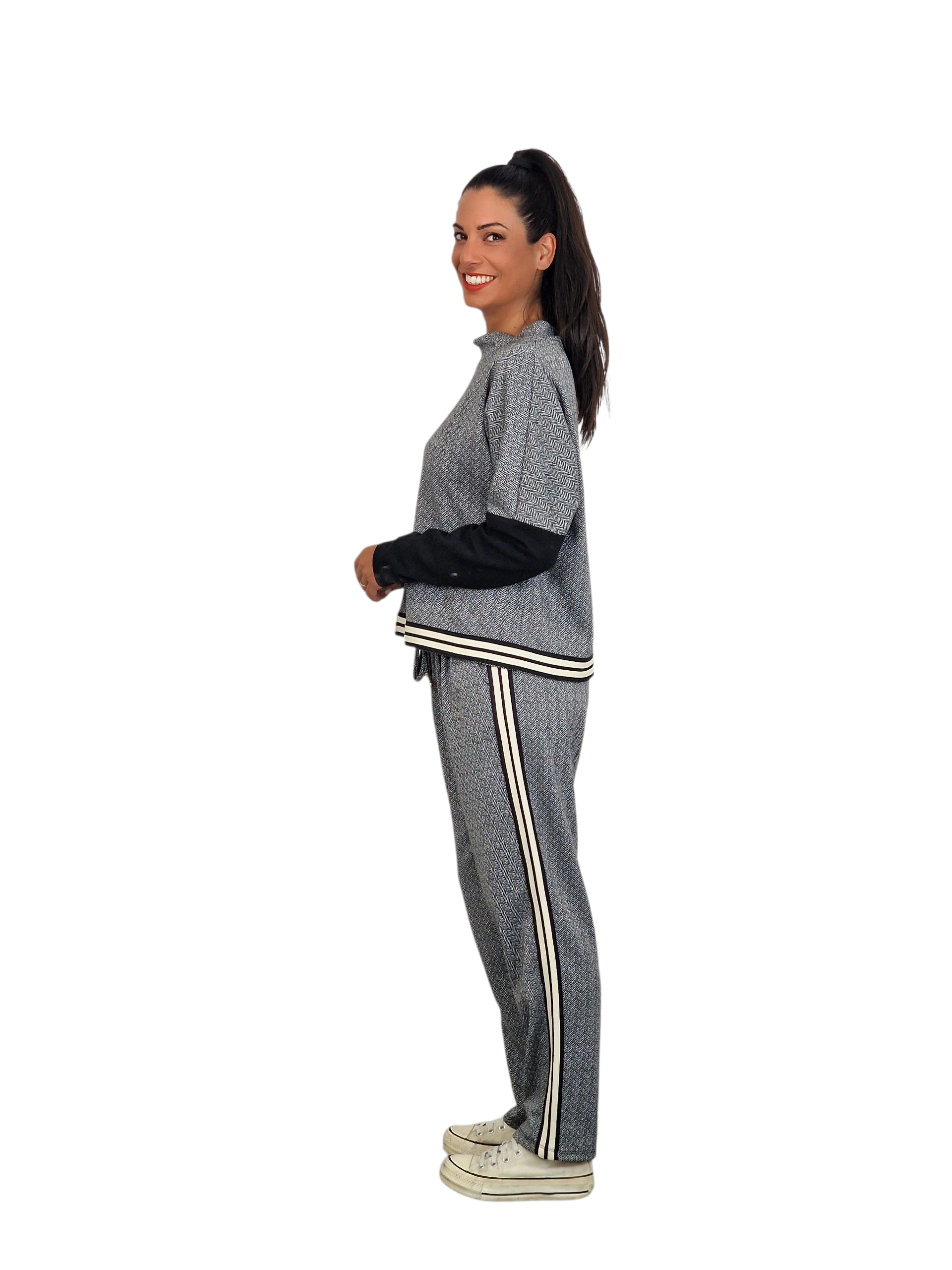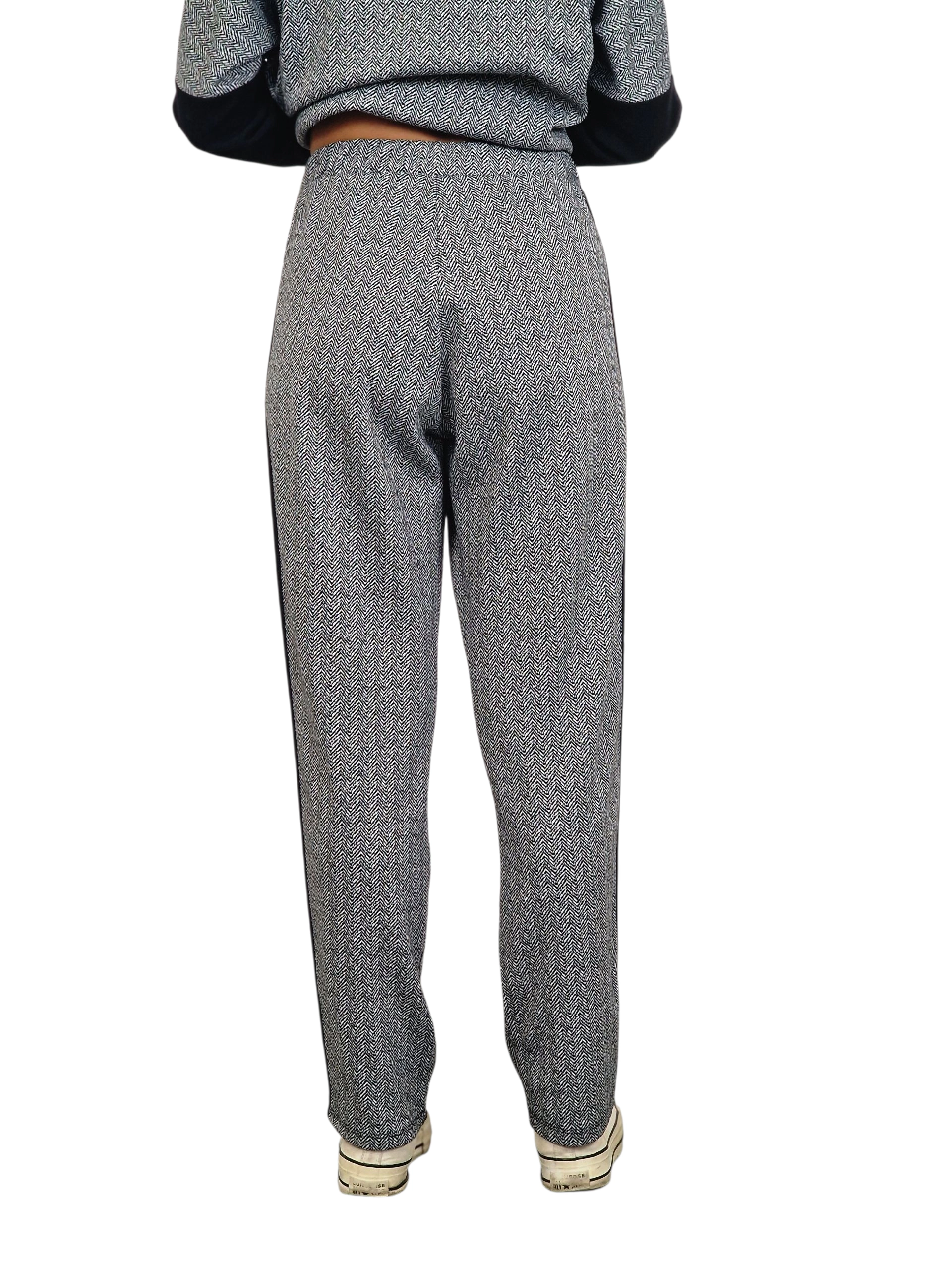 Pantalón de chandal jaspeado en negro, gris y blanco, con cordón en la cintura y franja con fondo blanco y tres líneas en negro en los laterales. A juego con sudadera con ref. O 90372