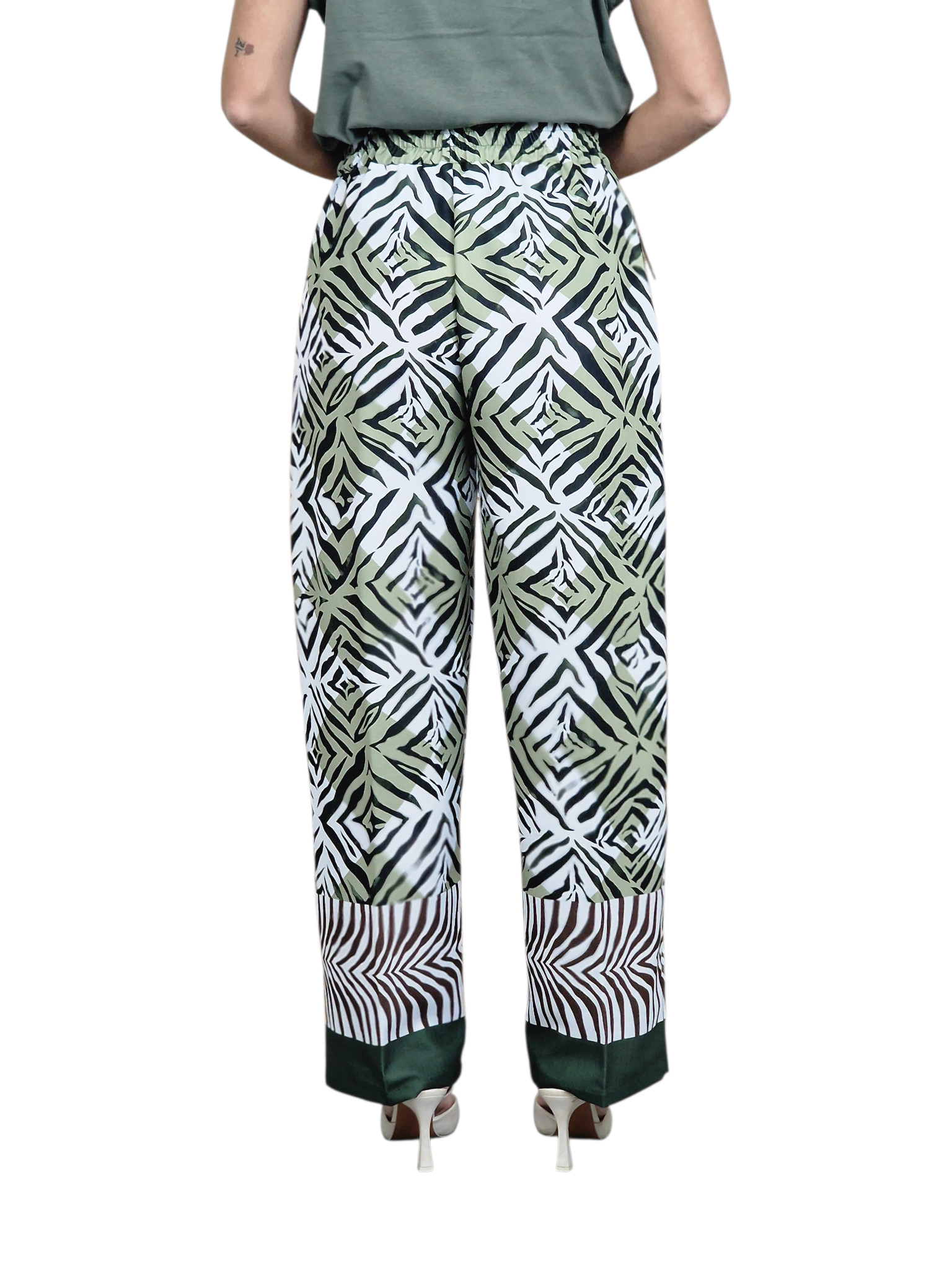 Pantalón de tiro alto con cintura de goma por la parte posterior. En tejido de gasa estampado. Disponible en verde kaki y en marrón.