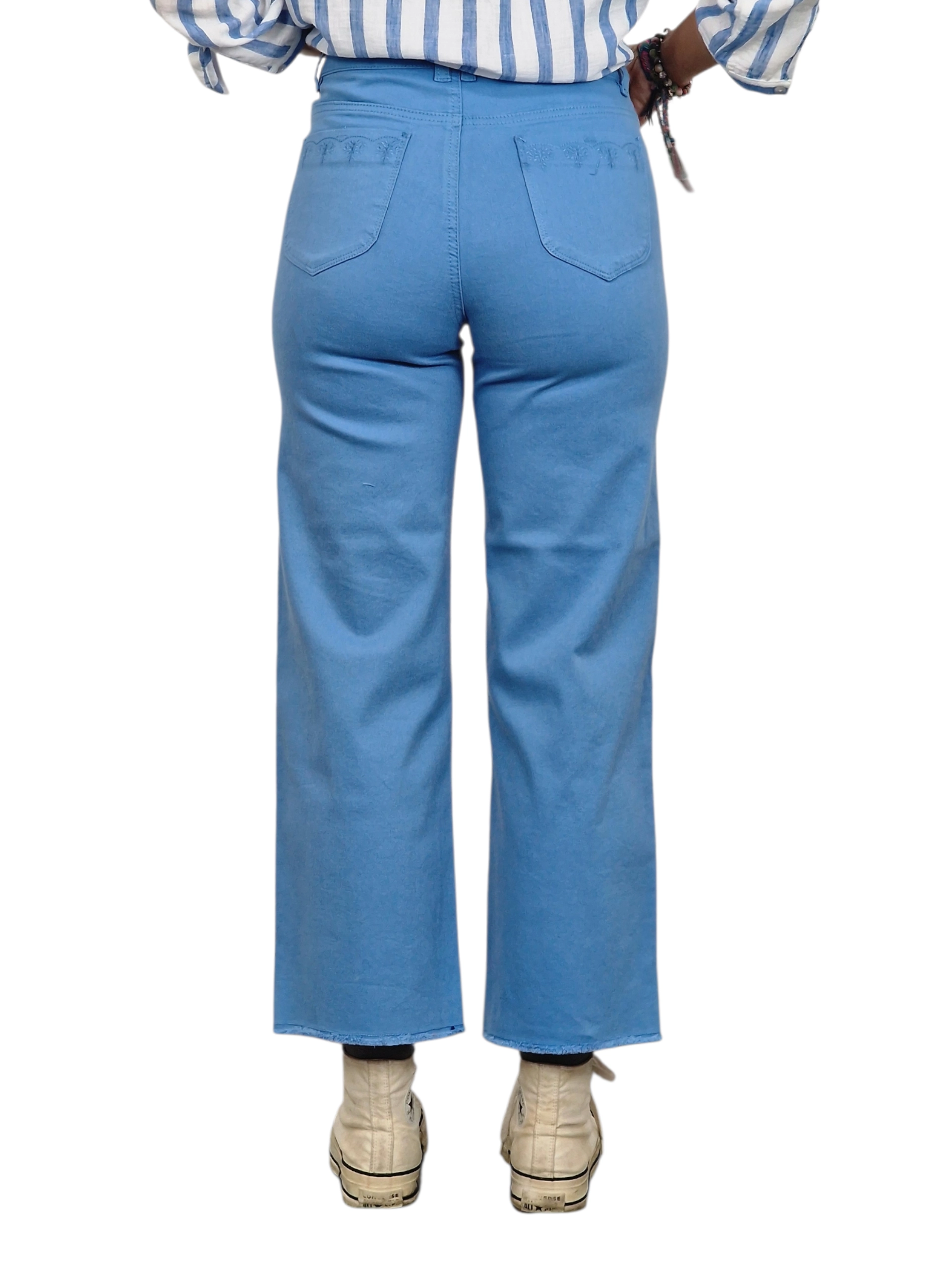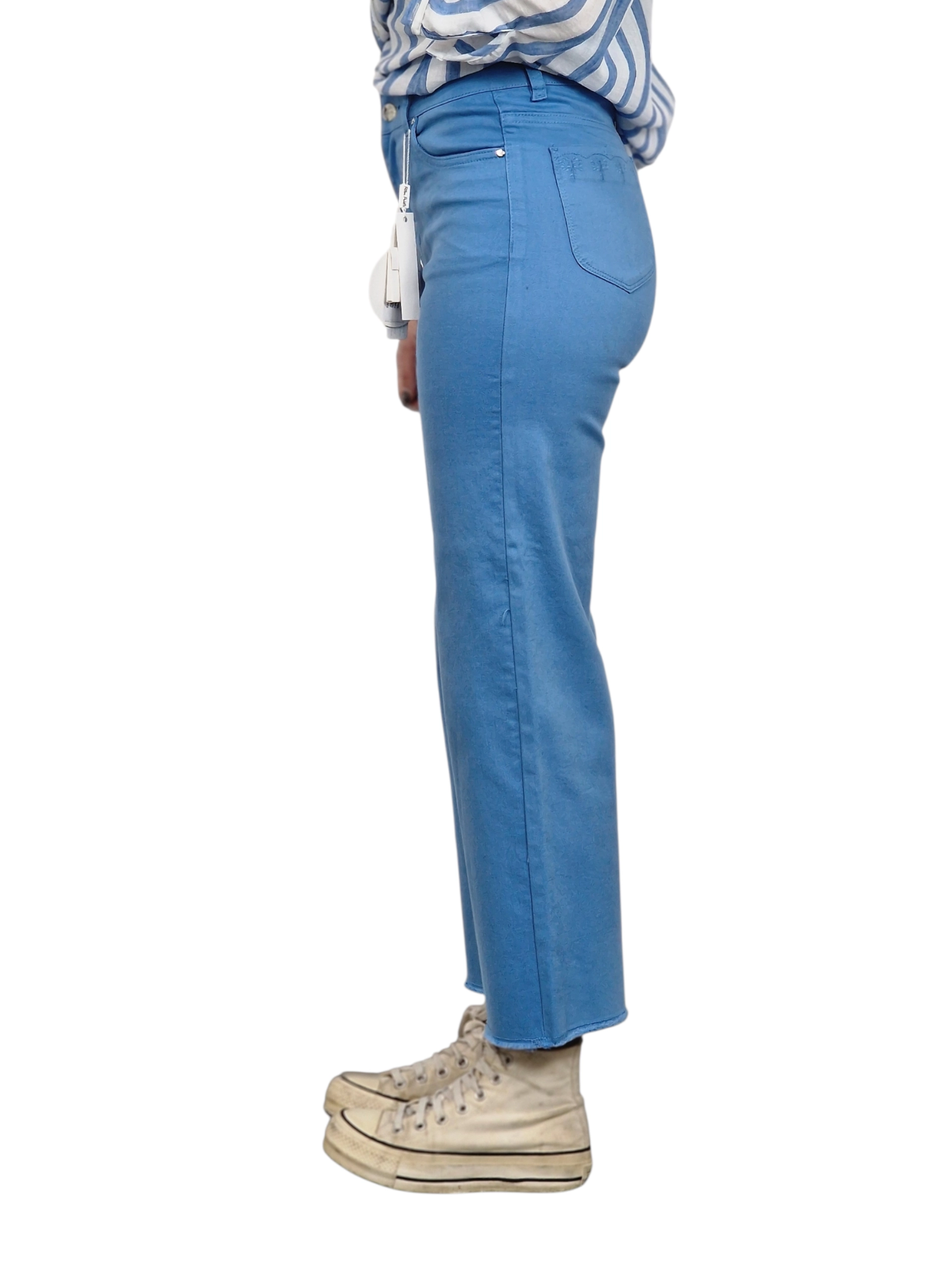 Pantalón vaquero corte culotte. Disponible en turquesa y en blanco.