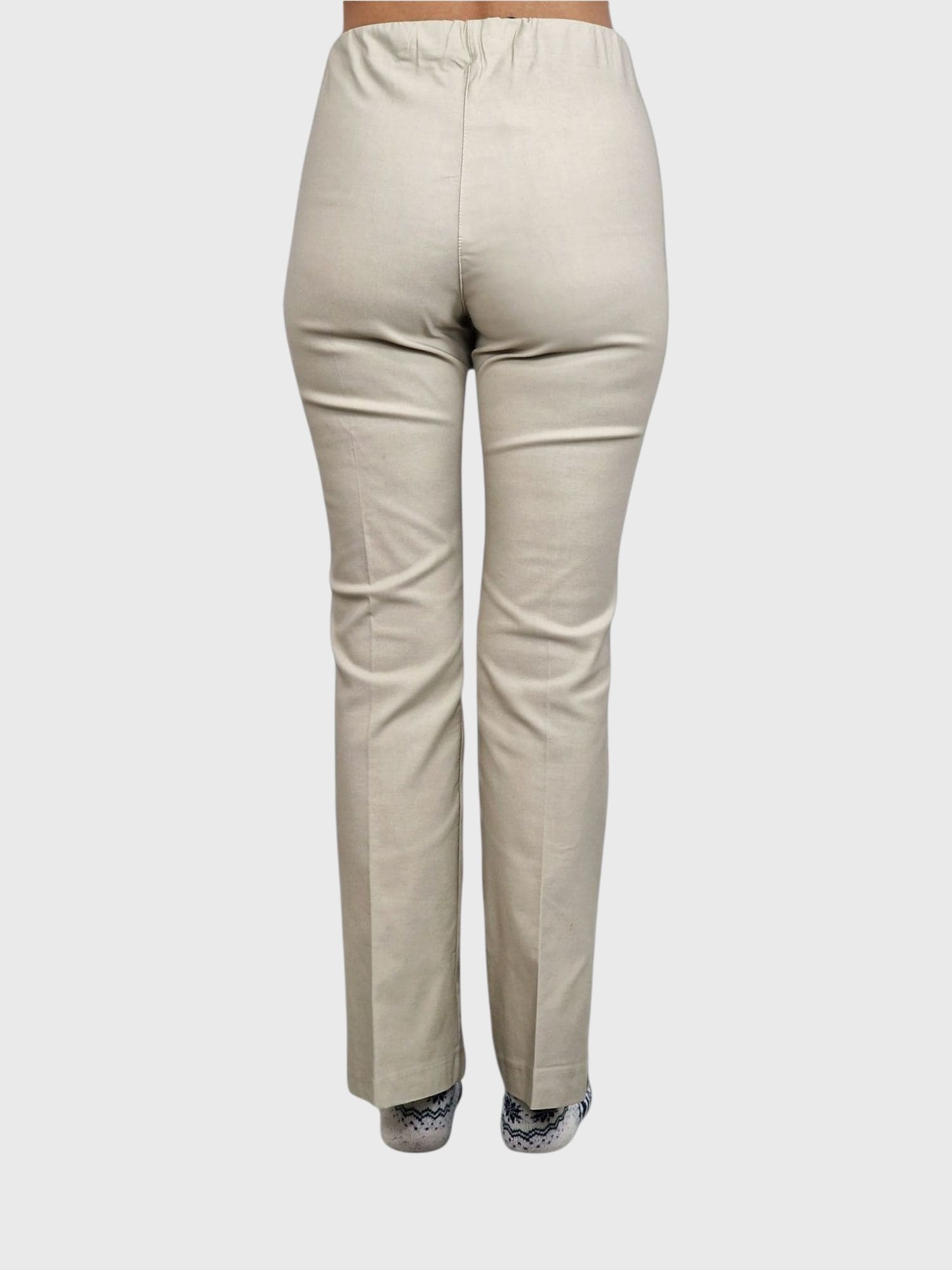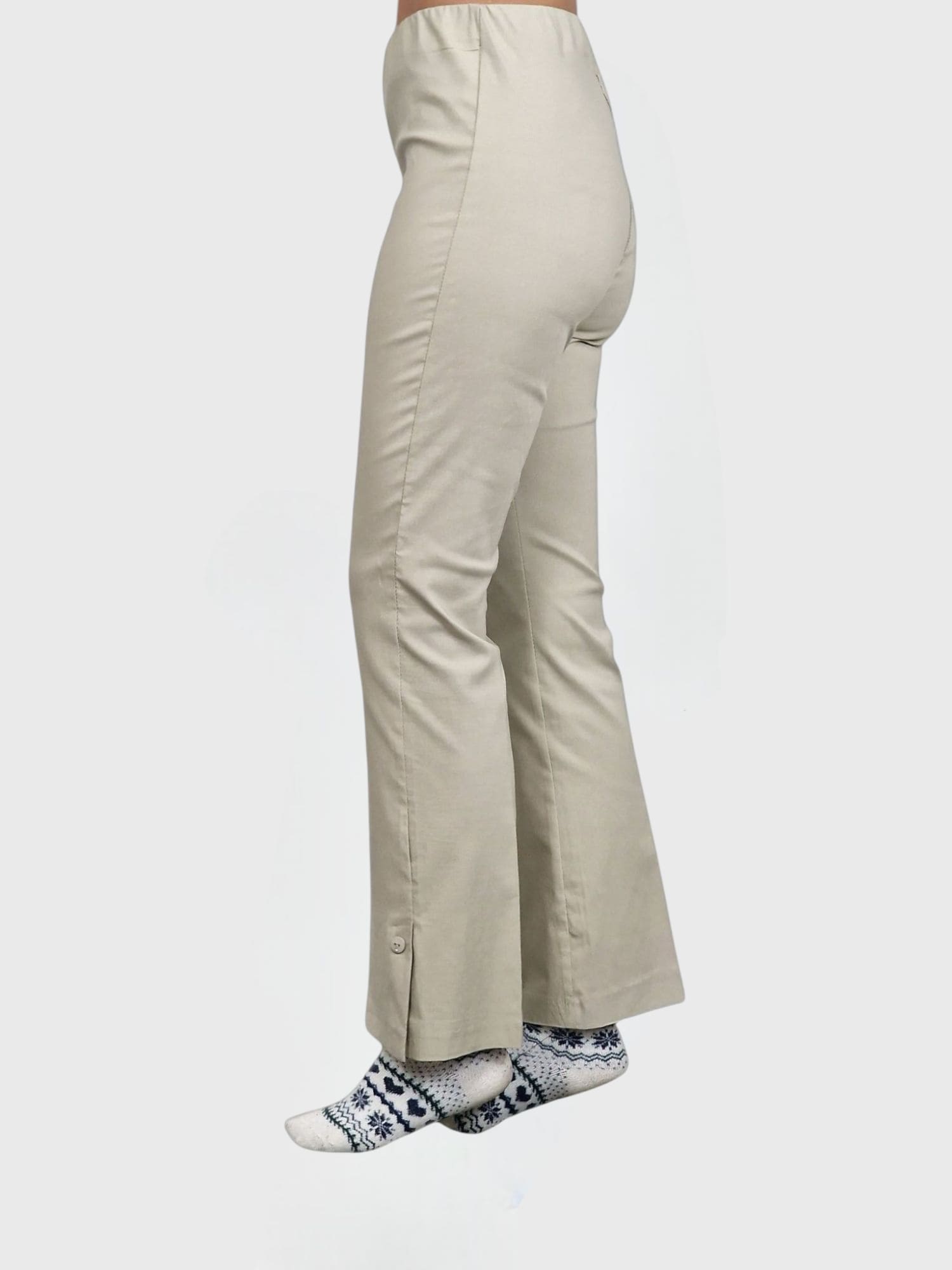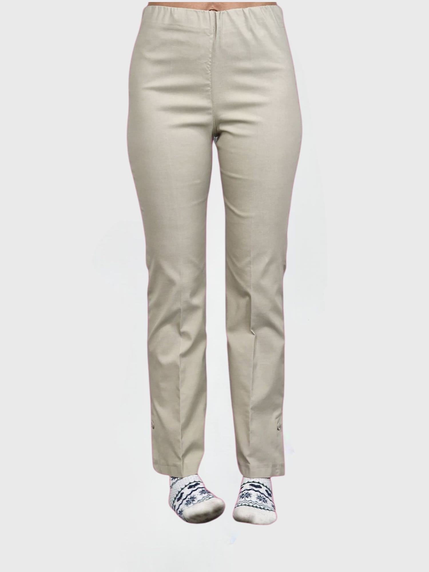 Pantalón recto con cintura alta y elástica. Disponible en negro, verde kaki y arena.