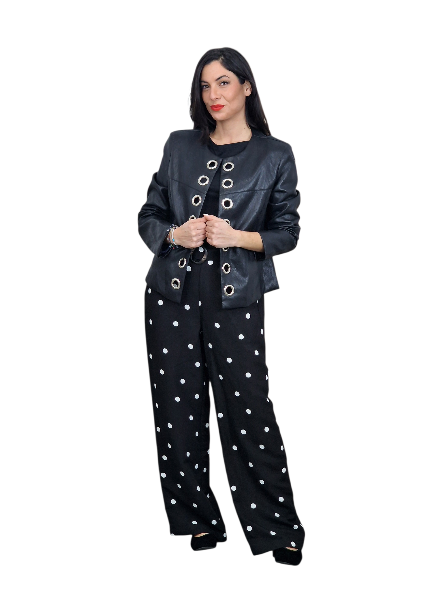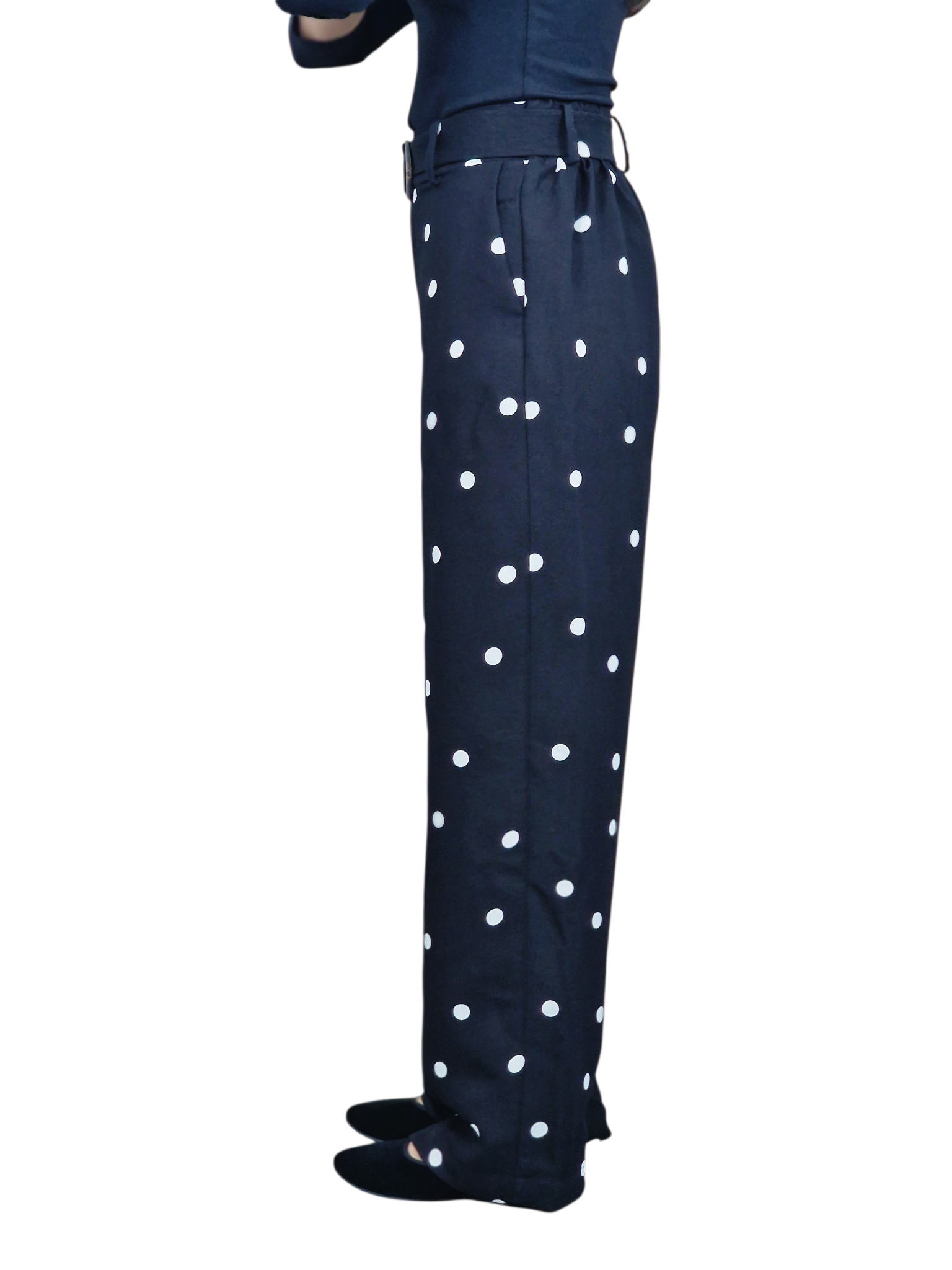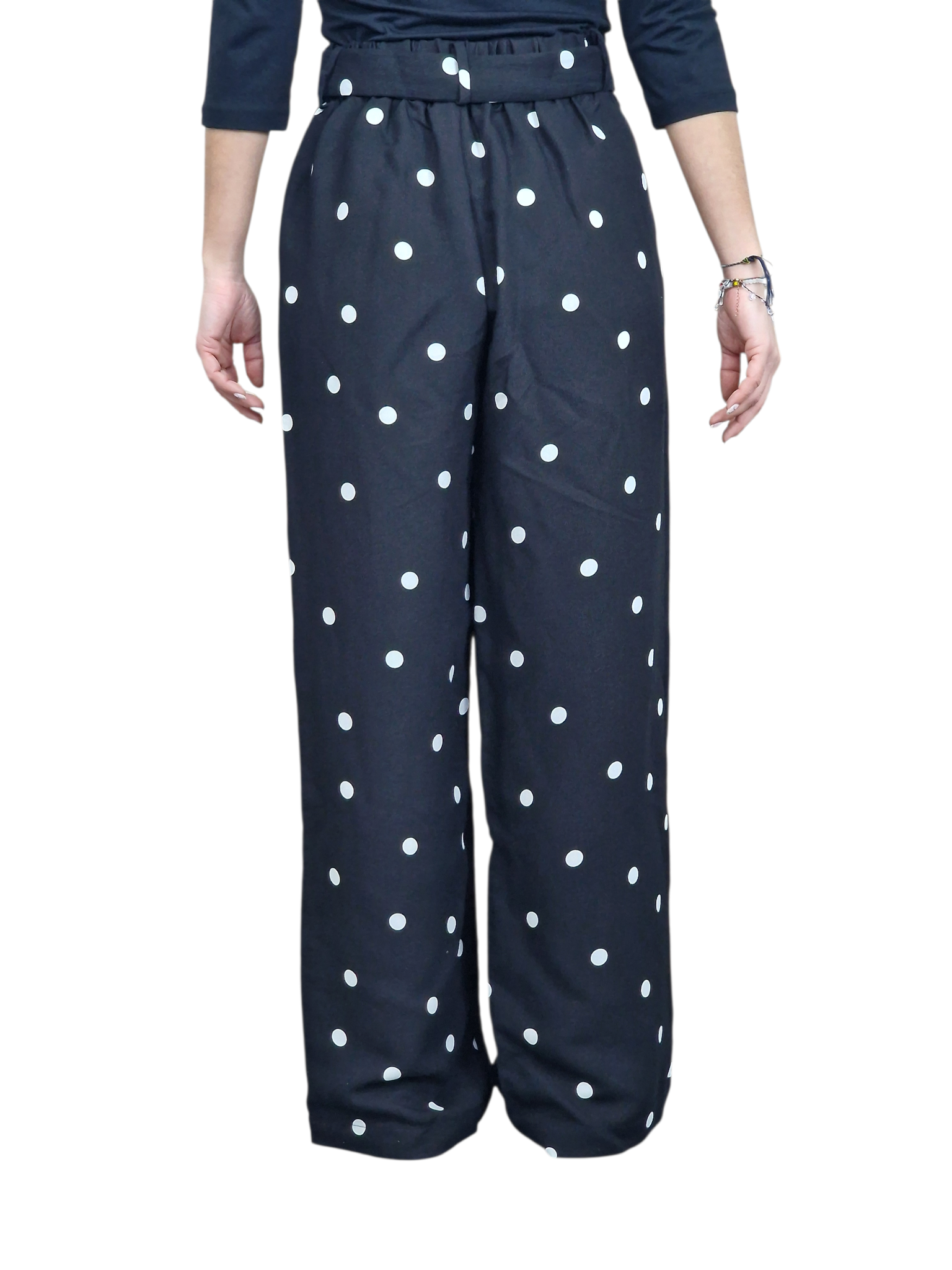 Panatlón palazzo con topos, y cinturón con hebilla para ajustarlo en la cintura. Disponible en fondo negro y arena con los topos en crema.