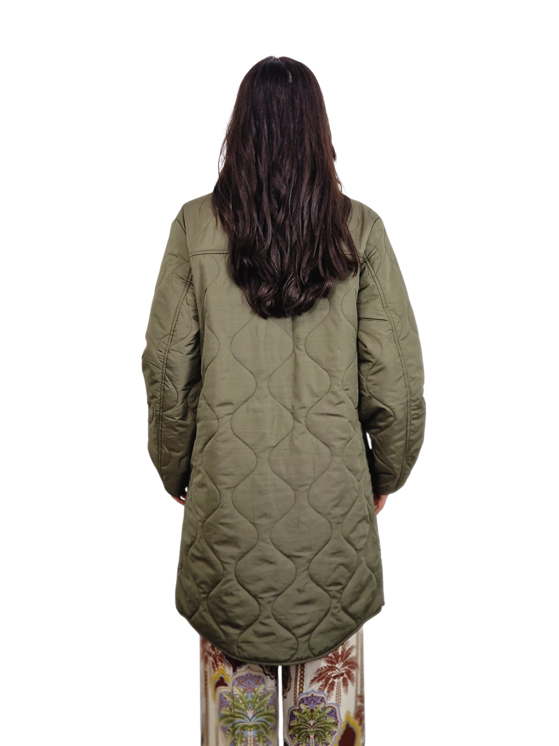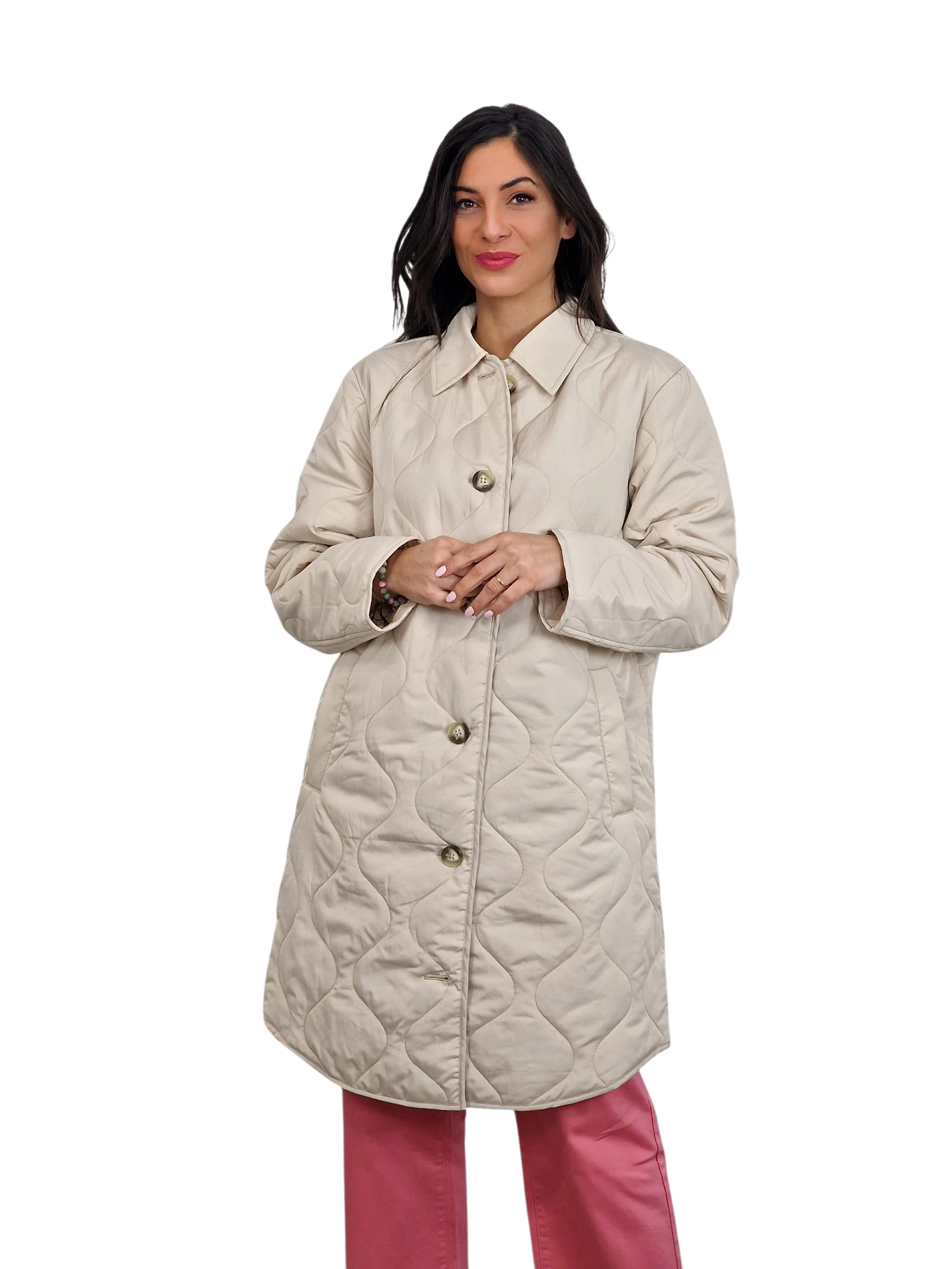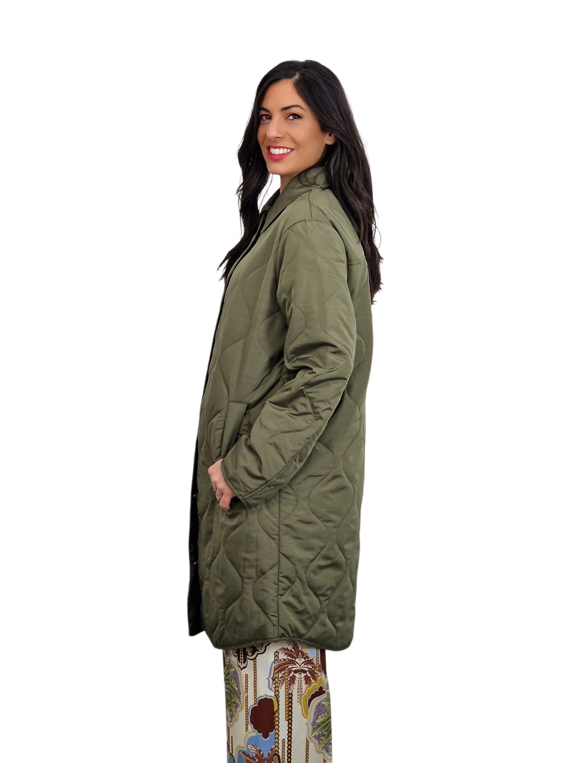 Parka larga acolchada con cuello camiseros y abotonada. Disponible en verde kaki y en beige claro.