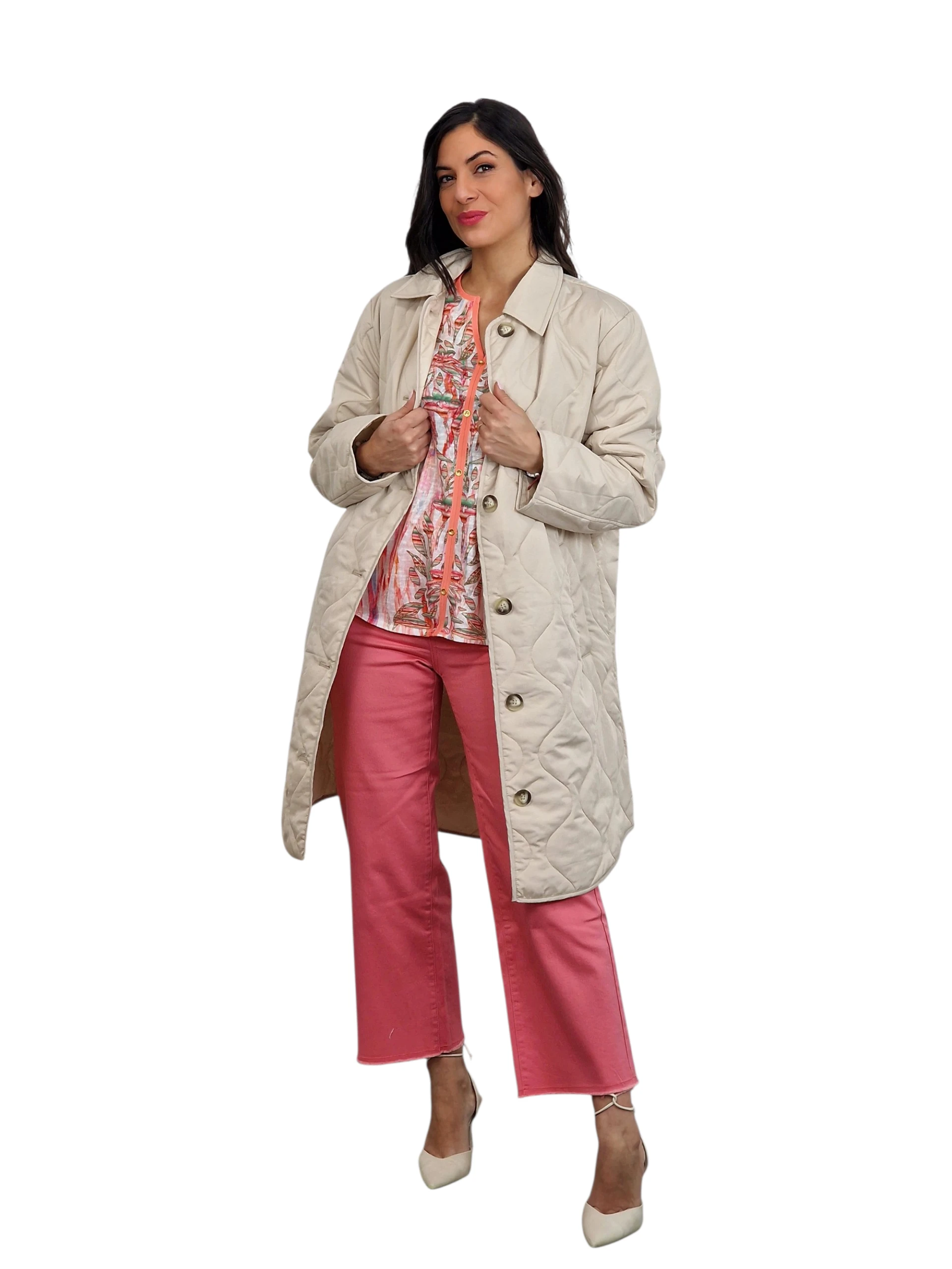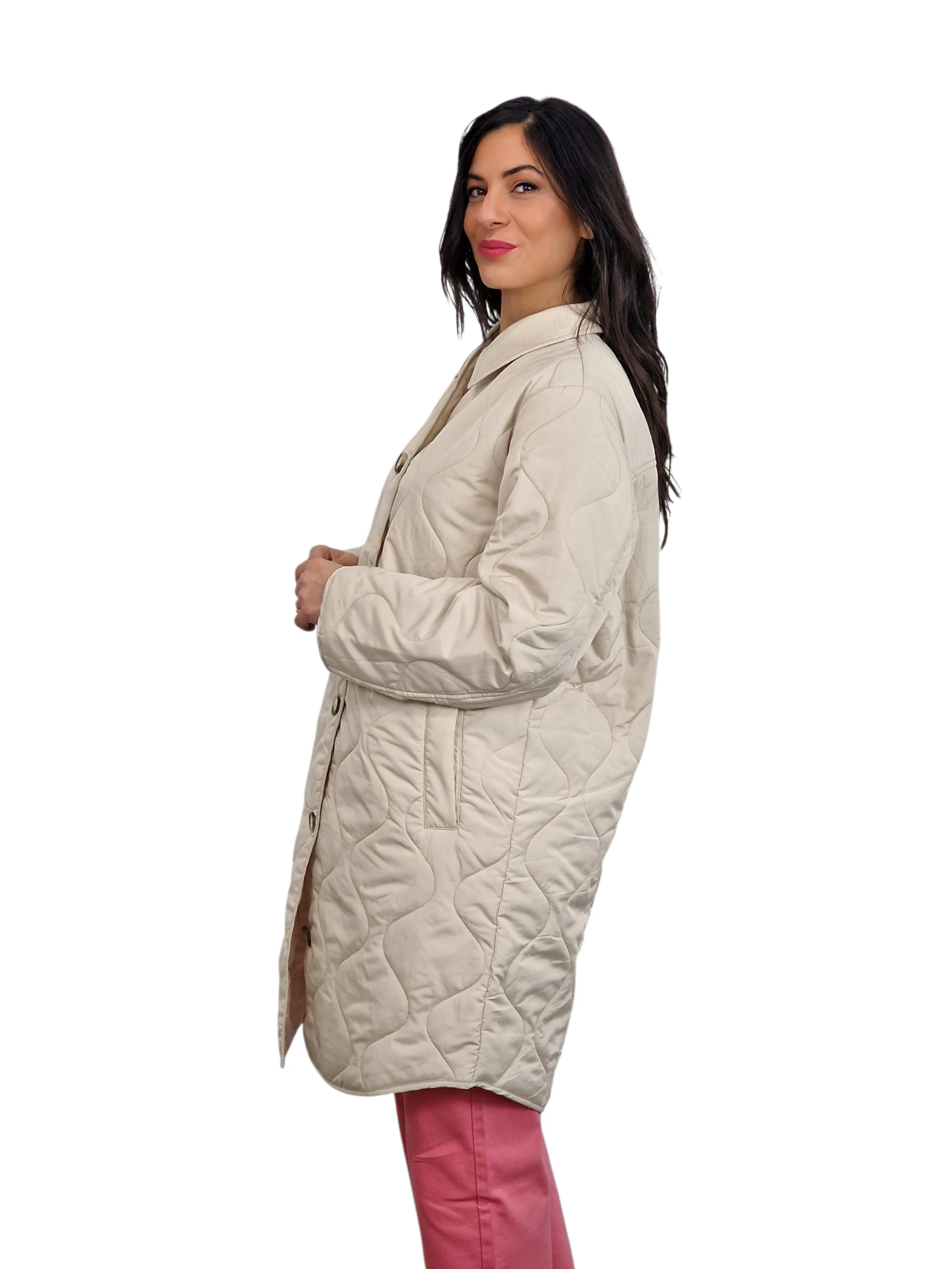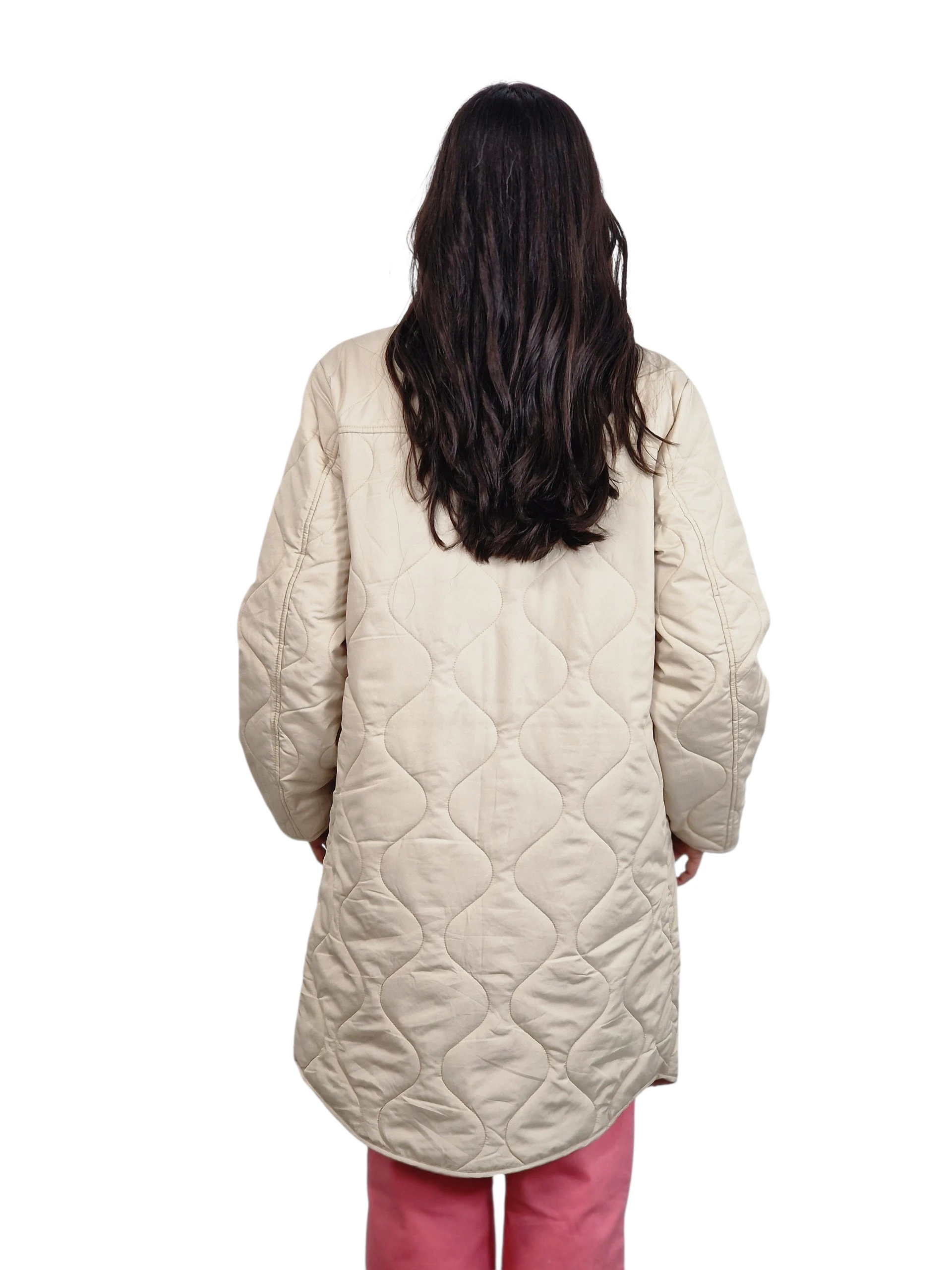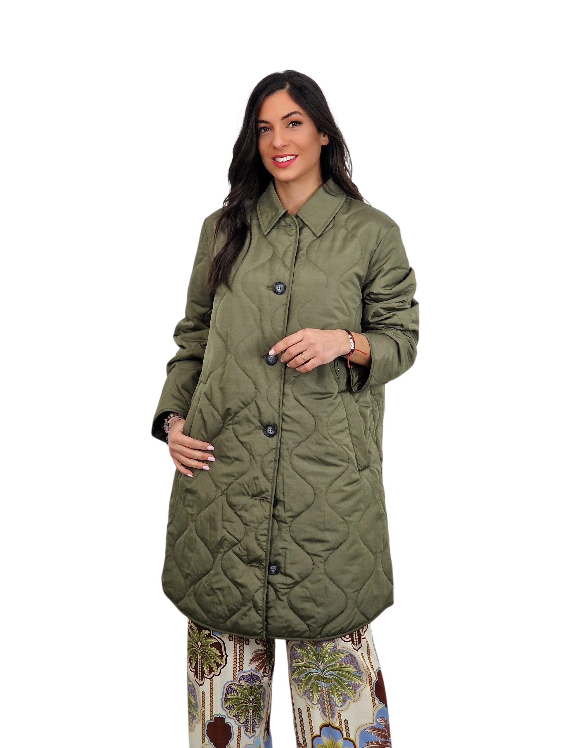Parka larga acolchada con cuello camiseros y abotonada. Disponible en verde kaki y en beige claro.